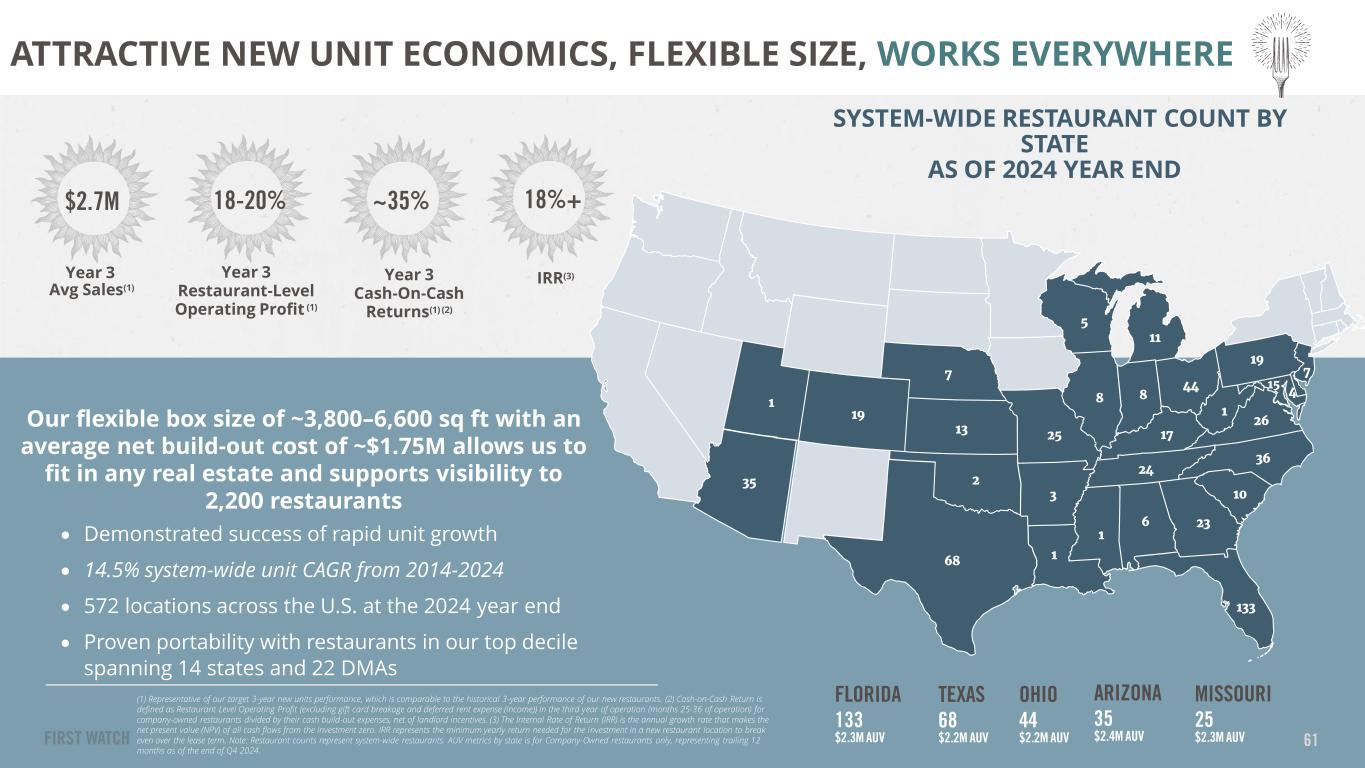 SYSTEM-WIDE RESTAURANT COUNT BY STATE AS OF 2024 YEAR END ® Our flexible box size of ~3,800–6,600 sq ft with an average net build-out cost of ~$1.75M allows us to fit in any real estate and supports visibility to 2,200 restaurants (1) Representative of our target 3-year new units performance, which is comparable to the historical 3-year performance of our new restaurants. (2) Cash-on-Cash Return is defined as Restaurant Level Operating Profit (excluding gift card breakage and deferred rent expense (income)) in the third year of operation (months 25-36 of operation) for company-owned restaurants divided by their cash build-out expenses, net of landlord incentives. (3) The Internal Rate of Return (IRR) is the annual growth rate that makes the net present value (NPV) of all cash flows from the investment zero. IRR represents the minimum yearly return needed for the investment in a new restaurant location to break even over the lease term. Note: Restaurant counts represent system-wide restaurants. AUV metrics by state is for Company-Owned restaurants only, representing trailing 12 months as of the end of Q4 2024. 61 1 19 13 7 25 3 68 1 1 6 23 133 10 36 24 17 8 5 11 44 1 26 19 7 15 48 35 2 • Demonstrated success of rapid unit growth • 14.5% system-wide unit CAGR from 2014-2024 • 572 locations across the U.S. at the 2024 year end • Proven portability with restaurants in our top decile spanning 14 states and 22 DMAs $2.7M 18-20% ~35% 18%+ Year 3 Avg Sales(1) Year 3 Restaurant-Level Operating Profit (1) Year 3 Cash-On-Cash Returns(1) (2) IRR(3) ATTRACTIVE NEW UNIT ECONOMICS, FLEXIBLE SIZE, WORKS EVERYWHERE FLORIDA 133 $2.3M AUV OHIO 44 $2.2M AUV MISSOURI 25 $2.3M AUV ARIZONA 35 $2.4M AUV TEXAS 68 $2.2M AUV
