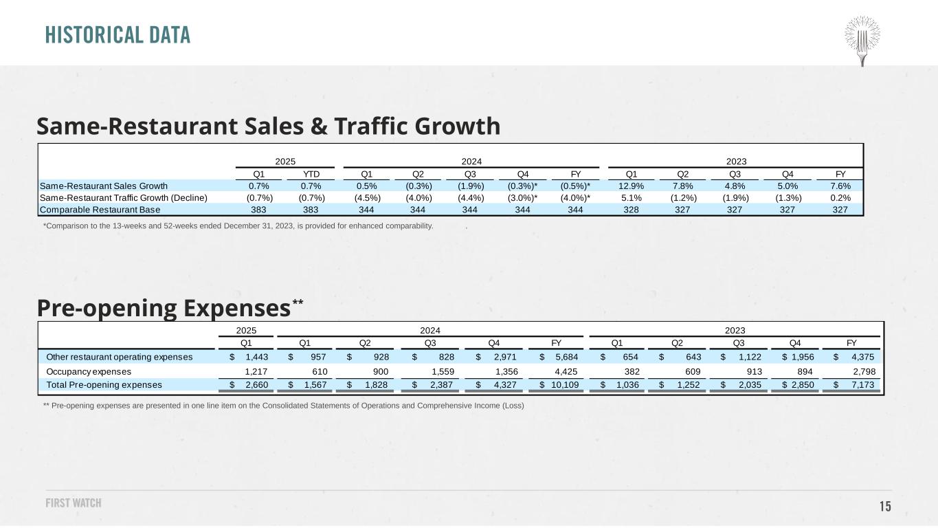 15 ** Pre-opening expenses are presented in one line item on the Consolidated Statements of Operations and Comprehensive Income (Loss) Same-Restaurant Sales & Traffic Growth Pre-opening Expenses** HISTORICAL DATA *Comparison to the 13-weeks and 52-weeks ended December 31, 2023, is provided for enhanced comparability. . 2025 Q1 Q1 Q2 Q3 Q4 FY Q1 Q2 Q3 Q4 FY Other restaurant operating expenses $ 1,443 $ 957 $ 928 $ 828 $ 2,971 $ 5,684 $ 654 $ 643 $ 1,122 $ 1,956 $ 4,375 Occupancy expenses 1,217 610 900 1,559 1,356 4,425 382 609 913 894 2,798 Total Pre-opening expenses $ 2,660 $ 1,567 $ 1,828 $ 2,387 $ 4,327 $ 10,109 $ 1,036 $ 1,252 $ 2,035 $ 2,850 $ 7,173 20232024 Q1 YTD Q1 Q2 Q3 Q4 FY Q1 Q2 Q3 Q4 FY Same-Restaurant Sales Growth 0.7% 0.7% 0.5% (0.3%) (1.9%) (0.3%)* (0.5%)* 12.9% 7.8% 4.8% 5.0% 7.6% Same-Restaurant Traffic Growth (Decline) (0.7%) (0.7%) (4.5%) (4.0%) (4.4%) (3.0%)* (4.0%)* 5.1% (1.2%) (1.9%) (1.3%) 0.2% Comparable Restaurant Base 383 383 344 344 344 344 344 328 327 327 327 327 2024 20232025
