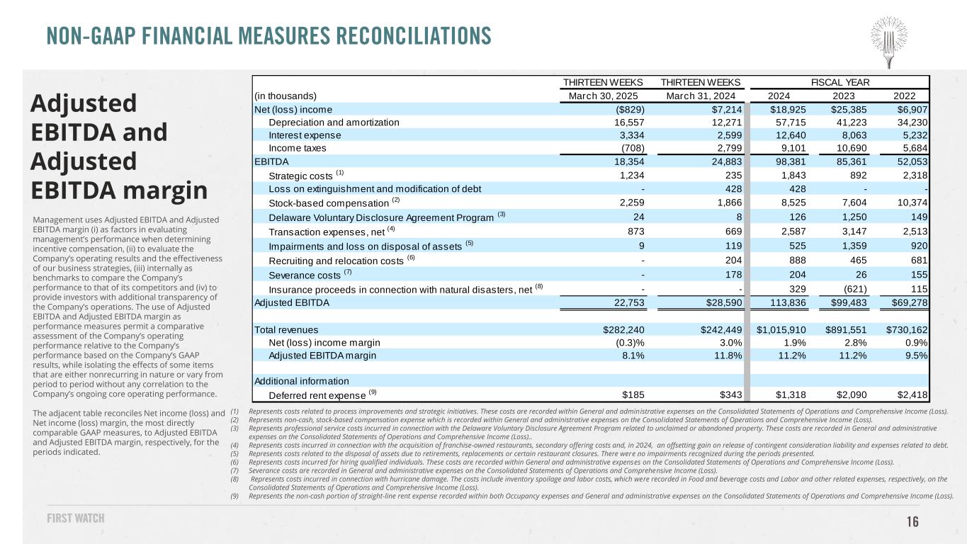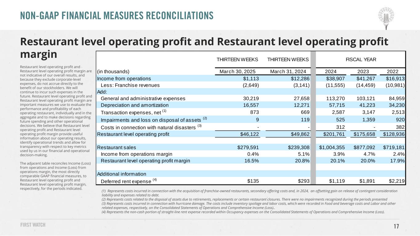16 Management uses Adjusted EBITDA and Adjusted EBITDA margin (i) as factors in evaluating management’s performance when determining incentive compensation, (ii) to evaluate the Company’s operating results and the effectiveness of our business strategies, (iii) internally as benchmarks to compare the Company’s performance to that of its competitors and (iv) to provide investors with additional transparency of the Company’s operations. The use of Adjusted EBITDA and Adjusted EBITDA margin as performance measures permit a comparative assessment of the Company’s operating performance relative to the Company’s performance based on the Company’s GAAP results, while isolating the effects of some items that are either nonrecurring in nature or vary from period to period without any correlation to the Company’s ongoing core operating performance. The adjacent table reconciles Net income (loss) and Net income (loss) margin, the most directly comparable GAAP measures, to Adjusted EBITDA and Adjusted EBITDA margin, respectively, for the periods indicated. NON-GAAP FINANCIAL MEASURES RECONCILIATIONS Adjusted EBITDA and Adjusted EBITDA margin (1) Represents costs related to process improvements and strategic initiatives. These costs are recorded within General and administrative expenses on the Consolidated Statements of Operations and Comprehensive Income (Loss). (2) Represents non-cash, stock-based compensation expense which is recorded within General and administrative expenses on the Consolidated Statements of Operations and Comprehensive Income (Loss). (3) Represents professional service costs incurred in connection with the Delaware Voluntary Disclosure Agreement Program related to unclaimed or abandoned property. These costs are recorded in General and administrative expenses on the Consolidated Statements of Operations and Comprehensive Income (Loss).. (4) Represents costs incurred in connection with the acquisition of franchise-owned restaurants, secondary offering costs and, in 2024, an offsetting gain on release of contingent consideration liability and expenses related to debt. (5) Represents costs related to the disposal of assets due to retirements, replacements or certain restaurant closures. There were no impairments recognized during the periods presented. (6) Represents costs incurred for hiring qualified individuals. These costs are recorded within General and administrative expenses on the Consolidated Statements of Operations and Comprehensive Income (Loss). (7) Severance costs are recorded in General and administrative expenses on the Consolidated Statements of Operations and Comprehensive Income (Loss). (8) Represents costs incurred in connection with hurricane damage. The costs include inventory spoilage and labor costs, which were recorded in Food and beverage costs and Labor and other related expenses, respectively, on the Consolidated Statements of Operations and Comprehensive Income (Loss). (9) Represents the non-cash portion of straight-line rent expense recorded within both Occupancy expenses and General and administrative expenses on the Consolidated Statements of Operations and Comprehensive Income (Loss). THIRTEEN WEEKS THIRTEEN WEEKS (in thousands) March 30, 2025 March 31, 2024 2024 2023 2022 Net (loss) income ($829) $7,214 $18,925 $25,385 $6,907 Depreciation and amortization 16,557 12,271 57,715 41,223 34,230 Interest expense 3,334 2,599 12,640 8,063 5,232 Income taxes (708) 2,799 9,101 10,690 5,684 EBITDA 18,354 24,883 98,381 85,361 52,053 Strategic costs (1) 1,234 235 1,843 892 2,318 Loss on extinguishment and modification of debt - 428 428 - - Stock-based compensation (2) 2,259 1,866 8,525 7,604 10,374 Delaware Voluntary Disclosure Agreement Program (3) 24 8 126 1,250 149 Transaction expenses, net (4) 873 669 2,587 3,147 2,513 Impairments and loss on disposal of assets (5) 9 119 525 1,359 920 Recruiting and relocation costs (6) - 204 888 465 681 Severance costs (7) - 178 204 26 155 Insurance proceeds in connection with natural disasters, net (8) - - 329 (621) 115 Adjusted EBITDA 22,753 $28,590 113,836 $99,483 $69,278 Total revenues $282,240 $242,449 $1,015,910 $891,551 $730,162 Net (loss) income margin (0.3)% 3.0% 1.9% 2.8% 0.9% Adjusted EBITDA margin 8.1% 11.8% 11.2% 11.2% 9.5% Additional information Deferred rent expense (9) $185 $343 $1,318 $2,090 $2,418 FISCAL YEAR