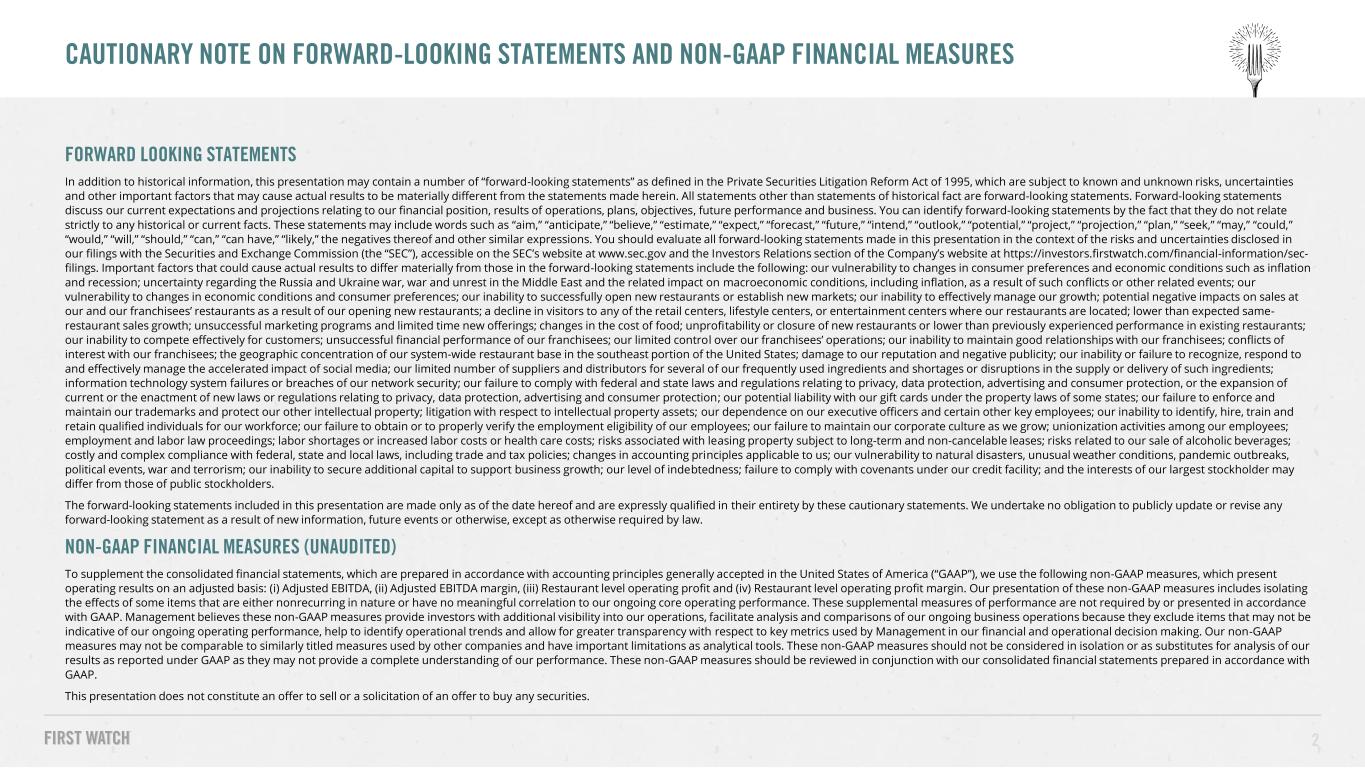 FORWARD LOOKING STATEMENTS In addition to historical information, this presentation may contain a number of “forward-looking statements” as defined in the Private Securities Litigation Reform Act of 1995, which are subject to known and unknown risks, uncertainties and other important factors that may cause actual results to be materially different from the statements made herein. All statements other than statements of historical fact are forward-looking statements. Forward-looking statements discuss our current expectations and projections relating to our financial position, results of operations, plans, objectives, future performance and business. You can identify forward-looking statements by the fact that they do not relate strictly to any historical or current facts. These statements may include words such as “aim,” “anticipate,” “believe,” “estimate,” “expect,” “forecast,” “future,” “intend,” “outlook,” “potential,” “project,” “projection,” “plan,” “seek,” “may,” “could,” “would,” “will,” “should,” “can,” “can have,” “likely,” the negatives thereof and other similar expressions. You should evaluate all forward-looking statements made in this presentation in the context of the risks and uncertainties disclosed in our filings with the Securities and Exchange Commission (the “SEC”), accessible on the SEC’s website at www.sec.gov and the Investors Relations section of the Company’s website at https://investors.firstwatch.com/financial-information/sec- filings. Important factors that could cause actual results to differ materially from those in the forward-looking statements include the following: our vulnerability to changes in consumer preferences and economic conditions such as inflation and recession; uncertainty regarding the Russia and Ukraine war, war and unrest in the Middle East and the related impact on macroeconomic conditions, including inflation, as a result of such conflicts or other related events; our vulnerability to changes in economic conditions and consumer preferences; our inability to successfully open new restaurants or establish new markets; our inability to effectively manage our growth; potential negative impacts on sales at our and our franchisees’ restaurants as a result of our opening new restaurants; a decline in visitors to any of the retail centers, lifestyle centers, or entertainment centers where our restaurants are located; lower than expected same- restaurant sales growth; unsuccessful marketing programs and limited time new offerings; changes in the cost of food; unprofitability or closure of new restaurants or lower than previously experienced performance in existing restaurants; our inability to compete effectively for customers; unsuccessful financial performance of our franchisees; our limited control over our franchisees’ operations; our inability to maintain good relationships with our franchisees; conflicts of interest with our franchisees; the geographic concentration of our system-wide restaurant base in the southeast portion of the United States; damage to our reputation and negative publicity; our inability or failure to recognize, respond to and effectively manage the accelerated impact of social media; our limited number of suppliers and distributors for several of our frequently used ingredients and shortages or disruptions in the supply or delivery of such ingredients; information technology system failures or breaches of our network security; our failure to comply with federal and state laws and regulations relating to privacy, data protection, advertising and consumer protection, or the expansion of current or the enactment of new laws or regulations relating to privacy, data protection, advertising and consumer protection; our potential liability with our gift cards under the property laws of some states; our failure to enforce and maintain our trademarks and protect our other intellectual property; litigation with respect to intellectual property assets; our dependence on our executive officers and certain other key employees; our inability to identify, hire, train and retain qualified individuals for our workforce; our failure to obtain or to properly verify the employment eligibility of our employees; our failure to maintain our corporate culture as we grow; unionization activities among our employees; employment and labor law proceedings; labor shortages or increased labor costs or health care costs; risks associated with leasing property subject to long-term and non-cancelable leases; risks related to our sale of alcoholic beverages; costly and complex compliance with federal, state and local laws, including trade and tax policies; changes in accounting principles applicable to us; our vulnerability to natural disasters, unusual weather conditions, pandemic outbreaks, political events, war and terrorism; our inability to secure additional capital to support business growth; our level of indebtedness; failure to comply with covenants under our credit facility; and the interests of our largest stockholder may differ from those of public stockholders. The forward-looking statements included in this presentation are made only as of the date hereof and are expressly qualified in their entirety by these cautionary statements. We undertake no obligation to publicly update or revise any forward-looking statement as a result of new information, future events or otherwise, except as otherwise required by law. NON-GAAP FINANCIAL MEASURES (UNAUDITED) To supplement the consolidated financial statements, which are prepared in accordance with accounting principles generally accepted in the United States of America (“GAAP”), we use the following non-GAAP measures, which present operating results on an adjusted basis: (i) Adjusted EBITDA, (ii) Adjusted EBITDA margin, (iii) Restaurant level operating profit and (iv) Restaurant level operat