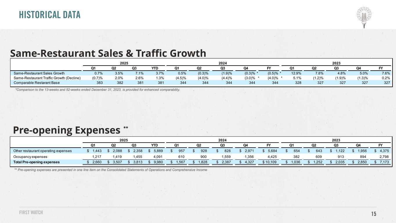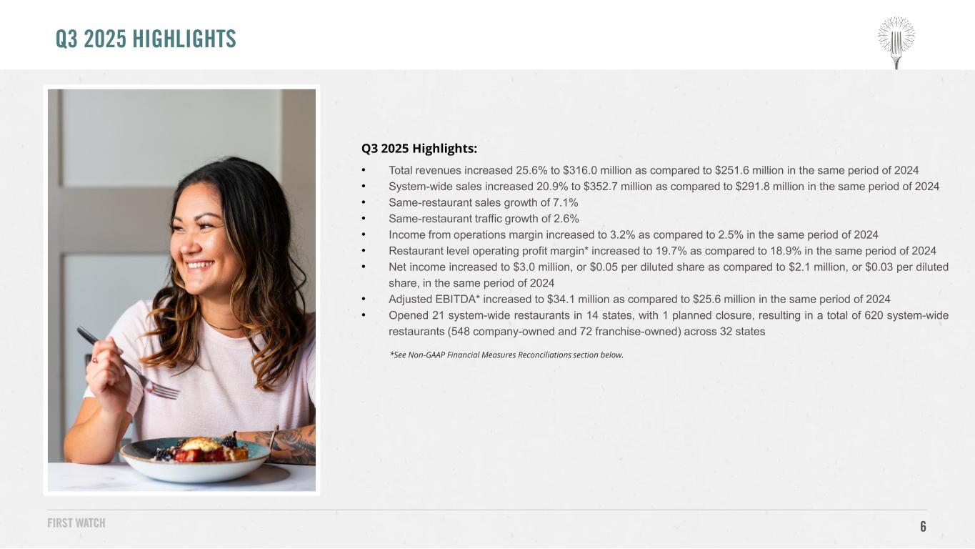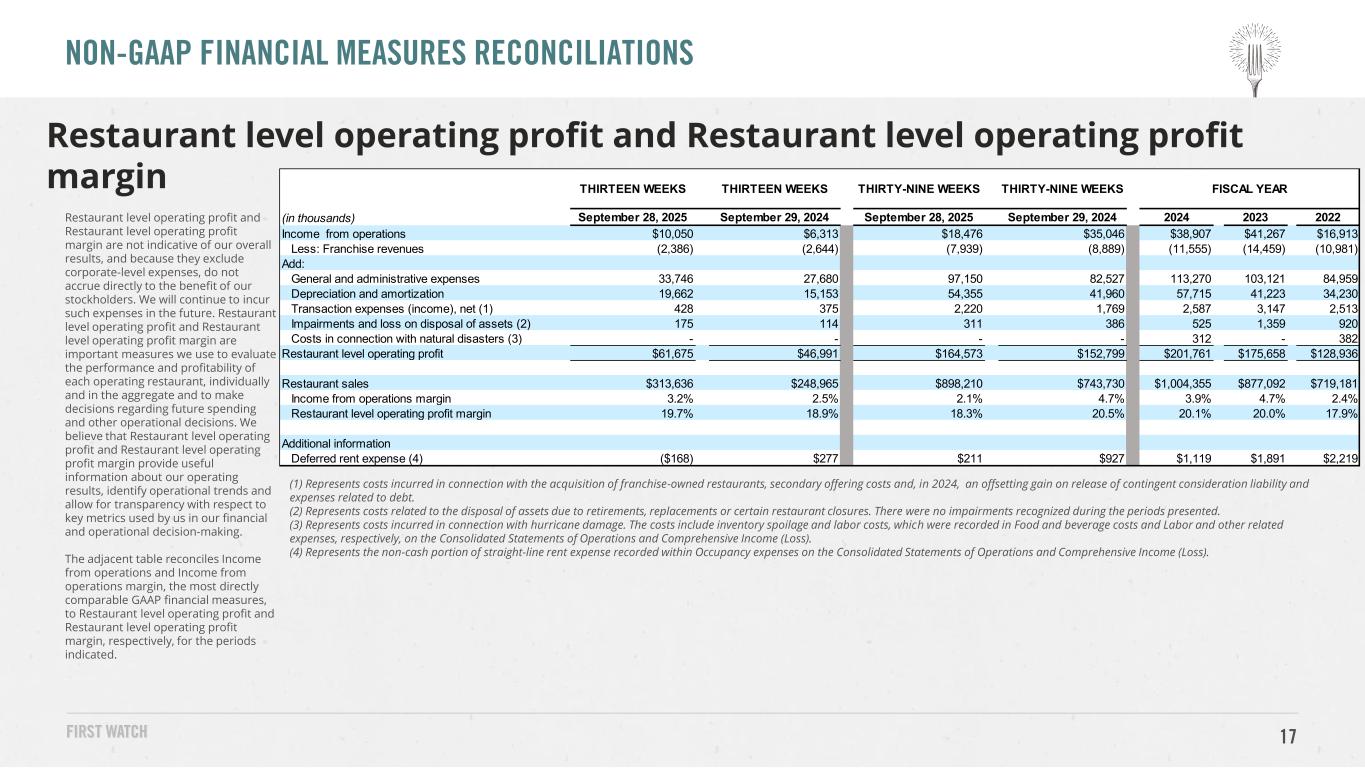18 Adjusted EBITDA: a non-GAAP financial measure, is defined as net income (loss) before depreciation and amortization, interest expense, income taxes and items that the Company does not consider in the evaluation of its ongoing core operating performance. Adjusted EBITDA margin: a non-GAAP financial measure, is defined as Adjusted EBITDA as a percentage of total revenues. Average Unit Volume: the total restaurant sales (excluding gift card breakage) recognized in the comparable restaurant base, which is defined as the number of company-owned First Watch branded restaurants open for 18 months or longer as of the beginning of the fiscal year (“Comparable Restaurant Base”), divided by the number of restaurants in the Comparable Restaurant Base during the period. This measurement allows management to assess changes in consumer spending patterns at our restaurants and the overall performance of our restaurant base. Restaurant level operating profit: a non-GAAP financial measure, is defined as restaurant sales, less restaurant operating expenses, which include food and beverage costs, labor and other related expenses, other restaurant operating expenses, pre-opening expenses and occupancy expenses. Restaurant level operating profit excludes corporate-level expenses and items that are not considered in the Company’s evaluation of its ongoing core operating performance. Restaurant level operating profit margin: a non-GAAP financial measure, is defined as Restaurant level operating profit as a percentage of restaurant sales. Same-restaurant sales growth: the percentage change in year-over-year restaurant sales (excluding gift card breakage) for the comparable restaurant base, which we define as the number of company-owned First Watch branded restaurants open for 18 months or longer as of the beginning of the fiscal year (“Comparable Restaurant Base”). For the thirteen and thirty-nine weeks ended September 28, 2025 and September 29, 2024, there were 381 restaurants and 344 restaurants, in our Comparable Restaurant Base. Measuring our same-restaurant sales growth allows management to evaluate the performance of our existing restaurant base. We believe this measure is useful for investors to provide a consistent comparison of restaurant sales results and trends across periods within our core, established restaurant base, unaffected by results of store openings, closings, and other transitional changes Same-restaurant traffic growth: the percentage change in traffic counts as compared to the same period in the prior year using the Comparable Restaurant Base. Measuring our same-restaurant traffic growth allows management to evaluate the performance of our existing restaurant base. We believe this measure is useful for investors because an increase in same-restaurant traffic provides an indicator as to the development of our brand and the effectiveness of our marketing strategy. System-wide restaurants: the total number of restaurants, including all company-owned and franchise-owned restaurants. System-wide sales: consists of restaurant sales from our company-owned restaurants and franchise-owned restaurants. We do not recognize the restaurant sales from our franchise-owned restaurants as revenue. DEFINITIONS USED IN PRESENTATION