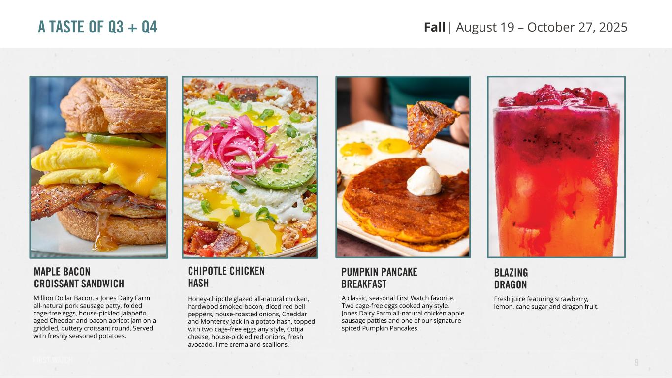 Fall| August 19 – October 27, 2025 9 Million Dollar Bacon, a Jones Dairy Farm all-natural pork sausage patty, folded cage-free eggs, house-pickled jalapeño, aged Cheddar and bacon apricot jam on a griddled, buttery croissant round. Served with freshly seasoned potatoes. Honey-chipotle glazed all-natural chicken, hardwood smoked bacon, diced red bell peppers, house-roasted onions, Cheddar and Monterey Jack in a potato hash, topped with two cage-free eggs any style, Cotija cheese, house-pickled red onions, fresh avocado, lime crema and scallions. A classic, seasonal First Watch favorite. Two cage-free eggs cooked any style, Jones Dairy Farm all-natural chicken apple sausage patties and one of our signature spiced Pumpkin Pancakes. BLAZING DRAGON Fresh juice featuring strawberry, lemon, cane sugar and dragon fruit. MAPLE BACON CROISSANT SANDWICH CHIPOTLE CHICKEN HASH PUMPKIN PANCAKE BREAKFAST A TASTE OF Q3 + Q4