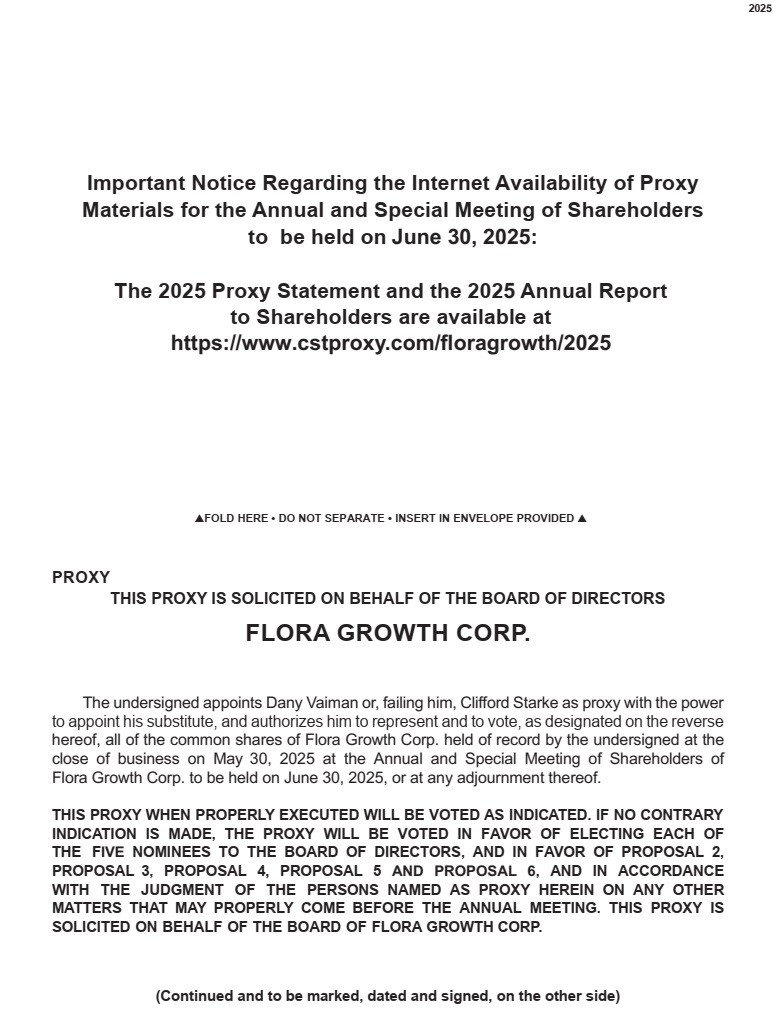 You are cordially invited to attend the 2025 Annual and Special Meeting of Shareholders (the "Annual Meeting") of Flora Growth Corp., a corporation organized under the laws of the Province of Ontario (the "Company") to be held on June 30, 2025, at 11:00 a.m. Eastern Time. The Annual Meeting will be held at the offices of the Company's legal counsel, Dorsey & Whitney LLP, 66 Wellington Street West, Suite 3400, Toronto, ON M5K 1E6, Canada.