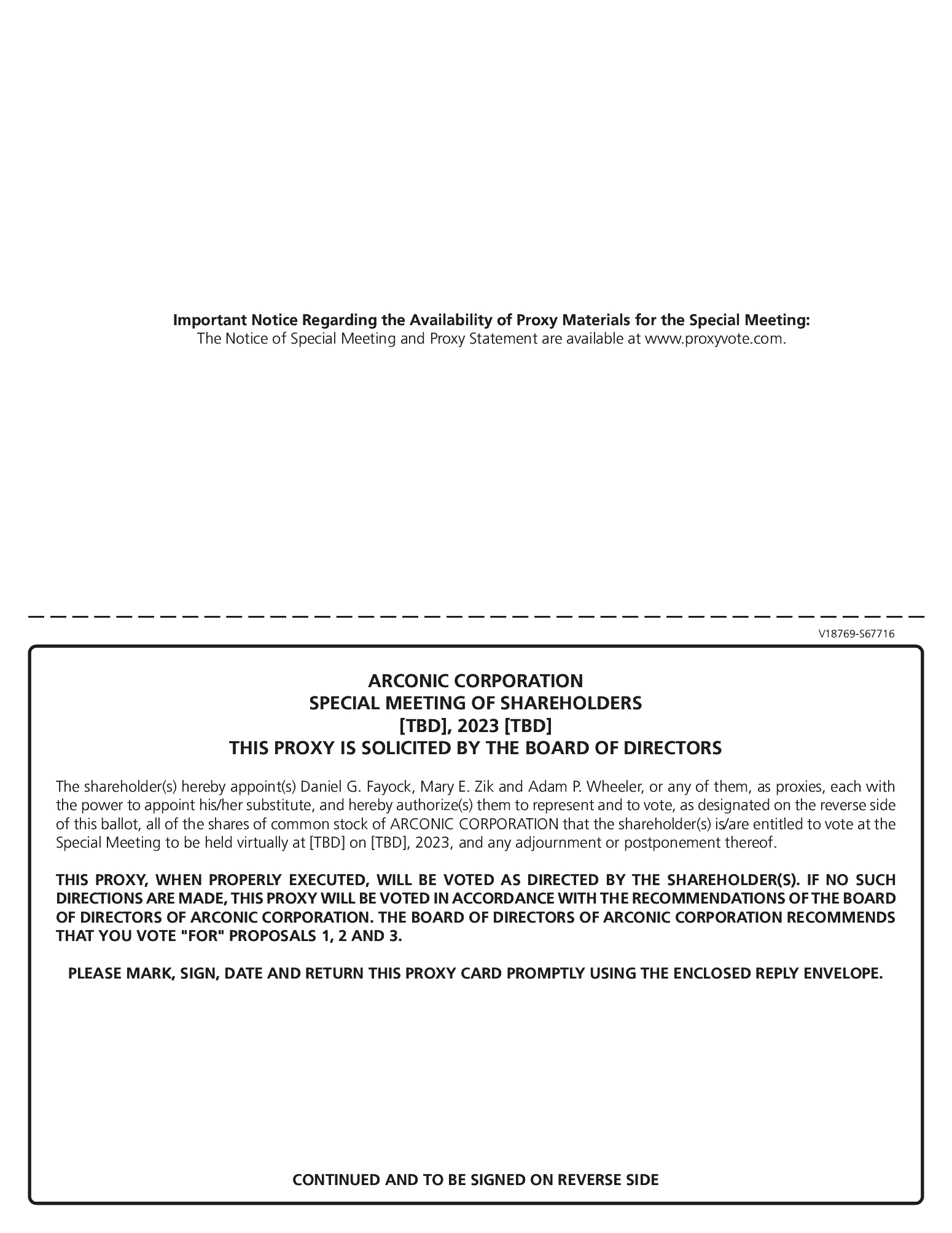 shareholders adopt the Merger Agreement; and (d) directed that the adoption of the Merger Agreement be submitted for consideration by Arconic shareholders at the Special Meeting. The Board of Directors unanimously recommends that you vote: (1) “FOR” the Merger Agreement Proposal; (2) “FOR” the Compensation Proposal; and (3) “FOR” the Adjournment Proposal.