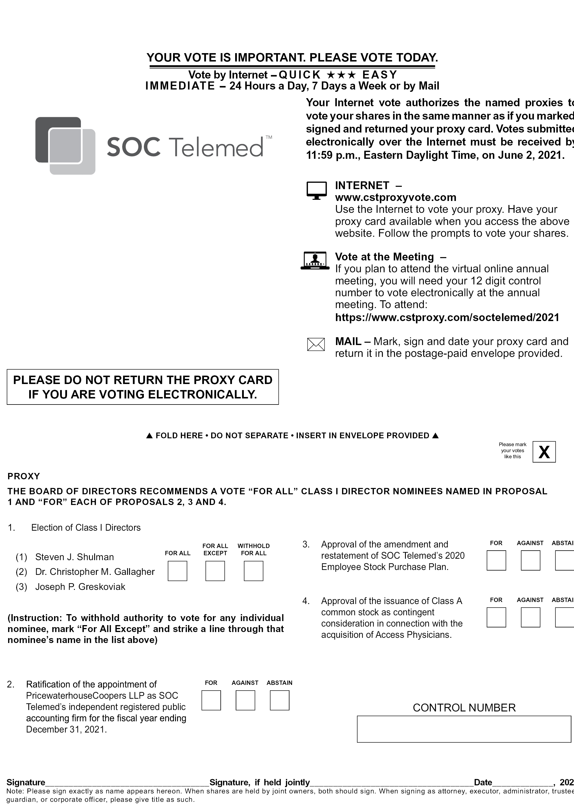YOUR VOTE IS IMPORTANT. PLEASE VOTE TODAY. Vote by Internet - QUICK * * * EASY IMMEDIATE - 24 Hours a Day, 7 Days a Week or by Mail Your Internet vote authorizes the named proxies to vote your shares in the same manner as if you marked, signed and returned your proxy card. Votes submitted electronically over the Internet must be received by 11:59 p.m., Eastern Daylight Time, on June 2, 2021. INTERNET – www.cstproxyvote.com Use the Internet to vote your proxy. Have your proxy card available when you access the above website. Follow the prompts to vote your shares. Vote at the Meeting – If you plan to attend the virtual online annual meeting, you will need your 12 digit control number to vote electronically at the annual meeting. To attend: https://www.cstproxy.com/soctelemed/2021 MAIL – Mark, sign and date your proxy card and return it in the postage-paid envelope provided. PLEASE DO NOT RETURN THE PROXY CARD IF YOU ARE VOTING ELECTRONICALLY. FOLD HERE • DO NOT SEPARATE • INSERT IN ENVELOPE PROVIDED Please mark your votes like this X PROXY THE BOARD OF DIRECTORS RECOMMENDS A VOTE “FOR ALL” CLASS I DIRECTOR NOMINEES NAMED IN PROPOSAL 1 AND “FOR” EACH OF PROPOSALS 2, 3 AND 4. 1. Election of Class I Directors FOR ALL FOR ALL EXCEPT WITHHOLD FOR ALL (1) Steven J. Shulman (2) Dr. Christopher M. Gallagher (3) Joseph P. Greskoviak (Instruction: To withhold authority to vote for any individual nominee, mark “For All Except” and strike a line through that nominee’s name in the list above) 2. Ratification of the appointment of PricewaterhouseCoopers LLP as SOC Telemed’s independent registered public accounting firm for the fiscal year ending December 31, 2021. FOR AGAINST ABSTAIN 3. Approval of the amendment and restatement of SOC Telemed’s 2020 Employee Stock Purchase Plan. FOR AGAINST ABSTAIN 4. Approval of the issuance of Class A common stock as contingent consideration in connection with the acquisition of Access Physicians. FOR AGAINST ABSTAIN CONTROL NUMBER SignatureSignature, if held jointly Date , 2021 Note: Please sign exactly as name appears hereon. When shares are held by joint owners, both should sign. When signing as attorney, executor, administrator, trustee, guardian, or corporate officer, please give title as such.