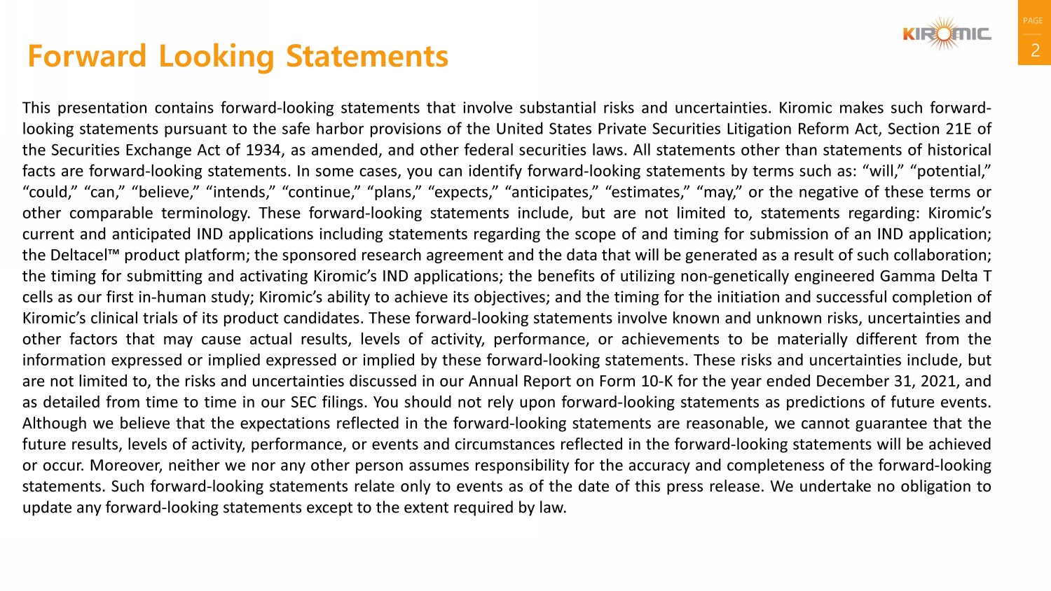 PAGE | 2 Forward Looking Statements This presentation contains forward - looking statements that involve substantial risks and uncertainties . Kiromic makes such forward - looking statements pursuant to the safe harbor provisions of the United States Private Securities Litigation Reform Act, Section 21 E of the Securities Exchange Act of 1934 , as amended, and other federal securities laws . All statements other than statements of historical facts are forward - looking statements . In some cases, you can identify forward - looking statements by terms such as : “will,” “potential,” “could,” “can,” “believe,” “intends,” “continue,” “plans,” “expects,” “anticipates,” “estimates,” “may,” or the negative of these terms or other comparable terminology . These forward - looking statements include, but are not limited to, statements regarding : Kiromic’s current and anticipated IND applications including statements regarding the scope of and timing for submission of an IND application ; the Deltacel Ρ product platform ; the sponsored research agreement and the data that will be generated as a result of such collaboration ; the timing for submitting and activating Kiromic’s IND applications ; the benefits of utilizing non - genetically engineered Gamma Delta T cells as our first in - human study ; Kiromic’s ability to achieve its objectives ; and the timing for the initiation and successful completion of Kiromic’s clinical trials of its product candidates . These forward - looking statements involve known and unknown risks, uncertainties and other factors that may cause actual results, levels of activity, performance, or achievements to be materially different from the information expressed or implied expressed or implied by these forward - looking statements . These risks and uncertainties include, but are not limited to, the risks and uncertainties discussed in our Annual Report on Form 10 - K for the year ended December 31 , 2021 , and as detailed from time to time in our SEC filings . You should not rely upon forward - looking statements as predictions of future events . Although we believe that the expectations reflected in the forward - looking statements are reasonable, we cannot guarantee that the future results, levels of activity, performance, or events and circumstances reflected in the forward - looking statements will be achieved or occur . Moreover, neither we nor any other person assumes responsibility for the accuracy and completeness of the forward - looking statements . Such forward - looking statements relate only to events as of the date of this press release . We undertake no obligation to update any forward - looking statements except to the extent required by law .