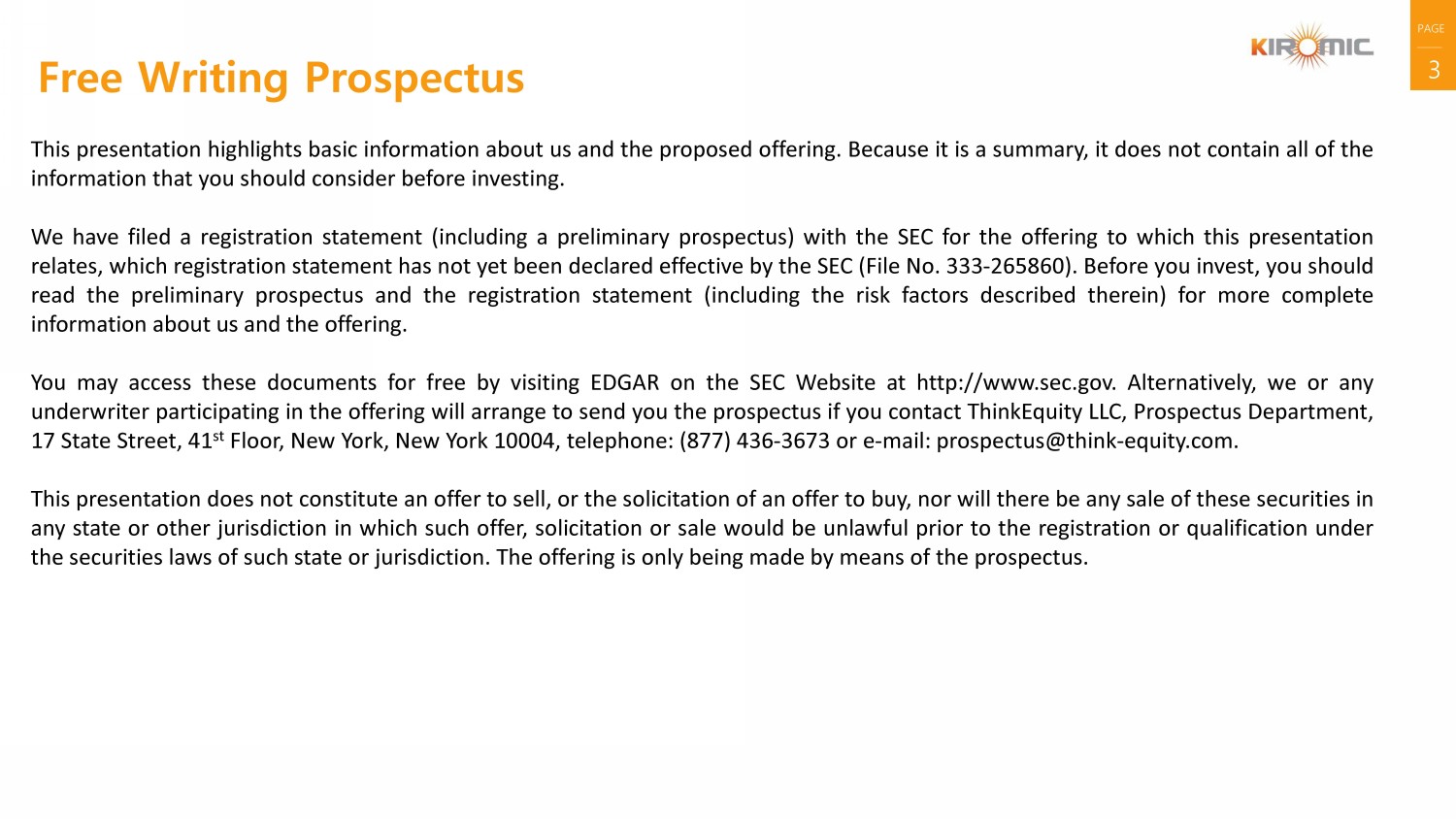 PAGE | 3 Free Writing Prospectus This presentation highlights basic information about us and the proposed offering . Because it is a summary, it does not contain all of the information that you should consider before investing . We have filed a registration statement (including a preliminary prospectus) with the SEC for the offering to which this presentation relates, which registration statement has not yet been declared effective by the SEC (File No . 333 - 265860 ) . Before you invest, you should read the preliminary prospectus and the registration statement (including the risk factors described therein) for more complete information about us and the offering . You may access these documents for free by visiting EDGAR on the SEC Website at http : //www . sec . gov . Alternatively, we or any underwriter participating in the offering will arrange to send you the prospectus if you contact ThinkEquity LLC, Prospectus Department, 17 State Street, 41 st Floor, New York, New York 10004 , telephone : ( 877 ) 436 - 3673 or e - mail : prospectus@think - equity . com . This presentation does not constitute an offer to sell, or the solicitation of an offer to buy, nor will there be any sale of these securities in any state or other jurisdiction in which such offer, solicitation or sale would be unlawful prior to the registration or qualification under the securities laws of such state or jurisdiction . The offering is only being made by means of the prospectus .