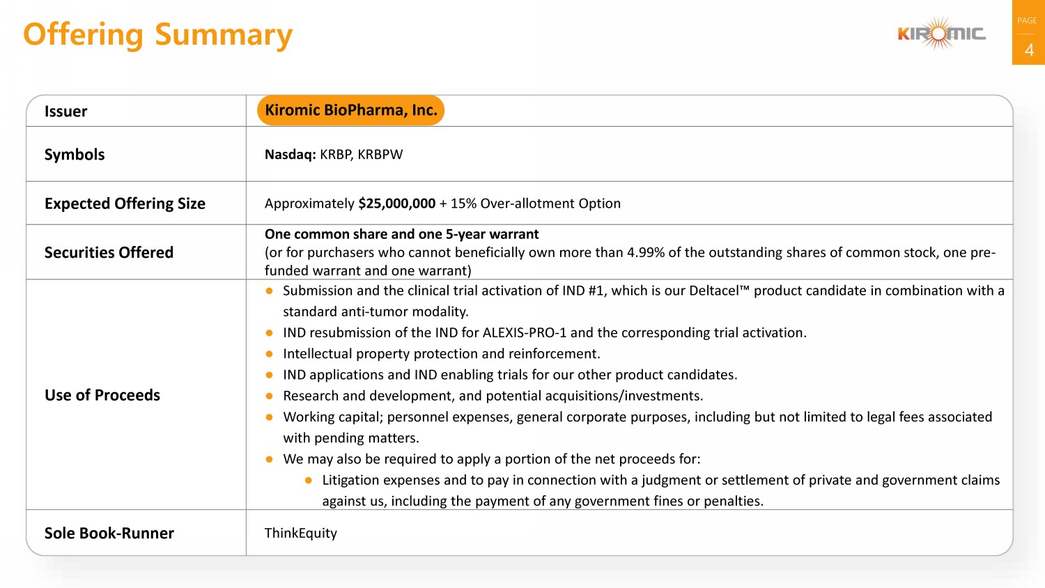 PAGE | 4 Offering Summary Issuer Symbols Nasdaq: KRBP, KRBPW Expected Offering Size Approximately $25,000,000 + 15% Over - allotment Option Securities Offered One common share and one 5 - year warrant (or for purchasers who cannot beneficially own more than 4.99% of the outstanding shares of common stock, one pre - funded warrant and one warrant) Use of Proceeds ● Submission and the clinical trial activation of IND #1, which is our Deltacel Ρ product candidate in combination with a standard anti - tumor modality. ● IND resubmission of the IND for ALEXIS - PRO - 1 and the corresponding trial activation. ● Intellectual property protection and reinforcement. ● IND applications and IND enabling trials for our other product candidates. ● Research and development, and potential acquisitions/investments. ● Working capital; personnel expenses, general corporate purposes, including but not limited to legal fees associated with pending matters. ● We may also be required to apply a portion of the net proceeds for: ● Litigation expenses and to pay in connection with a judgment or settlement of private and government claims against us, including the payment of any government fines or penalties. Sole Book - Runner ThinkEquity Kiromic BioPharma, Inc.