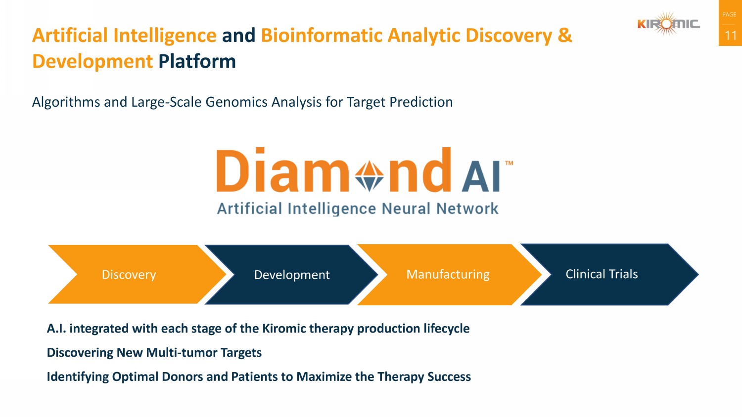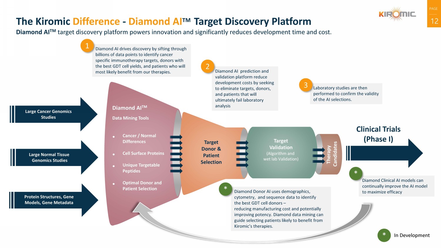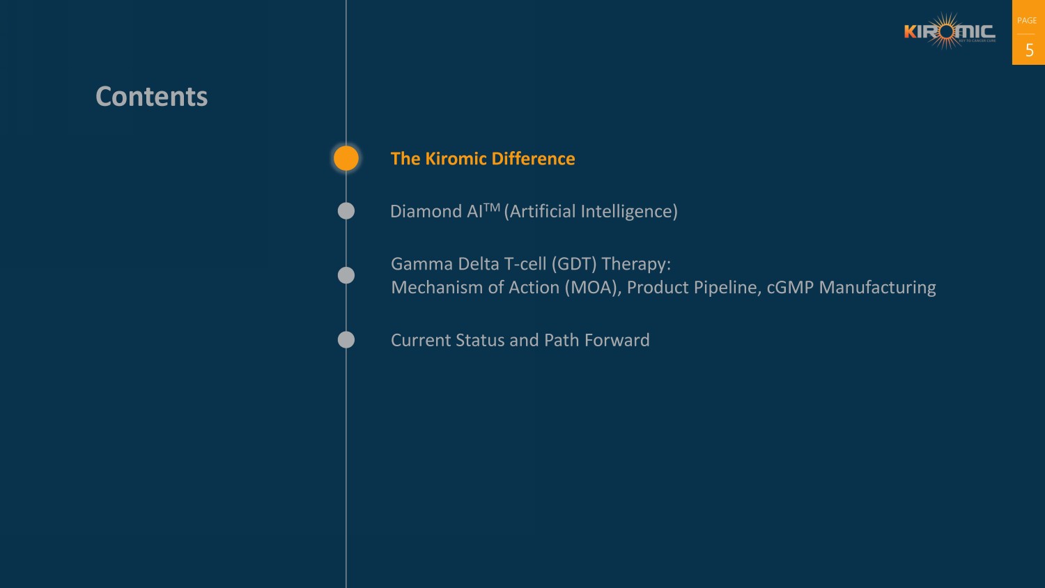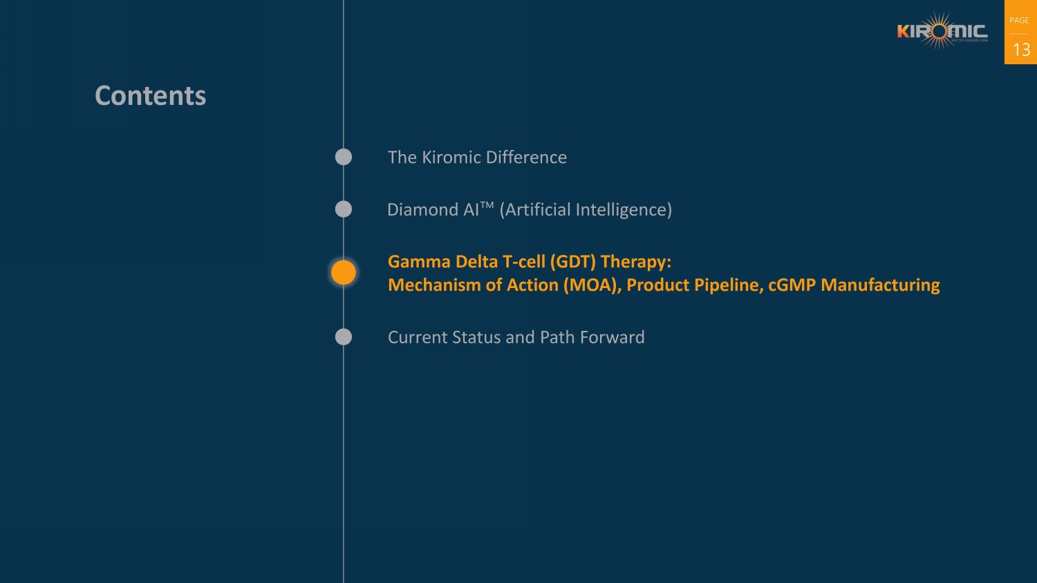 PAGE | 13 Contents Gamma Delta T - cell (GDT) Therapy: Mechanism of Action (MOA), Product Pipeline, cGMP Manufacturing Current Status and Path Forward The Kiromic Difference Diamond AI Œ (Artificial Intelligence)