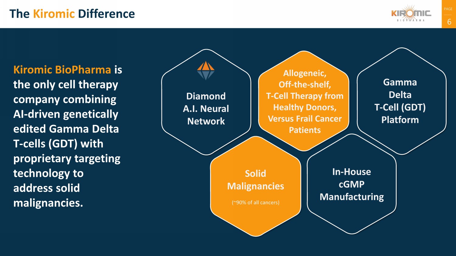 PAGE | 5 Contents Gamma Delta T - cell (GDT) Therapy: Mechanism of Action (MOA), Product Pipeline, cGMP Manufacturing Current Status and Path Forward The Kiromic Difference Diamond AI TM (Artificial Intelligence)