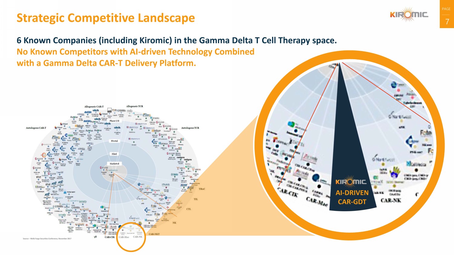 PAGE | 7 Strategic Competitive Landscape 6 Known Companies (including Kiromic) in the Gamma Delta T Cell Therapy space. No Known Competitors with AI - driven Technology Combined with a Gamma Delta CAR - T Delivery Platform. AI - DRIVEN CAR - GDT