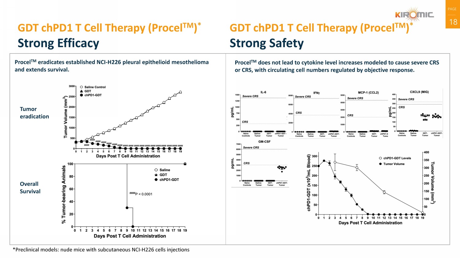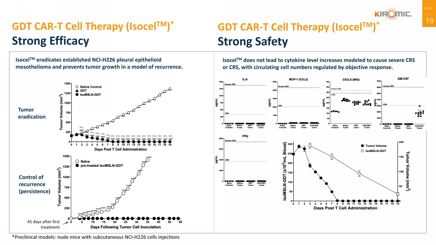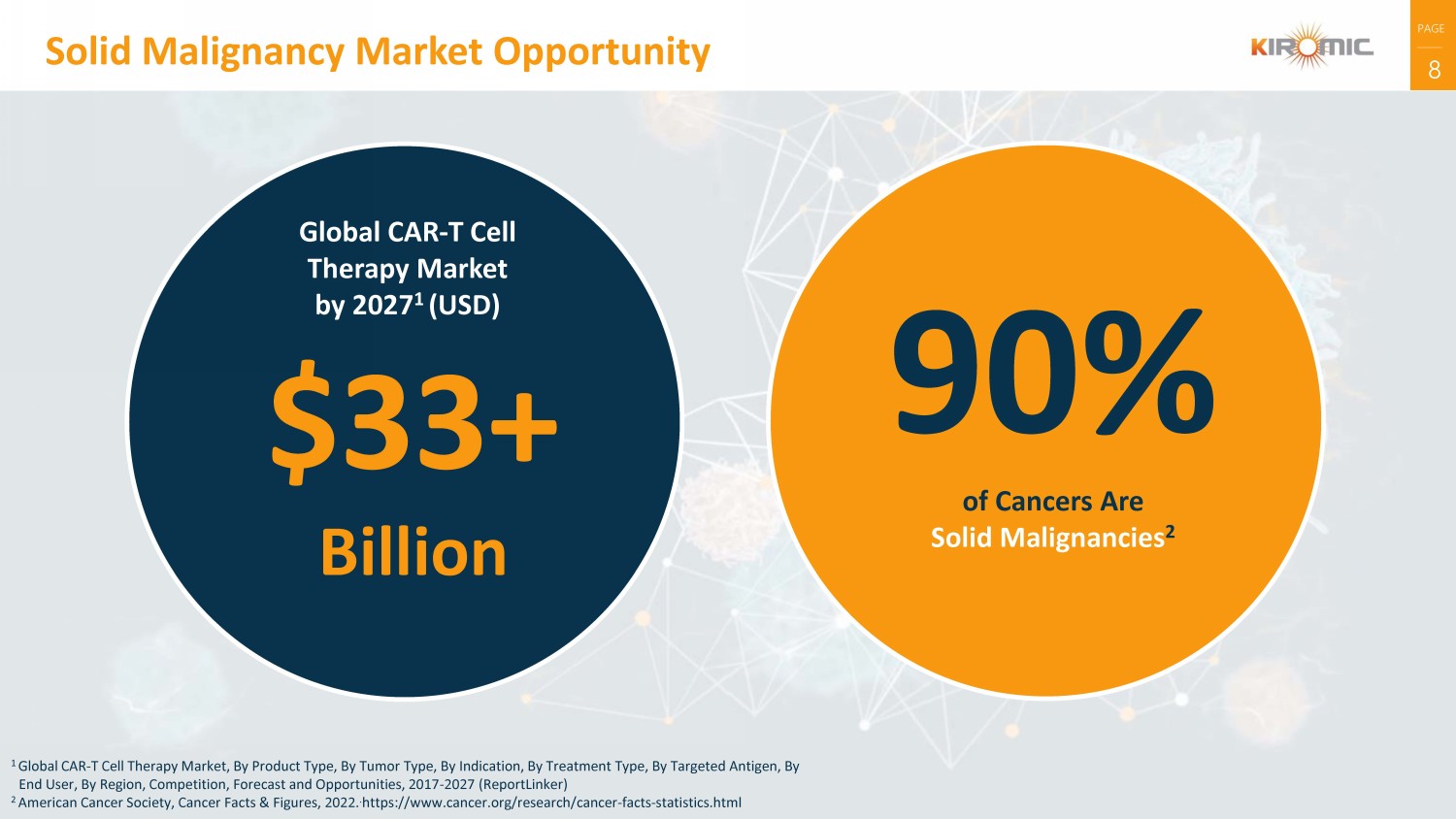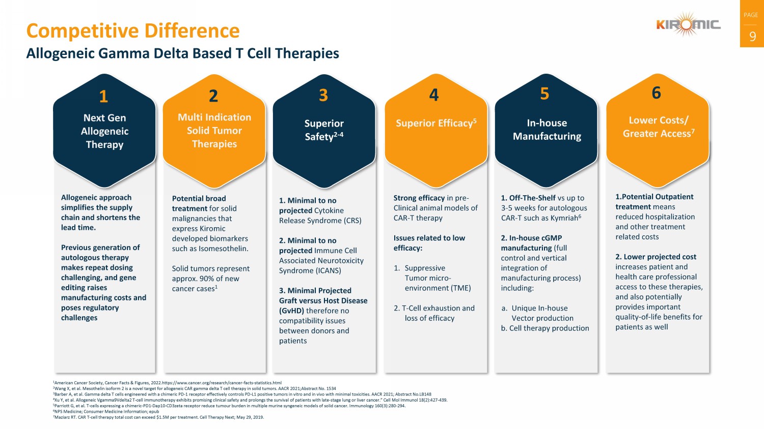 PAGE | 9 Competitive Difference Allogeneic Gamma Delta Based T Cell Therapies Next Gen Allogeneic Therapy Multi Indication Solid Tumor Therapies Superior Safety 2 - 4 Superior Efficacy 5 In - house Manufacturing Lower Costs/ Greater Access 7 Allogeneic approach simplifies the supply chain and shortens the lead time. Previous generation of autologous therapy makes repeat dosing challenging, and gene editing raises manufacturing costs and poses regulatory challenges 1 2 3 4 5 6 Potential broad treatment for solid malignancies that express Kiromic developed biomarkers such as Isomesothelin. Solid tumors represent approx. 90% of new cancer cases 1 1. Minimal to no projected Cytokine Release Syndrome (CRS) 2. Minimal to no projected Immune Cell Associated Neurotoxicity Syndrome (ICANS) 3. Minimal Projected Graft versus Host Disease (GvHD) therefore no compatibility issues between donors and patients Strong efficacy in pre - Clinical animal models of CAR - T therapy Issues related to low efficacy: 1. Suppressive Tumor micro - environment (TME) 2. T - Cell exhaustion and loss of efficacy 1. Off - The - Shelf vs up to 3 - 5 weeks for autologous CAR - T such as Kymriah 6 2. In - house cGMP manufacturing (full control and vertical integration of manufacturing process) including: a. Unique In - house Vector production b. Cell therapy production 1. Potential Outpatient treatment means reduced hospitalization and other treatment related costs 2. Lower projected cost increases patient and health care professional access to these therapies, and also potentially provides important quality - of - life benefits for patients as well 1 American Cancer Society, Cancer Facts & Figures, 2022.https://www.cancer.org/research/cancer - facts - statistics.html 2 Wang X, et al. Mesothelin isoform 2 is a novel target for allogeneic CAR gamma delta T cell therapy in solid tumors. AACR 202 1;A bstract No. 1534 3 Barber A, et al. Gamma delta T cells engineered with a chimeric PD - 1 receptor effectively controls PD - L1 positive tumors in vitr o and in vivo with minimal toxicities. AACR 2021; Abstract No.LB148 4 Xu Y, et al. Allogeneic Vgamma9Vdelta2 T - cell immunotherapy exhibits promising clinical safety and prolongs the survival of pati ents with late - stage lung or liver cancer.” Cell Mol Immunol 18(2):427 - 439. 5 Parriott G, et al. T - cells expressing a chimeric - PD1 - Dap10 - CD3zeta receptor reduce tumour burden in multiple murine syngeneic mo dels of solid cancer. Immunology 160(3):280 - 294. 6 NPS Medicine; Consumer Medicine Information; epub 7 Maziarz RT. CAR T - cell therapy total cost can exceed $1.5M per treatment. Cell Therapy Next; May 29, 2019.
