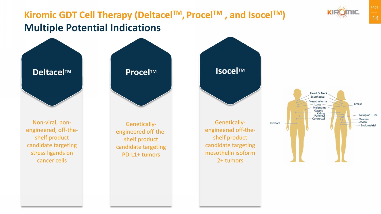 PAGE | 14 Kiromic GDT Cell Therapy (Deltacel TM , Procel TM , and Isocel TM ) Multiple Potential Indications Non - viral, non - engineered, off - the - shelf product candidate targeting stress ligands on cancer cells Deltacel TM Genetically - engineered off - the - shelf product candidate targeting PD - L1+ tumors Procel TM Genetically - engineered off - the - shelf product candidate targeting mesothelin isoform 2+ tumors Isocel TM