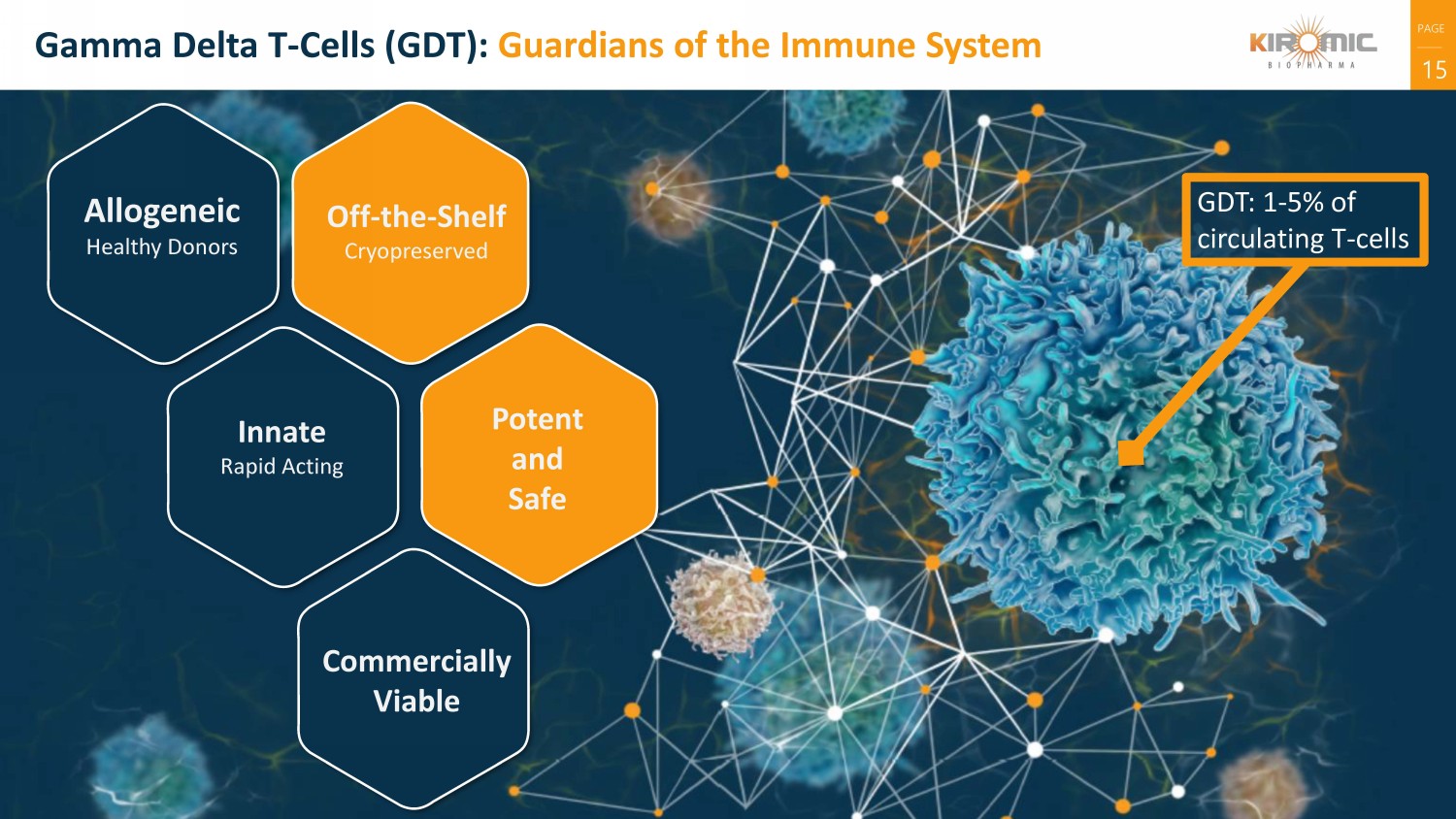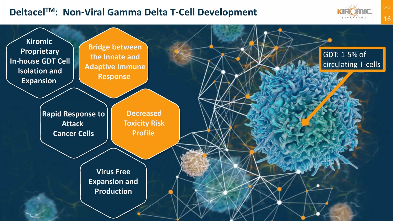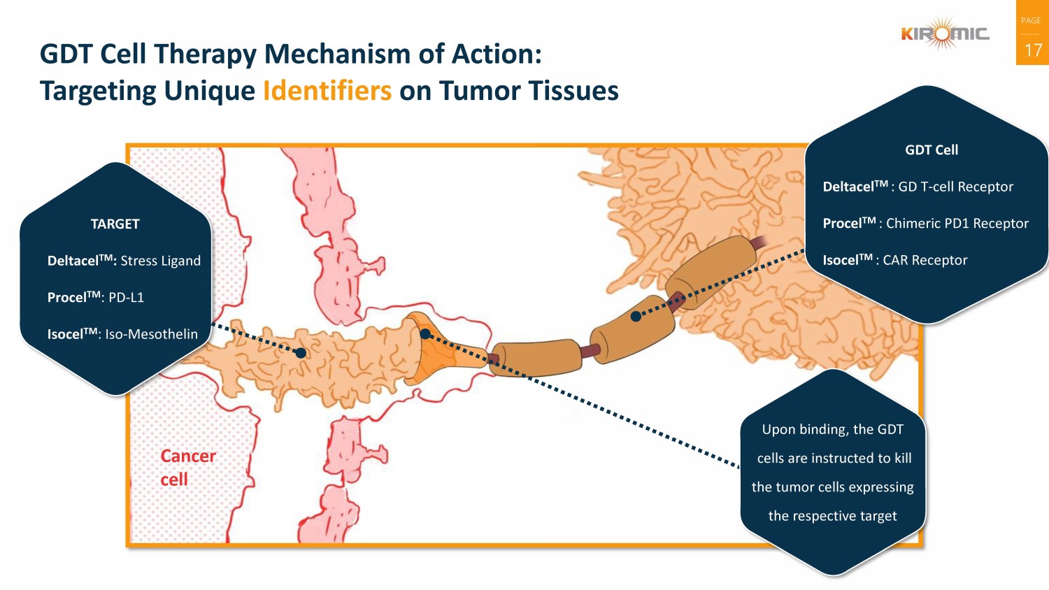 PAGE | 16 Deltacel TM : Non - Viral Gamma Delta T - Cell Development Bridge between the Innate and Adaptive Immune Response Kiromic Proprietary In - house GDT Cell Isolation and Expansion Rapid Response to Attack Cancer Cells Decreased Toxicity Risk Profile Virus Free Expansion and Production GDT: 1 - 5% of circulating T - cells