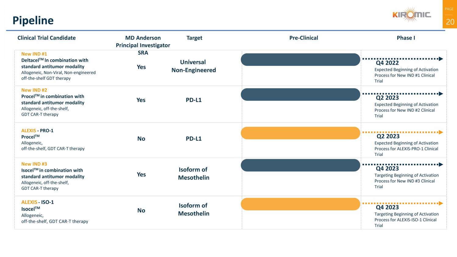 PAGE | 20 Pipeline Clinical Trial Candidate MD Anderson Principal Investigator SRA Target Pre - Clinical Phase I Expected Beginning of Activation Process for ALEXIS - PRO - 1 Clinical Trial Q2 2023 ALEXIS - PRO - 1 Procel TM Allogeneic, off - the - shelf, GDT CAR - T therapy No PD - L1 ALEXIS - ISO - 1 Isocel TM Allogeneic, off - the - shelf, GDT CAR - T therapy Targeting Beginning of Activation Process for ALEXIS - ISO - 1 Clinical Trial Q4 2023 No Isoform of Mesothelin New IND #1 Deltacel TM ln combination with standard antitumor modality Allogeneic, Non - Viral, Non - engineered off - the - shelf GDT therapy Expected Beginning of Activation Process for New IND #1 Clinical Trial Q4 2022 Yes Universal Non - Engineered New IND #2 Procel TM in combination with standard antitumor modality Allogeneic, off - the - shelf, GDT CAR - T therapy Expected Beginning of Activation Process for New IND #2 Clinical Trial Q2 2023 Yes PD - L1 Targeting Beginning of Activation Process for New IND #3 Clinical Trial Q4 2023 New IND #3 Isocel TM in combination with standard antitumor modality Allogeneic, off - the - shelf, GDT CAR - T therapy Yes Isoform of Mesothelin