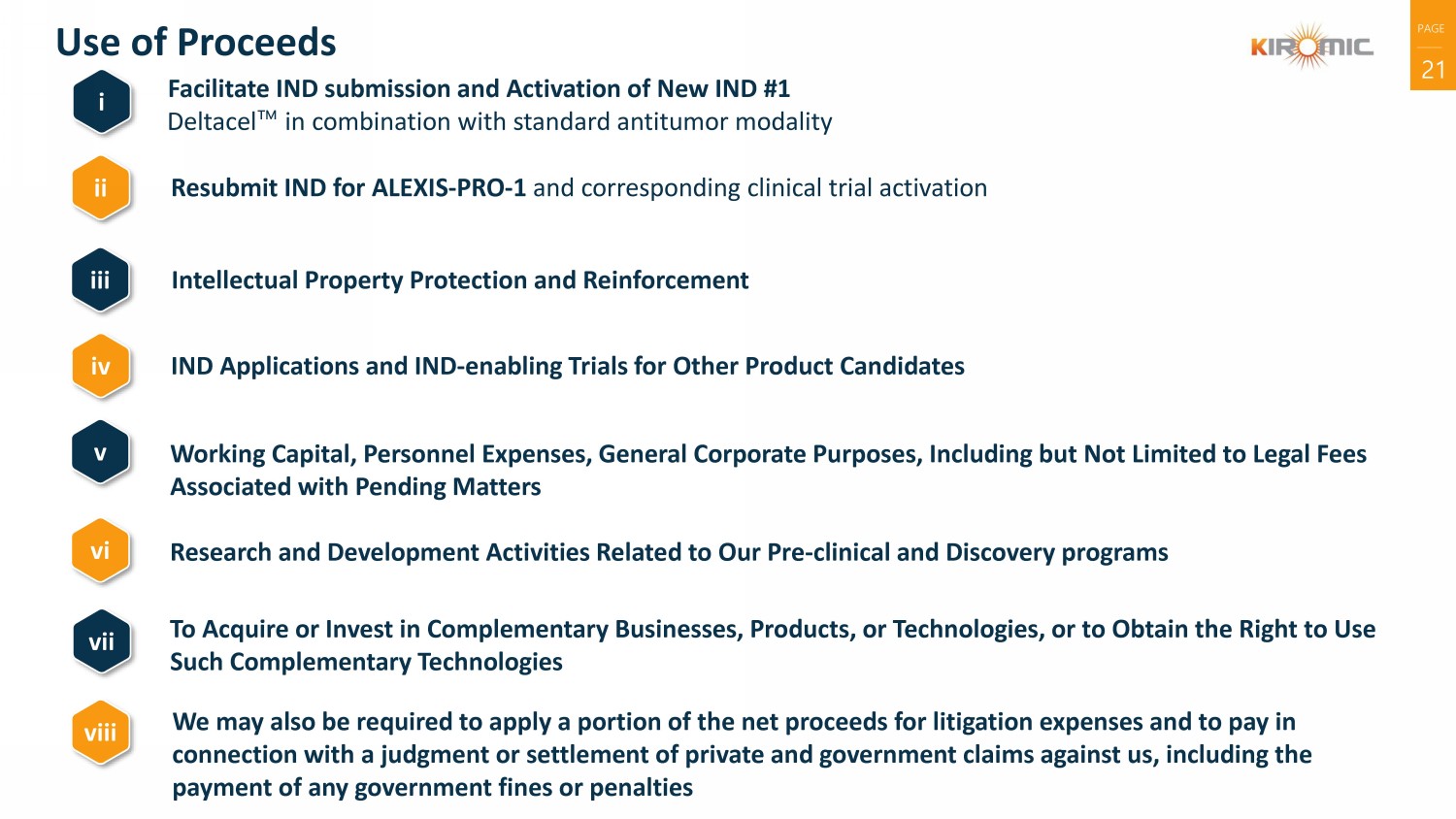 PAGE | 21 Use of Proceeds Facilitate IND submission and Activation of New IND #1 Deltacel Œ in combination with standard antitumor modality i Resubmit IND for ALEXIS - PRO - 1 and corresponding clinical trial activation ii IND Applications and IND - enabling Trials for Other Product Candidates iv Intellectual Property Protection and Reinforcement iii Working Capital, Personnel Expenses, General Corporate Purposes, Including but Not Limited to Legal Fees Associated with Pending Matters Research and Development Activities Related to Our Pre - clinical and Discovery programs To Acquire or Invest in Complementary Businesses, Products, or Technologies, or to Obtain the Right to Use Such Complementary Technologies v vi vii We may also be required to apply a portion of the net proceeds for litigation expenses and to pay in connection with a judgment or settlement of private and government claims against us, including the payment of any government fines or penalties viii