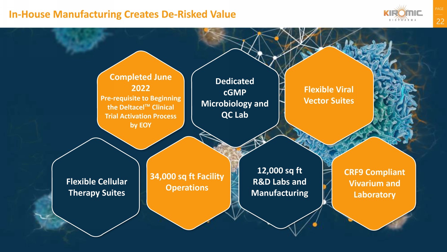 PAGE | 22 In - House Manufacturing Creates De - Risked Value Flexible Cellular Therapy Suites Flexible Viral Vector Suites 34,000 sq ft Facility Operations 12,000 sq ft R&D Labs and Manufacturing Dedicated cGMP Microbiology and QC Lab CRF9 Compliant Vivarium and Laboratory Completed June 2022 Pre - requisite to Beginning the Deltacel ‹ Clinical Trial Activation Process by EOY
