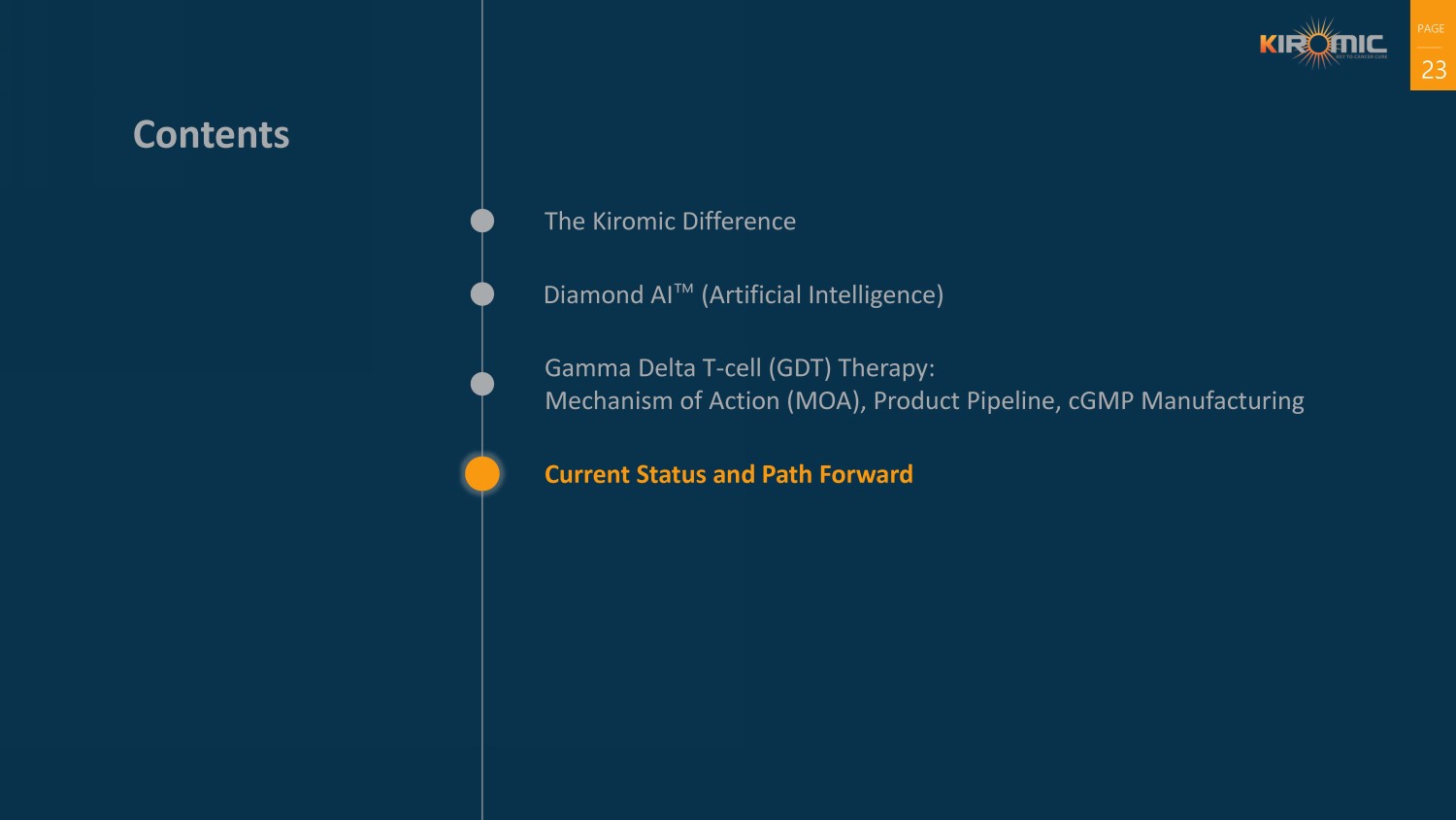PAGE | 23 Contents Gamma Delta T - cell (GDT) Therapy: Mechanism of Action (MOA), Product Pipeline, cGMP Manufacturing Current Status and Path Forward The Kiromic Difference Diamond AI Œ (Artificial Intelligence)