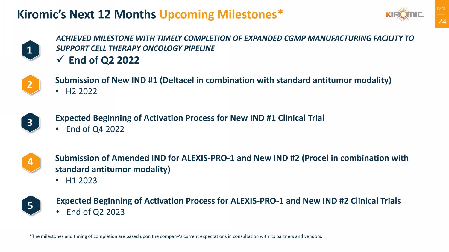 PAGE | 24 Kiromic’s Next 12 Months Upcoming Milestones* * The milestones and timing of completion are based upon the company’s current expectations in consultation with its partners a nd vendors. ACHIEVED MILESTONE WITH TIMELY COMPLETION OF EXPANDED CGMP MANUFACTURING FACILITY TO SUPPORT CELL THERAPY ONCOLOGY PIPELINE x End of Q2 2022 1 Submission of New IND #1 (Deltacel in combination with standard antitumor modality) • H2 2022 2 5 3 Expected Beginning of Activation Process for New IND #1 Clinical Trial • End of Q4 2022 Submission of Amended IND for ALEXIS - PRO - 1 and New IND #2 (Procel in combination with standard antitumor modality) • H1 2023 4 5 Expected Beginning of Activation Process for ALEXIS - PRO - 1 and New IND #2 Clinical Trials • End of Q2 2023