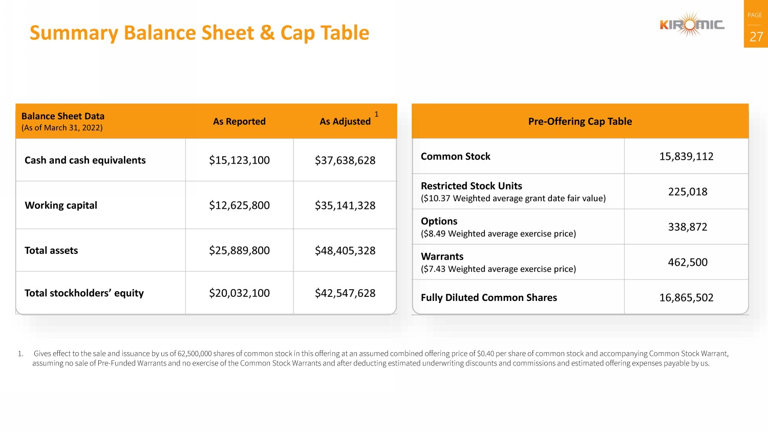 PAGE | 27 Summary Balance Sheet & Cap Table 1. Gives effect to the sale and issuance by us of 62,500,000 shares of common stock in this offering at an assumed combined offe ri ng price of $0.40 per share of common stock and accompanying Common Stock Warrant, assuming no sale of Pre - Funded Warrants and no exercise of the Common Stock Warrants and after deducting estimate d underwriting discounts and commissions and estimated offering expenses payable by us. Pre - Offering Cap Table Common Stock 15,839,112 Restricted Stock Units ($10.37 Weighted average grant date fair value) 225,018 Options ($8.49 Weighted average exercise price) 338,872 Warrants ($7.43 Weighted average exercise price) 462,500 Fully Diluted Common Shares 16,865,502 Balance Sheet Data (As of March 31, 2022) As Reported As Adjusted Cash and cash equivalents $15,123,100 $37,638,628 Working capital $12,625,800 $35,141,328 Total assets $25,889,800 $48,405,328 Total stockholders’ equity $20,032,100 $42,547,628 1