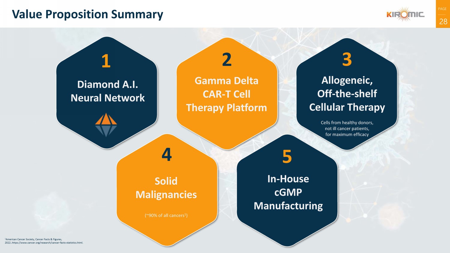 PAGE | 28 1 American Cancer Society, Cancer Facts & Figures, 2022..https://www.cancer.org/research/cancer - facts - statistics.html. 1 2 3 Value Proposition Summary Gamma Delta CAR - T Cell Therapy Platform In - House cGMP Manufacturing Diamond A.I. Neural Network 4 5 Solid Malignancies (~90% of all cancers 1 ) Allogeneic, Off - the - shelf Cellular Therapy Cells from healthy donors, not ill cancer patients, for maximum efficacy