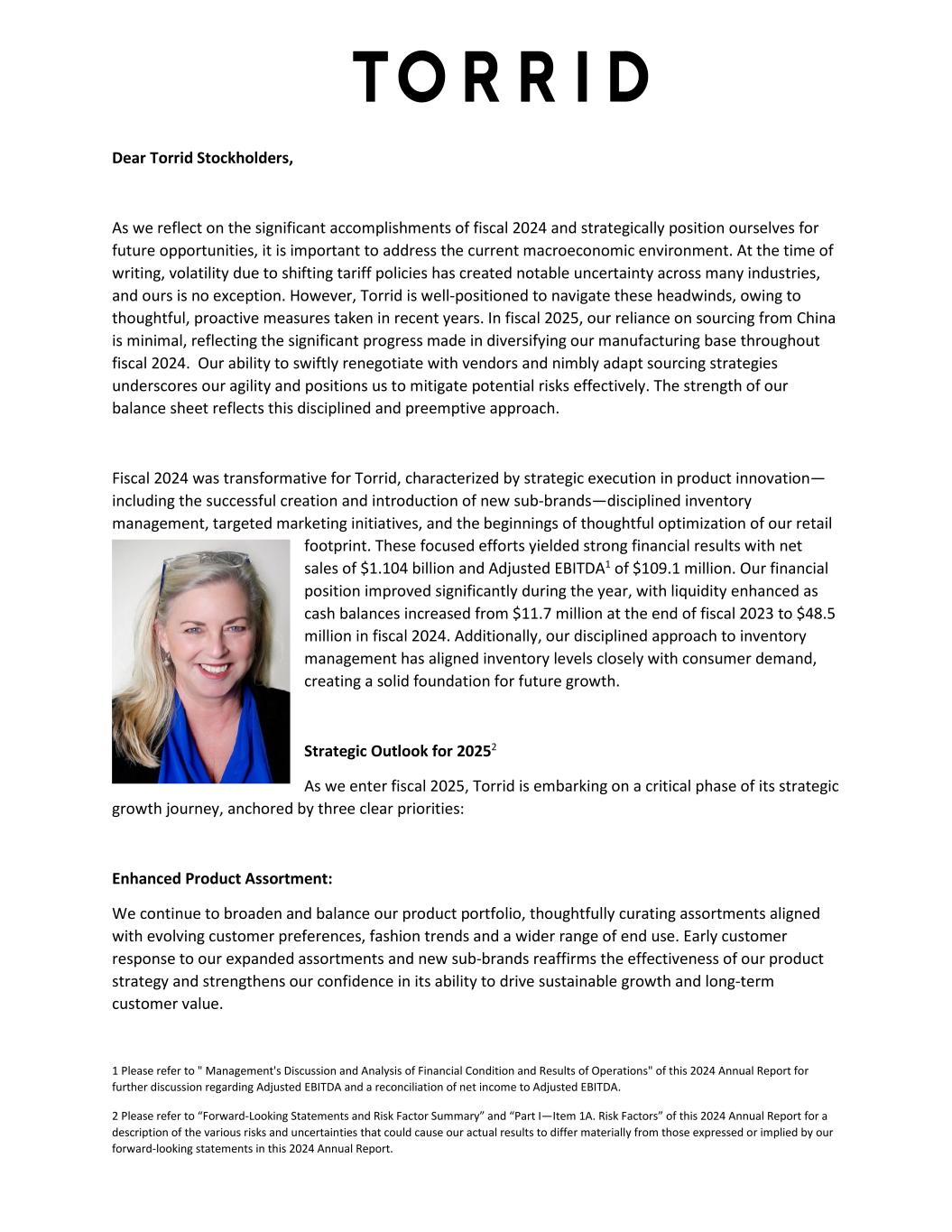 Dear Torrid Stockholders, As we reflect on the significant accomplishments of fiscal 2024 and strategically position ourselves for future opportunities, it is important to address the current macroeconomic environment. At the time of writing, volatility due to shifting tariff policies has created notable uncertainty across many industries, and ours is no exception. However, Torrid is well-positioned to navigate these headwinds, owing to thoughtful, proactive measures taken in recent years. In fiscal 2025, our reliance on sourcing from China is minimal, reflecting the significant progress made in diversifying our manufacturing base throughout fiscal 2024. Our ability to swiftly renegotiate with vendors and nimbly adapt sourcing strategies underscores our agility and positions us to mitigate potential risks effectively. The strength of our balance sheet reflects this disciplined and preemptive approach. Fiscal 2024 was transformative for Torrid, characterized by strategic execution in product innovation— including the successful creation and introduction of new sub-brands—disciplined inventory management, targeted marketing initiatives, and the beginnings of thoughtful optimization of our retail footprint. These focused efforts yielded strong financial results with net sales of $1.104 billion and Adjusted EBITDA1 of $109.1 million. Our financial position improved significantly during the year, with liquidity enhanced as cash balances increased from $11.7 million at the end of fiscal 2023 to $48.5 million in fiscal 2024. Additionally, our disciplined approach to inventory management has aligned inventory levels closely with consumer demand, creating a solid foundation for future growth. Strategic Outlook for 20252 As we enter fiscal 2025, Torrid is embarking on a critical phase of its strategic growth journey, anchored by three clear priorities: Enhanced Product Assortment: We continue to broaden and balance our product portfolio, thoughtfully curating assortments aligned with evolving customer preferences, fashion trends and a wider range of end use. Early customer response to our expanded assortments and new sub-brands reaffirms the effectiveness of our product strategy and strengthens our confidence in its ability to drive sustainable growth and long-term customer value. 1 Please refer to " Management's Discussion and Analysis of Financial Condition and Results of Operations" of this 2024 Annual Report for further discussion regarding Adjusted EBITDA and a reconciliation of net income to Adjusted EBITDA. 2 Please refer to “Forward-Looking Statements and Risk Factor Summary” and “Part I—Item 1A. Risk Factors” of this 2024 Annual Report for a description of the various risks and uncertainties that could cause our actual results to differ materially from those expressed or implied by our forward-looking statements in this 2024 Annual Report.
