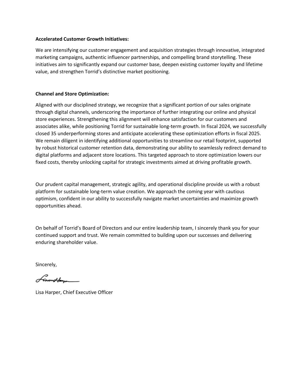 Accelerated Customer Growth Initiatives: We are intensifying our customer engagement and acquisition strategies through innovative, integrated marketing campaigns, authentic influencer partnerships, and compelling brand storytelling. These initiatives aim to significantly expand our customer base, deepen existing customer loyalty and lifetime value, and strengthen Torrid’s distinctive market positioning. Channel and Store Optimization: Aligned with our disciplined strategy, we recognize that a significant portion of our sales originate through digital channels, underscoring the importance of further integrating our online and physical store experiences. Strengthening this alignment will enhance satisfaction for our customers and associates alike, while positioning Torrid for sustainable long-term growth. In fiscal 2024, we successfully closed 35 underperforming stores and anticipate accelerating these optimization efforts in fiscal 2025. We remain diligent in identifying additional opportunities to streamline our retail footprint, supported by robust historical customer retention data, demonstrating our ability to seamlessly redirect demand to digital platforms and adjacent store locations. This targeted approach to store optimization lowers our fixed costs, thereby unlocking capital for strategic investments aimed at driving profitable growth. Our prudent capital management, strategic agility, and operational discipline provide us with a robust platform for sustainable long-term value creation. We approach the coming year with cautious optimism, confident in our ability to successfully navigate market uncertainties and maximize growth opportunities ahead. On behalf of Torrid’s Board of Directors and our entire leadership team, I sincerely thank you for your continued support and trust. We remain committed to building upon our successes and delivering enduring shareholder value. Sincerely, Lisa Harper, Chief Executive Officer