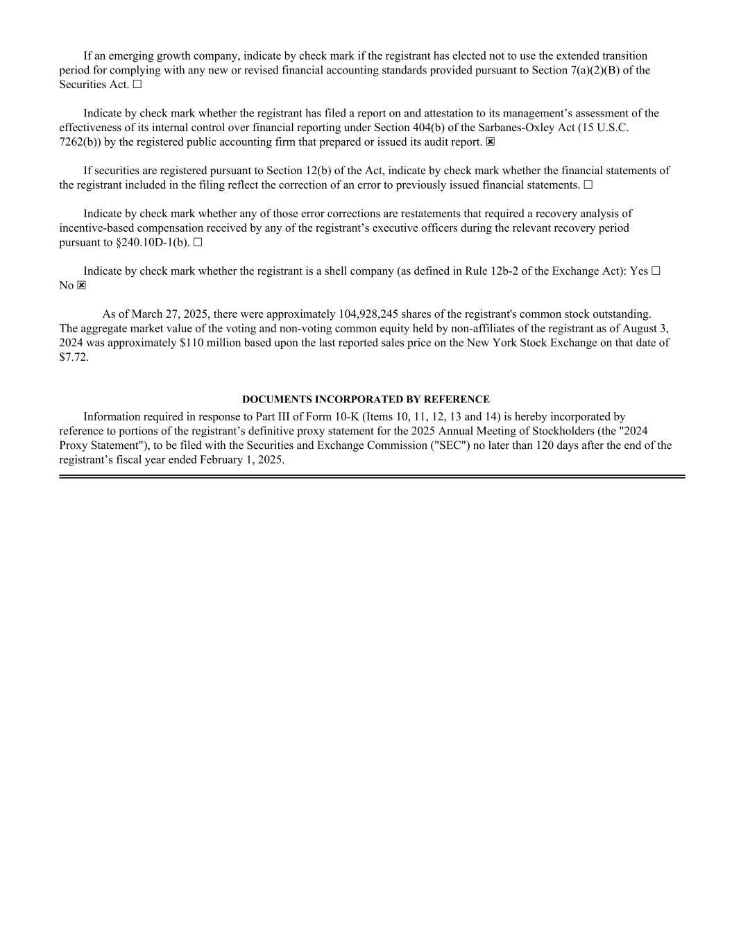 If an emerging growth company, indicate by check mark if the registrant has elected not to use the extended transition period for complying with any new or revised financial accounting standards provided pursuant to Section 7(a)(2)(B) of the Securities Act. ☐ Indicate by check mark whether the registrant has filed a report on and attestation to its management’s assessment of the effectiveness of its internal control over financial reporting under Section 404(b) of the Sarbanes-Oxley Act (15 U.S.C. 7262(b)) by the registered public accounting firm that prepared or issued its audit report. ☒ If securities are registered pursuant to Section 12(b) of the Act, indicate by check mark whether the financial statements of the registrant included in the filing reflect the correction of an error to previously issued financial statements. ☐ Indicate by check mark whether any of those error corrections are restatements that required a recovery analysis of incentive-based compensation received by any of the registrant’s executive officers during the relevant recovery period pursuant to §240.10D-1(b). ☐ Indicate by check mark whether the registrant is a shell company (as defined in Rule 12b-2 of the Exchange Act): Yes ☐ No ☒ As of March 27, 2025, there were approximately 104,928,245 shares of the registrant's common stock outstanding. The aggregate market value of the voting and non-voting common equity held by non-affiliates of the registrant as of August 3, 2024 was approximately $110 million based upon the last reported sales price on the New York Stock Exchange on that date of $7.72. DOCUMENTS INCORPORATED BY REFERENCE Information required in response to Part III of Form 10-K (Items 10, 11, 12, 13 and 14) is hereby incorporated by reference to portions of the registrant’s definitive proxy statement for the 2025 Annual Meeting of Stockholders (the "2024 Proxy Statement"), to be filed with the Securities and Exchange Commission ("SEC") no later than 120 days after the end of the registrant’s fiscal year ended February 1, 2025.