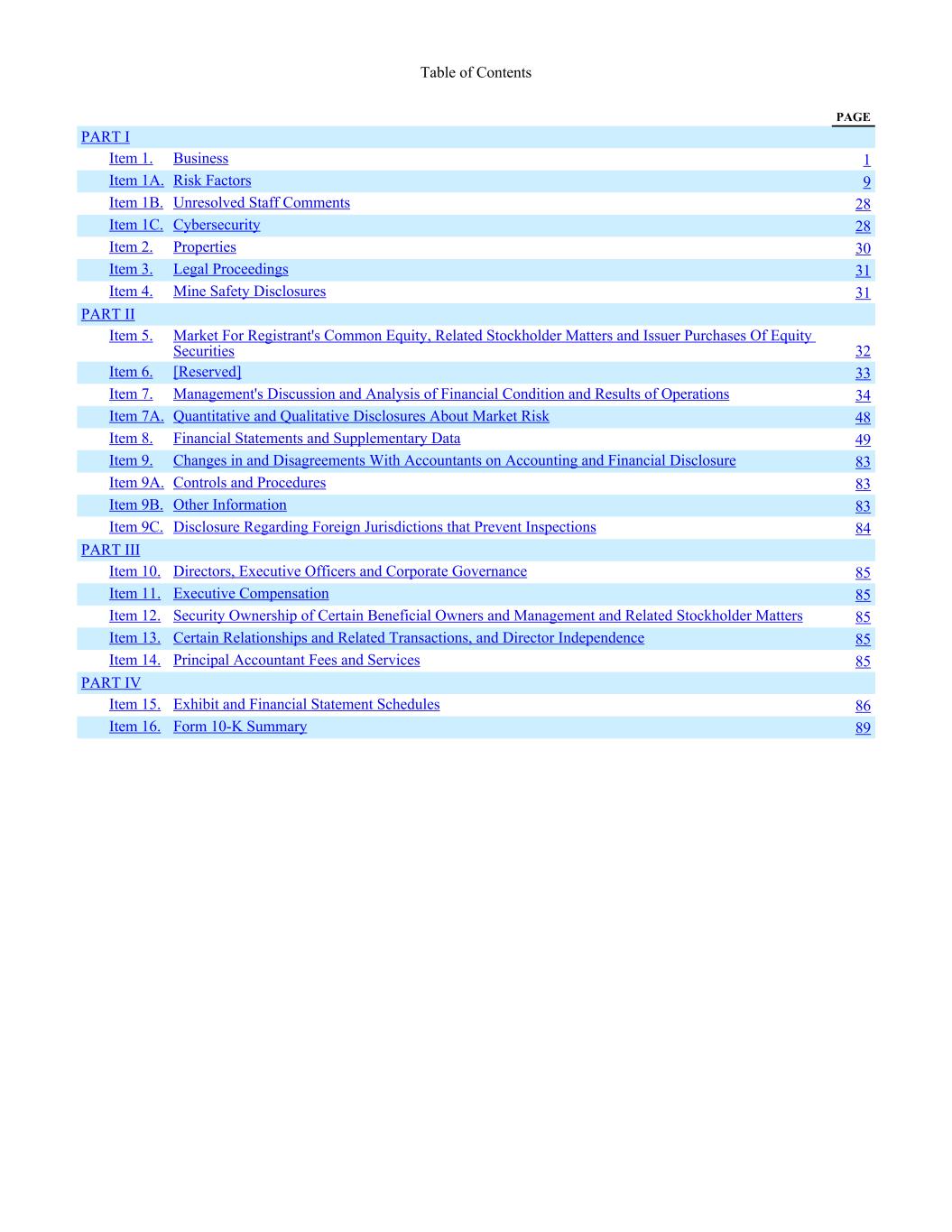 Table of Contents PAGE PART I Item 1. Business 1 Item 1A. Risk Factors 9 Item 1B. Unresolved Staff Comments 28 Item 1C. Cybersecurity 28 Item 2. Properties 30 Item 3. Legal Proceedings 31 Item 4. Mine Safety Disclosures 31 PART II Item 5. Market For Registrant's Common Equity, Related Stockholder Matters and Issuer Purchases Of Equity Securities 32 Item 6. [Reserved] 33 Item 7. Management's Discussion and Analysis of Financial Condition and Results of Operations 34 Item 7A. Quantitative and Qualitative Disclosures About Market Risk 48 Item 8. Financial Statements and Supplementary Data 49 Item 9. Changes in and Disagreements With Accountants on Accounting and Financial Disclosure 83 Item 9A. Controls and Procedures 83 Item 9B. Other Information 83 Item 9C. Disclosure Regarding Foreign Jurisdictions that Prevent Inspections 84 PART III Item 10. Directors, Executive Officers and Corporate Governance 85 Item 11. Executive Compensation 85 Item 12. Security Ownership of Certain Beneficial Owners and Management and Related Stockholder Matters 85 Item 13. Certain Relationships and Related Transactions, and Director Independence 85 Item 14. Principal Accountant Fees and Services 85 PART IV Item 15. Exhibit and Financial Statement Schedules 86 Item 16. Form 10-K Summary 89