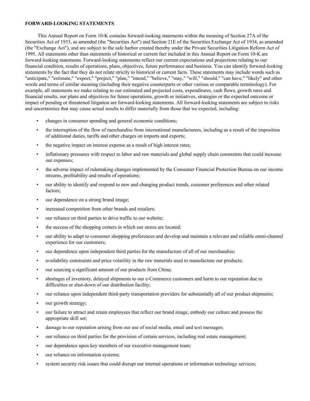 FORWARD-LOOKING STATEMENTS This Annual Report on Form 10-K contains forward-looking statements within the meaning of Section 27A of the Securities Act of 1933, as amended (the "Securities Act") and Section 21E of the Securities Exchange Act of 1934, as amended (the "Exchange Act"), and are subject to the safe harbor created thereby under the Private Securities Litigation Reform Act of 1995. All statements other than statements of historical or current fact included in this Annual Report on Form 10-K are forward-looking statements. Forward-looking statements reflect our current expectations and projections relating to our financial condition, results of operations, plans, objectives, future performance and business. You can identify forward-looking statements by the fact that they do not relate strictly to historical or current facts. These statements may include words such as "anticipate," "estimate," "expect," "project," "plan," "intend," "believe," "may," "will," "should," "can have," "likely" and other words and terms of similar meaning (including their negative counterparts or other various or comparable terminology). For example, all statements we make relating to our estimated and projected costs, expenditures, cash flows, growth rates and financial results, our plans and objectives for future operations, growth or initiatives, strategies or the expected outcome or impact of pending or threatened litigation are forward-looking statements. All forward-looking statements are subject to risks and uncertainties that may cause actual results to differ materially from those that we expected, including: • changes in consumer spending and general economic conditions; • the interruption of the flow of merchandise from international manufacturers, including as a result of the imposition of additional duties, tariffs and other charges on imports and exports; • the negative impact on interest expense as a result of high interest rates; • inflationary pressures with respect to labor and raw materials and global supply chain constraints that could increase our expenses; • the adverse impact of rulemaking changes implemented by the Consumer Financial Protection Bureau on our income streams, profitability and results of operations; • our ability to identify and respond to new and changing product trends, customer preferences and other related factors; • our dependence on a strong brand image; • increased competition from other brands and retailers; • our reliance on third parties to drive traffic to our website; • the success of the shopping centers in which our stores are located; • our ability to adapt to consumer shopping preferences and develop and maintain a relevant and reliable omni-channel experience for our customers; • our dependence upon independent third parties for the manufacture of all of our merchandise; • availability constraints and price volatility in the raw materials used to manufacture our products; • our sourcing a significant amount of our products from China; • shortages of inventory, delayed shipments to our e-Commerce customers and harm to our reputation due to difficulties or shut-down of our distribution facility; • our reliance upon independent third-party transportation providers for substantially all of our product shipments; • our growth strategy; • our failure to attract and retain employees that reflect our brand image, embody our culture and possess the appropriate skill set; • damage to our reputation arising from our use of social media, email and text messages; • our reliance on third parties for the provision of certain services, including real estate management; • our dependence upon key members of our executive management team; • our reliance on information systems; • system security risk issues that could disrupt our internal operations or information technology services;