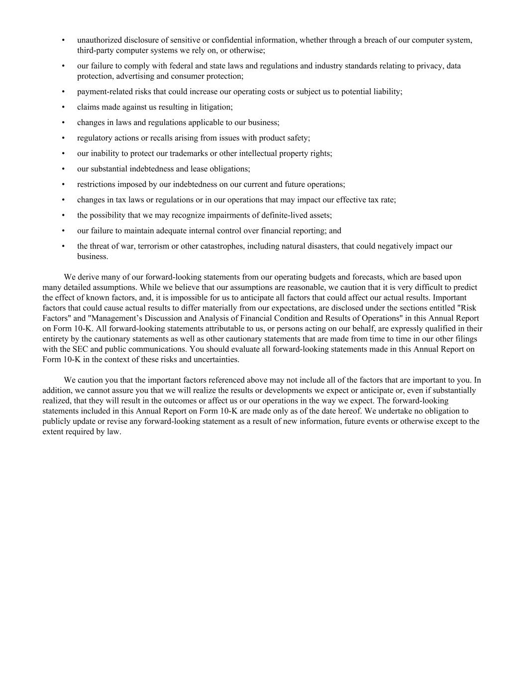 • unauthorized disclosure of sensitive or confidential information, whether through a breach of our computer system, third-party computer systems we rely on, or otherwise; • our failure to comply with federal and state laws and regulations and industry standards relating to privacy, data protection, advertising and consumer protection; • payment-related risks that could increase our operating costs or subject us to potential liability; • claims made against us resulting in litigation; • changes in laws and regulations applicable to our business; • regulatory actions or recalls arising from issues with product safety; • our inability to protect our trademarks or other intellectual property rights; • our substantial indebtedness and lease obligations; • restrictions imposed by our indebtedness on our current and future operations; • changes in tax laws or regulations or in our operations that may impact our effective tax rate; • the possibility that we may recognize impairments of definite-lived assets; • our failure to maintain adequate internal control over financial reporting; and • the threat of war, terrorism or other catastrophes, including natural disasters, that could negatively impact our business. We derive many of our forward-looking statements from our operating budgets and forecasts, which are based upon many detailed assumptions. While we believe that our assumptions are reasonable, we caution that it is very difficult to predict the effect of known factors, and, it is impossible for us to anticipate all factors that could affect our actual results. Important factors that could cause actual results to differ materially from our expectations, are disclosed under the sections entitled "Risk Factors" and "Management’s Discussion and Analysis of Financial Condition and Results of Operations" in this Annual Report on Form 10-K. All forward-looking statements attributable to us, or persons acting on our behalf, are expressly qualified in their entirety by the cautionary statements as well as other cautionary statements that are made from time to time in our other filings with the SEC and public communications. You should evaluate all forward-looking statements made in this Annual Report on Form 10-K in the context of these risks and uncertainties. We caution you that the important factors referenced above may not include all of the factors that are important to you. In addition, we cannot assure you that we will realize the results or developments we expect or anticipate or, even if substantially realized, that they will result in the outcomes or affect us or our operations in the way we expect. The forward-looking statements included in this Annual Report on Form 10-K are made only as of the date hereof. We undertake no obligation to publicly update or revise any forward-looking statement as a result of new information, future events or otherwise except to the extent required by law.