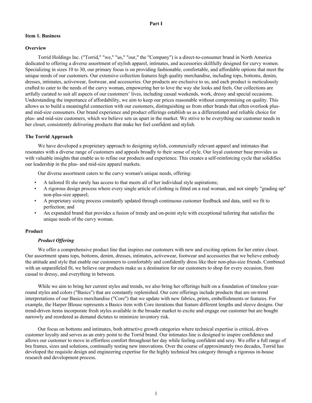 Part I Item 1. Business Overview Torrid Holdings Inc. ("Torrid," "we," "us," "our," the "Company") is a direct-to-consumer brand in North America dedicated to offering a diverse assortment of stylish apparel, intimates, and accessories skillfully designed for curvy women. Specializing in sizes 10 to 30, our primary focus is on providing fashionable, comfortable, and affordable options that meet the unique needs of our customers. Our extensive collection features high quality merchandise, including tops, bottoms, denim, dresses, intimates, activewear, footwear, and accessories. Our products are exclusive to us, and each product is meticulously crafted to cater to the needs of the curvy woman, empowering her to love the way she looks and feels. Our collections are artfully curated to suit all aspects of our customers’ lives, including casual weekends, work, dressy and special occasions. Understanding the importance of affordability, we aim to keep our prices reasonable without compromising on quality. This allows us to build a meaningful connection with our customers, distinguishing us from other brands that often overlook plus- and mid-size consumers. Our brand experience and product offerings establish us as a differentiated and reliable choice for plus- and mid-size customers, which we believe sets us apart in the market. We strive to be everything our customer needs in her closet, consistently delivering products that make her feel confident and stylish. The Torrid Approach We have developed a proprietary approach to designing stylish, commercially relevant apparel and intimates that resonates with a diverse range of customers and appeals broadly to their sense of style. Our loyal customer base provides us with valuable insights that enable us to refine our products and experience. This creates a self-reinforcing cycle that solidifies our leadership in the plus- and mid-size apparel markets. Our diverse assortment caters to the curvy woman's unique needs, offering: • A tailored fit she rarely has access to that meets all of her individual style aspirations; • A rigorous design process where every single article of clothing is fitted on a real woman, and not simply "grading up" non-plus-size apparel; • A proprietary sizing process constantly updated through continuous customer feedback and data, until we fit to perfection; and • An expanded brand that provides a fusion of trendy and on-point style with exceptional tailoring that satisfies the unique needs of the curvy woman. Product Product Offering We offer a comprehensive product line that inspires our customers with new and exciting options for her entire closet. Our assortment spans tops, bottoms, denim, dresses, intimates, activewear, footwear and accessories that we believe embody the attitude and style that enable our customers to comfortably and confidently dress like their non-plus-size friends. Combined with an unparalleled fit, we believe our products make us a destination for our customers to shop for every occasion, from casual to dressy, and everything in between. While we aim to bring her current styles and trends, we also bring her offerings built on a foundation of timeless year- round styles and colors ("Basics") that are constantly replenished. Our core offerings include products that are on-trend interpretations of our Basics merchandise ("Core") that we update with new fabrics, prints, embellishments or features. For example, the Harper Blouse represents a Basics item with Core iterations that feature different lengths and sleeve designs. Our trend-driven items incorporate fresh styles available in the broader market to excite and engage our customer but are bought narrowly and reordered as demand dictates to minimize inventory risk. Our focus on bottoms and intimates, both attractive growth categories where technical expertise is critical, drives customer loyalty and serves as an entry point to the Torrid brand. Our intimates line is designed to inspire confidence and allows our customer to move in effortless comfort throughout her day while feeling confident and sexy. We offer a full range of bra frames, sizes and solutions, continually testing new innovations. Over the course of approximately two decades, Torrid has developed the requisite design and engineering expertise for the highly technical bra category through a rigorous in-house research and development process. 1