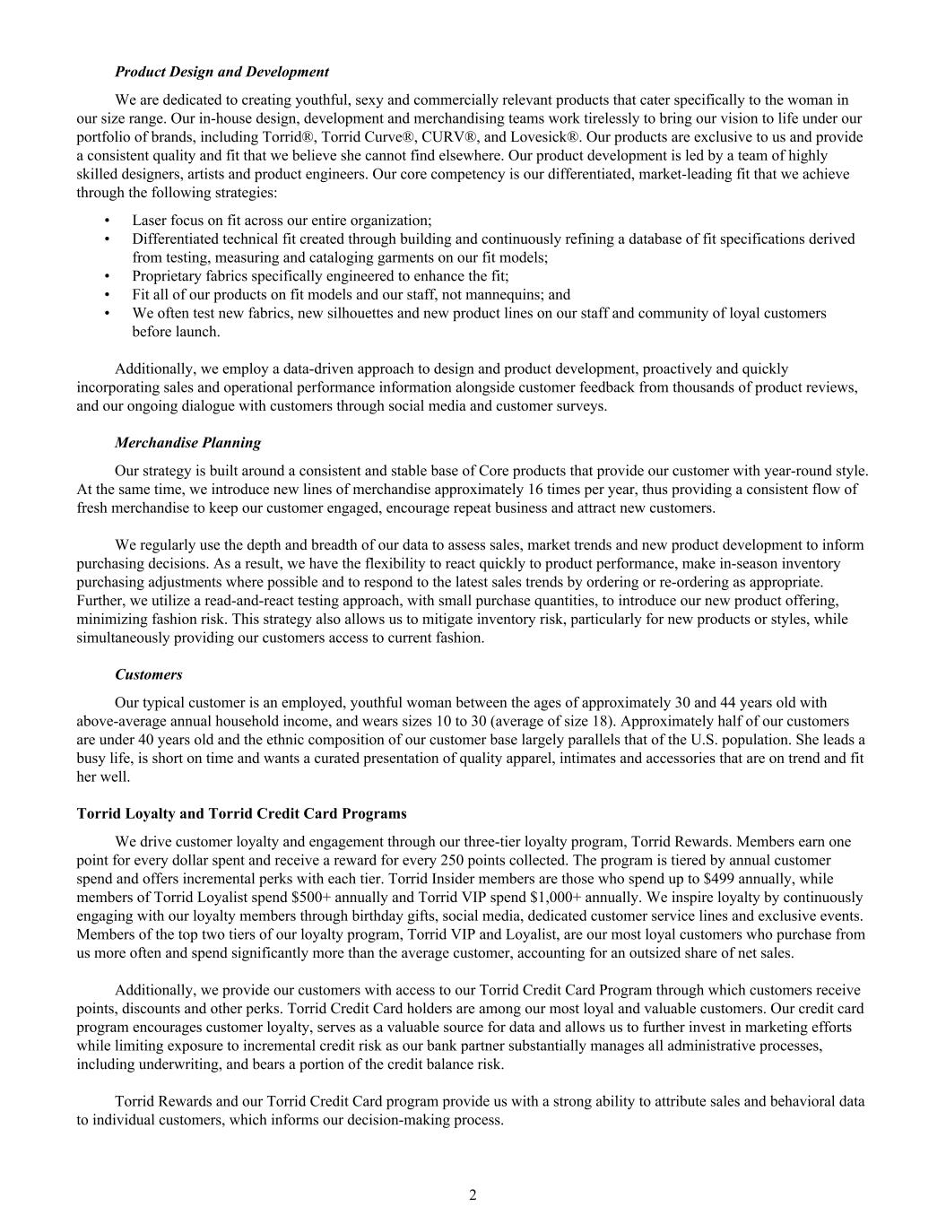Product Design and Development We are dedicated to creating youthful, sexy and commercially relevant products that cater specifically to the woman in our size range. Our in-house design, development and merchandising teams work tirelessly to bring our vision to life under our portfolio of brands, including Torrid®, Torrid Curve®, CURV®, and Lovesick®. Our products are exclusive to us and provide a consistent quality and fit that we believe she cannot find elsewhere. Our product development is led by a team of highly skilled designers, artists and product engineers. Our core competency is our differentiated, market-leading fit that we achieve through the following strategies: • Laser focus on fit across our entire organization; • Differentiated technical fit created through building and continuously refining a database of fit specifications derived from testing, measuring and cataloging garments on our fit models; • Proprietary fabrics specifically engineered to enhance the fit; • Fit all of our products on fit models and our staff, not mannequins; and • We often test new fabrics, new silhouettes and new product lines on our staff and community of loyal customers before launch. Additionally, we employ a data-driven approach to design and product development, proactively and quickly incorporating sales and operational performance information alongside customer feedback from thousands of product reviews, and our ongoing dialogue with customers through social media and customer surveys. Merchandise Planning Our strategy is built around a consistent and stable base of Core products that provide our customer with year-round style. At the same time, we introduce new lines of merchandise approximately 16 times per year, thus providing a consistent flow of fresh merchandise to keep our customer engaged, encourage repeat business and attract new customers. We regularly use the depth and breadth of our data to assess sales, market trends and new product development to inform purchasing decisions. As a result, we have the flexibility to react quickly to product performance, make in-season inventory purchasing adjustments where possible and to respond to the latest sales trends by ordering or re-ordering as appropriate. Further, we utilize a read-and-react testing approach, with small purchase quantities, to introduce our new product offering, minimizing fashion risk. This strategy also allows us to mitigate inventory risk, particularly for new products or styles, while simultaneously providing our customers access to current fashion. Customers Our typical customer is an employed, youthful woman between the ages of approximately 30 and 44 years old with above-average annual household income, and wears sizes 10 to 30 (average of size 18). Approximately half of our customers are under 40 years old and the ethnic composition of our customer base largely parallels that of the U.S. population. She leads a busy life, is short on time and wants a curated presentation of quality apparel, intimates and accessories that are on trend and fit her well. Torrid Loyalty and Torrid Credit Card Programs We drive customer loyalty and engagement through our three-tier loyalty program, Torrid Rewards. Members earn one point for every dollar spent and receive a reward for every 250 points collected. The program is tiered by annual customer spend and offers incremental perks with each tier. Torrid Insider members are those who spend up to $499 annually, while members of Torrid Loyalist spend $500+ annually and Torrid VIP spend $1,000+ annually. We inspire loyalty by continuously engaging with our loyalty members through birthday gifts, social media, dedicated customer service lines and exclusive events. Members of the top two tiers of our loyalty program, Torrid VIP and Loyalist, are our most loyal customers who purchase from us more often and spend significantly more than the average customer, accounting for an outsized share of net sales. Additionally, we provide our customers with access to our Torrid Credit Card Program through which customers receive points, discounts and other perks. Torrid Credit Card holders are among our most loyal and valuable customers. Our credit card program encourages customer loyalty, serves as a valuable source for data and allows us to further invest in marketing efforts while limiting exposure to incremental credit risk as our bank partner substantially manages all administrative processes, including underwriting, and bears a portion of the credit balance risk. Torrid Rewards and our Torrid Credit Card program provide us with a strong ability to attribute sales and behavioral data to individual customers, which informs our decision-making process. 2