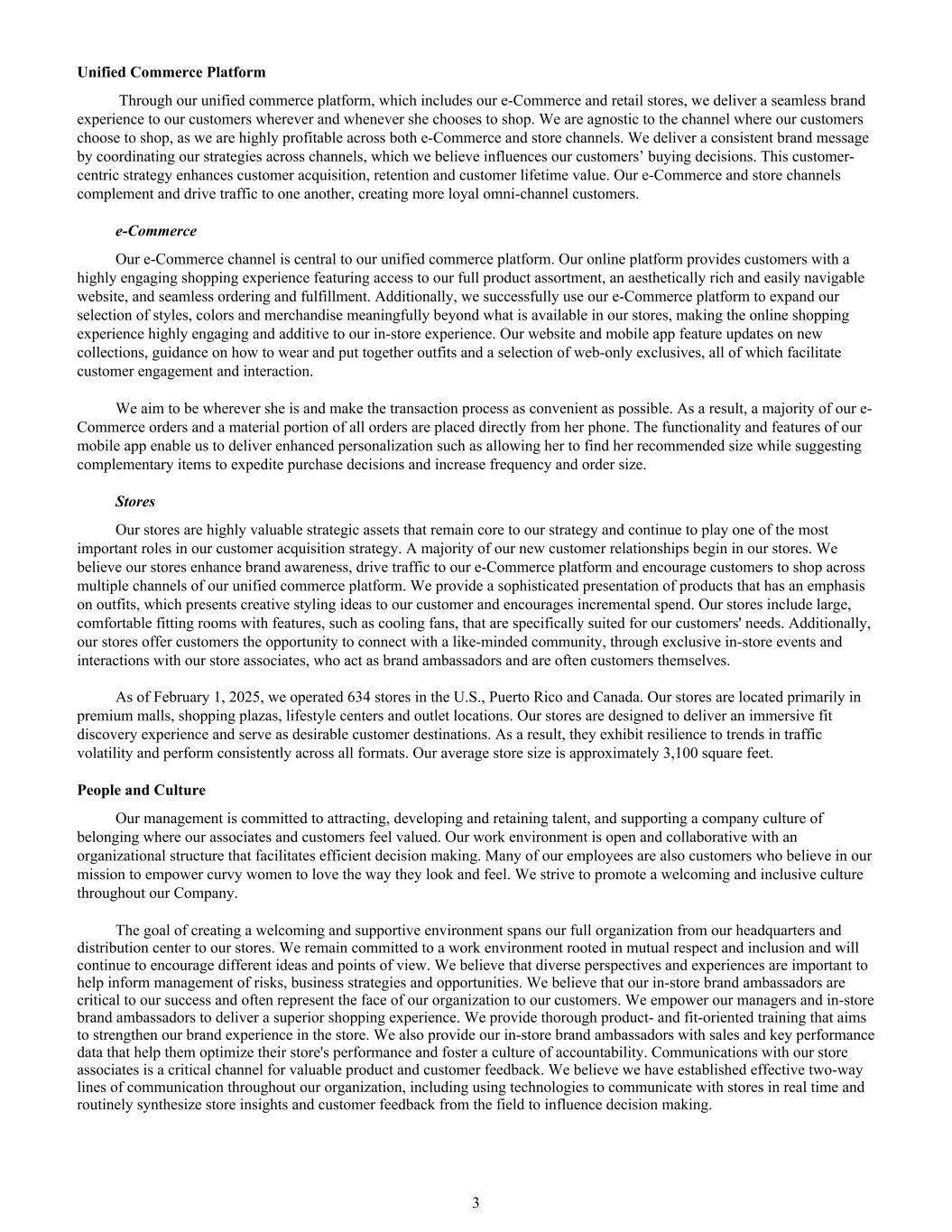Unified Commerce Platform Through our unified commerce platform, which includes our e-Commerce and retail stores, we deliver a seamless brand experience to our customers wherever and whenever she chooses to shop. We are agnostic to the channel where our customers choose to shop, as we are highly profitable across both e-Commerce and store channels. We deliver a consistent brand message by coordinating our strategies across channels, which we believe influences our customers’ buying decisions. This customer- centric strategy enhances customer acquisition, retention and customer lifetime value. Our e-Commerce and store channels complement and drive traffic to one another, creating more loyal omni-channel customers. e-Commerce Our e-Commerce channel is central to our unified commerce platform. Our online platform provides customers with a highly engaging shopping experience featuring access to our full product assortment, an aesthetically rich and easily navigable website, and seamless ordering and fulfillment. Additionally, we successfully use our e-Commerce platform to expand our selection of styles, colors and merchandise meaningfully beyond what is available in our stores, making the online shopping experience highly engaging and additive to our in-store experience. Our website and mobile app feature updates on new collections, guidance on how to wear and put together outfits and a selection of web-only exclusives, all of which facilitate customer engagement and interaction. We aim to be wherever she is and make the transaction process as convenient as possible. As a result, a majority of our e- Commerce orders and a material portion of all orders are placed directly from her phone. The functionality and features of our mobile app enable us to deliver enhanced personalization such as allowing her to find her recommended size while suggesting complementary items to expedite purchase decisions and increase frequency and order size. Stores Our stores are highly valuable strategic assets that remain core to our strategy and continue to play one of the most important roles in our customer acquisition strategy. A majority of our new customer relationships begin in our stores. We believe our stores enhance brand awareness, drive traffic to our e-Commerce platform and encourage customers to shop across multiple channels of our unified commerce platform. We provide a sophisticated presentation of products that has an emphasis on outfits, which presents creative styling ideas to our customer and encourages incremental spend. Our stores include large, comfortable fitting rooms with features, such as cooling fans, that are specifically suited for our customers' needs. Additionally, our stores offer customers the opportunity to connect with a like-minded community, through exclusive in-store events and interactions with our store associates, who act as brand ambassadors and are often customers themselves. As of February 1, 2025, we operated 634 stores in the U.S., Puerto Rico and Canada. Our stores are located primarily in premium malls, shopping plazas, lifestyle centers and outlet locations. Our stores are designed to deliver an immersive fit discovery experience and serve as desirable customer destinations. As a result, they exhibit resilience to trends in traffic volatility and perform consistently across all formats. Our average store size is approximately 3,100 square feet. People and Culture Our management is committed to attracting, developing and retaining talent, and supporting a company culture of belonging where our associates and customers feel valued. Our work environment is open and collaborative with an organizational structure that facilitates efficient decision making. Many of our employees are also customers who believe in our mission to empower curvy women to love the way they look and feel. We strive to promote a welcoming and inclusive culture throughout our Company. The goal of creating a welcoming and supportive environment spans our full organization from our headquarters and distribution center to our stores. We remain committed to a work environment rooted in mutual respect and inclusion and will continue to encourage different ideas and points of view. We believe that diverse perspectives and experiences are important to help inform management of risks, business strategies and opportunities. We believe that our in-store brand ambassadors are critical to our success and often represent the face of our organization to our customers. We empower our managers and in-store brand ambassadors to deliver a superior shopping experience. We provide thorough product- and fit-oriented training that aims to strengthen our brand experience in the store. We also provide our in-store brand ambassadors with sales and key performance data that help them optimize their store's performance and foster a culture of accountability. Communications with our store associates is a critical channel for valuable product and customer feedback. We believe we have established effective two-way lines of communication throughout our organization, including using technologies to communicate with stores in real time and routinely synthesize store insights and customer feedback from the field to influence decision making. 3