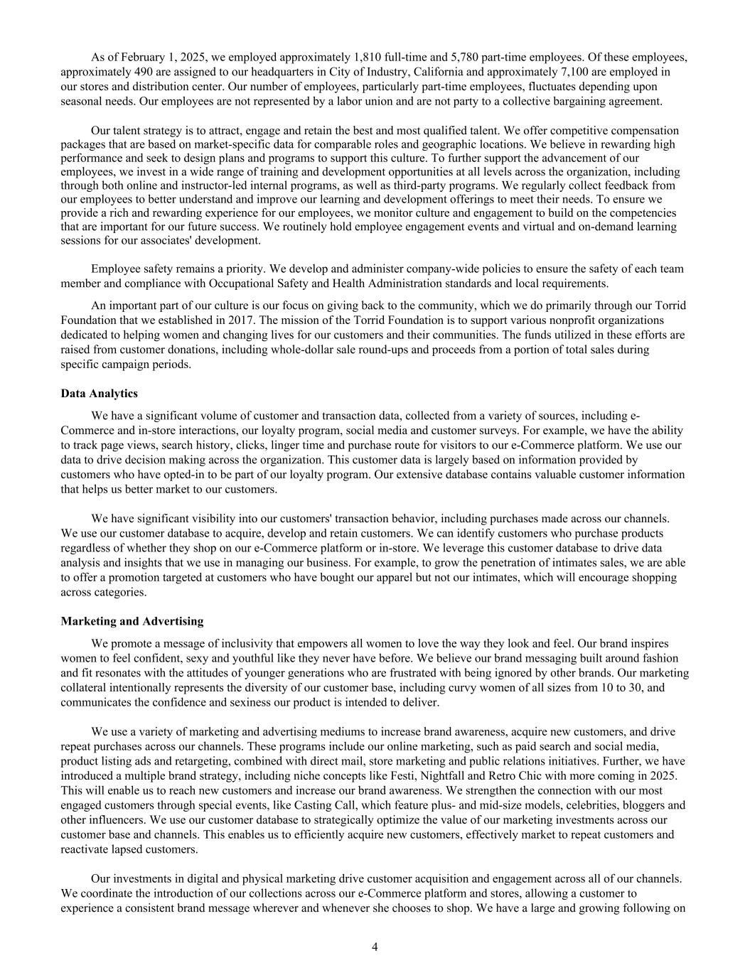 As of February 1, 2025, we employed approximately 1,810 full-time and 5,780 part-time employees. Of these employees, approximately 490 are assigned to our headquarters in City of Industry, California and approximately 7,100 are employed in our stores and distribution center. Our number of employees, particularly part-time employees, fluctuates depending upon seasonal needs. Our employees are not represented by a labor union and are not party to a collective bargaining agreement. Our talent strategy is to attract, engage and retain the best and most qualified talent. We offer competitive compensation packages that are based on market-specific data for comparable roles and geographic locations. We believe in rewarding high performance and seek to design plans and programs to support this culture. To further support the advancement of our employees, we invest in a wide range of training and development opportunities at all levels across the organization, including through both online and instructor-led internal programs, as well as third-party programs. We regularly collect feedback from our employees to better understand and improve our learning and development offerings to meet their needs. To ensure we provide a rich and rewarding experience for our employees, we monitor culture and engagement to build on the competencies that are important for our future success. We routinely hold employee engagement events and virtual and on-demand learning sessions for our associates' development. Employee safety remains a priority. We develop and administer company-wide policies to ensure the safety of each team member and compliance with Occupational Safety and Health Administration standards and local requirements. An important part of our culture is our focus on giving back to the community, which we do primarily through our Torrid Foundation that we established in 2017. The mission of the Torrid Foundation is to support various nonprofit organizations dedicated to helping women and changing lives for our customers and their communities. The funds utilized in these efforts are raised from customer donations, including whole-dollar sale round-ups and proceeds from a portion of total sales during specific campaign periods. Data Analytics We have a significant volume of customer and transaction data, collected from a variety of sources, including e- Commerce and in-store interactions, our loyalty program, social media and customer surveys. For example, we have the ability to track page views, search history, clicks, linger time and purchase route for visitors to our e-Commerce platform. We use our data to drive decision making across the organization. This customer data is largely based on information provided by customers who have opted-in to be part of our loyalty program. Our extensive database contains valuable customer information that helps us better market to our customers. We have significant visibility into our customers' transaction behavior, including purchases made across our channels. We use our customer database to acquire, develop and retain customers. We can identify customers who purchase products regardless of whether they shop on our e-Commerce platform or in-store. We leverage this customer database to drive data analysis and insights that we use in managing our business. For example, to grow the penetration of intimates sales, we are able to offer a promotion targeted at customers who have bought our apparel but not our intimates, which will encourage shopping across categories. Marketing and Advertising We promote a message of inclusivity that empowers all women to love the way they look and feel. Our brand inspires women to feel confident, sexy and youthful like they never have before. We believe our brand messaging built around fashion and fit resonates with the attitudes of younger generations who are frustrated with being ignored by other brands. Our marketing collateral intentionally represents the diversity of our customer base, including curvy women of all sizes from 10 to 30, and communicates the confidence and sexiness our product is intended to deliver. We use a variety of marketing and advertising mediums to increase brand awareness, acquire new customers, and drive repeat purchases across our channels. These programs include our online marketing, such as paid search and social media, product listing ads and retargeting, combined with direct mail, store marketing and public relations initiatives. Further, we have introduced a multiple brand strategy, including niche concepts like Festi, Nightfall and Retro Chic with more coming in 2025. This will enable us to reach new customers and increase our brand awareness. We strengthen the connection with our most engaged customers through special events, like Casting Call, which feature plus- and mid-size models, celebrities, bloggers and other influencers. We use our customer database to strategically optimize the value of our marketing investments across our customer base and channels. This enables us to efficiently acquire new customers, effectively market to repeat customers and reactivate lapsed customers. Our investments in digital and physical marketing drive customer acquisition and engagement across all of our channels. We coordinate the introduction of our collections across our e-Commerce platform and stores, allowing a customer to experience a consistent brand message wherever and whenever she chooses to shop. We have a large and growing following on 4