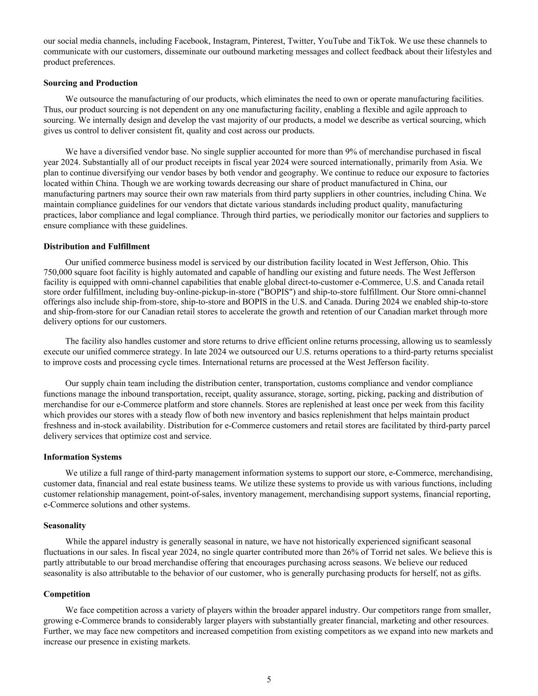 our social media channels, including Facebook, Instagram, Pinterest, Twitter, YouTube and TikTok. We use these channels to communicate with our customers, disseminate our outbound marketing messages and collect feedback about their lifestyles and product preferences. Sourcing and Production We outsource the manufacturing of our products, which eliminates the need to own or operate manufacturing facilities. Thus, our product sourcing is not dependent on any one manufacturing facility, enabling a flexible and agile approach to sourcing. We internally design and develop the vast majority of our products, a model we describe as vertical sourcing, which gives us control to deliver consistent fit, quality and cost across our products. We have a diversified vendor base. No single supplier accounted for more than 9% of merchandise purchased in fiscal year 2024. Substantially all of our product receipts in fiscal year 2024 were sourced internationally, primarily from Asia. We plan to continue diversifying our vendor bases by both vendor and geography. We continue to reduce our exposure to factories located within China. Though we are working towards decreasing our share of product manufactured in China, our manufacturing partners may source their own raw materials from third party suppliers in other countries, including China. We maintain compliance guidelines for our vendors that dictate various standards including product quality, manufacturing practices, labor compliance and legal compliance. Through third parties, we periodically monitor our factories and suppliers to ensure compliance with these guidelines. Distribution and Fulfillment Our unified commerce business model is serviced by our distribution facility located in West Jefferson, Ohio. This 750,000 square foot facility is highly automated and capable of handling our existing and future needs. The West Jefferson facility is equipped with omni-channel capabilities that enable global direct-to-customer e-Commerce, U.S. and Canada retail store order fulfillment, including buy-online-pickup-in-store ("BOPIS") and ship-to-store fulfillment. Our Store omni-channel offerings also include ship-from-store, ship-to-store and BOPIS in the U.S. and Canada. During 2024 we enabled ship-to-store and ship-from-store for our Canadian retail stores to accelerate the growth and retention of our Canadian market through more delivery options for our customers. The facility also handles customer and store returns to drive efficient online returns processing, allowing us to seamlessly execute our unified commerce strategy. In late 2024 we outsourced our U.S. returns operations to a third-party returns specialist to improve costs and processing cycle times. International returns are processed at the West Jefferson facility. Our supply chain team including the distribution center, transportation, customs compliance and vendor compliance functions manage the inbound transportation, receipt, quality assurance, storage, sorting, picking, packing and distribution of merchandise for our e-Commerce platform and store channels. Stores are replenished at least once per week from this facility which provides our stores with a steady flow of both new inventory and basics replenishment that helps maintain product freshness and in-stock availability. Distribution for e-Commerce customers and retail stores are facilitated by third-party parcel delivery services that optimize cost and service. Information Systems We utilize a full range of third-party management information systems to support our store, e-Commerce, merchandising, customer data, financial and real estate business teams. We utilize these systems to provide us with various functions, including customer relationship management, point-of-sales, inventory management, merchandising support systems, financial reporting, e-Commerce solutions and other systems. Seasonality While the apparel industry is generally seasonal in nature, we have not historically experienced significant seasonal fluctuations in our sales. In fiscal year 2024, no single quarter contributed more than 26% of Torrid net sales. We believe this is partly attributable to our broad merchandise offering that encourages purchasing across seasons. We believe our reduced seasonality is also attributable to the behavior of our customer, who is generally purchasing products for herself, not as gifts. Competition We face competition across a variety of players within the broader apparel industry. Our competitors range from smaller, growing e-Commerce brands to considerably larger players with substantially greater financial, marketing and other resources. Further, we may face new competitors and increased competition from existing competitors as we expand into new markets and increase our presence in existing markets. 5