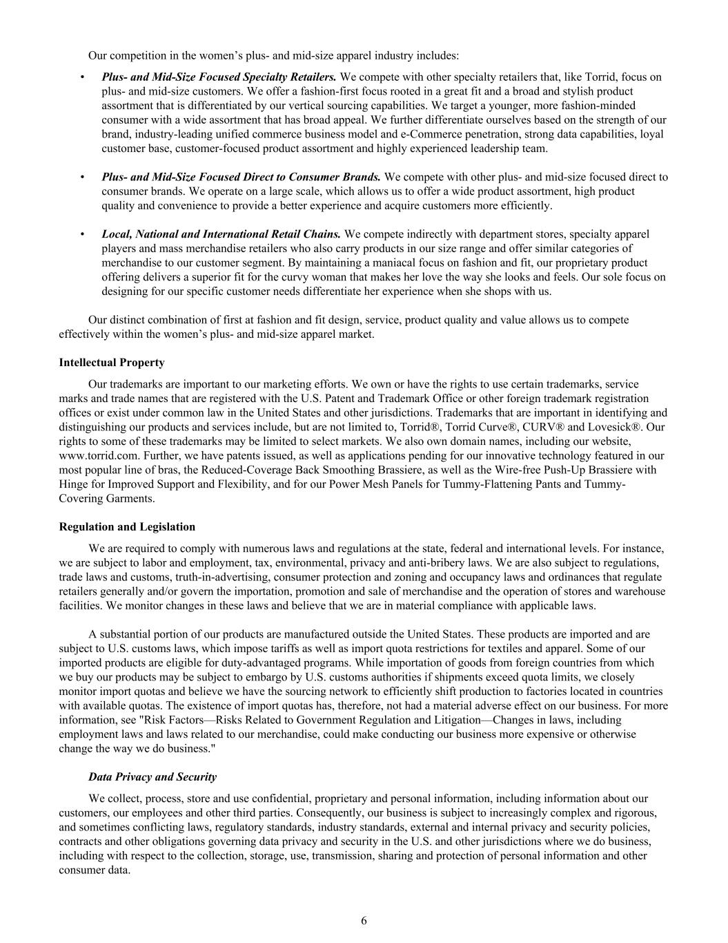 Our competition in the women’s plus- and mid-size apparel industry includes: • Plus- and Mid-Size Focused Specialty Retailers. We compete with other specialty retailers that, like Torrid, focus on plus- and mid-size customers. We offer a fashion-first focus rooted in a great fit and a broad and stylish product assortment that is differentiated by our vertical sourcing capabilities. We target a younger, more fashion-minded consumer with a wide assortment that has broad appeal. We further differentiate ourselves based on the strength of our brand, industry-leading unified commerce business model and e-Commerce penetration, strong data capabilities, loyal customer base, customer-focused product assortment and highly experienced leadership team. • Plus- and Mid-Size Focused Direct to Consumer Brands. We compete with other plus- and mid-size focused direct to consumer brands. We operate on a large scale, which allows us to offer a wide product assortment, high product quality and convenience to provide a better experience and acquire customers more efficiently. • Local, National and International Retail Chains. We compete indirectly with department stores, specialty apparel players and mass merchandise retailers who also carry products in our size range and offer similar categories of merchandise to our customer segment. By maintaining a maniacal focus on fashion and fit, our proprietary product offering delivers a superior fit for the curvy woman that makes her love the way she looks and feels. Our sole focus on designing for our specific customer needs differentiate her experience when she shops with us. Our distinct combination of first at fashion and fit design, service, product quality and value allows us to compete effectively within the women’s plus- and mid-size apparel market. Intellectual Property Our trademarks are important to our marketing efforts. We own or have the rights to use certain trademarks, service marks and trade names that are registered with the U.S. Patent and Trademark Office or other foreign trademark registration offices or exist under common law in the United States and other jurisdictions. Trademarks that are important in identifying and distinguishing our products and services include, but are not limited to, Torrid®, Torrid Curve®, CURV® and Lovesick®. Our rights to some of these trademarks may be limited to select markets. We also own domain names, including our website, www.torrid.com. Further, we have patents issued, as well as applications pending for our innovative technology featured in our most popular line of bras, the Reduced-Coverage Back Smoothing Brassiere, as well as the Wire-free Push-Up Brassiere with Hinge for Improved Support and Flexibility, and for our Power Mesh Panels for Tummy-Flattening Pants and Tummy- Covering Garments. Regulation and Legislation We are required to comply with numerous laws and regulations at the state, federal and international levels. For instance, we are subject to labor and employment, tax, environmental, privacy and anti-bribery laws. We are also subject to regulations, trade laws and customs, truth-in-advertising, consumer protection and zoning and occupancy laws and ordinances that regulate retailers generally and/or govern the importation, promotion and sale of merchandise and the operation of stores and warehouse facilities. We monitor changes in these laws and believe that we are in material compliance with applicable laws. A substantial portion of our products are manufactured outside the United States. These products are imported and are subject to U.S. customs laws, which impose tariffs as well as import quota restrictions for textiles and apparel. Some of our imported products are eligible for duty-advantaged programs. While importation of goods from foreign countries from which we buy our products may be subject to embargo by U.S. customs authorities if shipments exceed quota limits, we closely monitor import quotas and believe we have the sourcing network to efficiently shift production to factories located in countries with available quotas. The existence of import quotas has, therefore, not had a material adverse effect on our business. For more information, see "Risk Factors—Risks Related to Government Regulation and Litigation—Changes in laws, including employment laws and laws related to our merchandise, could make conducting our business more expensive or otherwise change the way we do business." Data Privacy and Security We collect, process, store and use confidential, proprietary and personal information, including information about our customers, our employees and other third parties. Consequently, our business is subject to increasingly complex and rigorous, and sometimes conflicting laws, regulatory standards, industry standards, external and internal privacy and security policies, contracts and other obligations governing data privacy and security in the U.S. and other jurisdictions where we do business, including with respect to the collection, storage, use, transmission, sharing and protection of personal information and other consumer data. 6