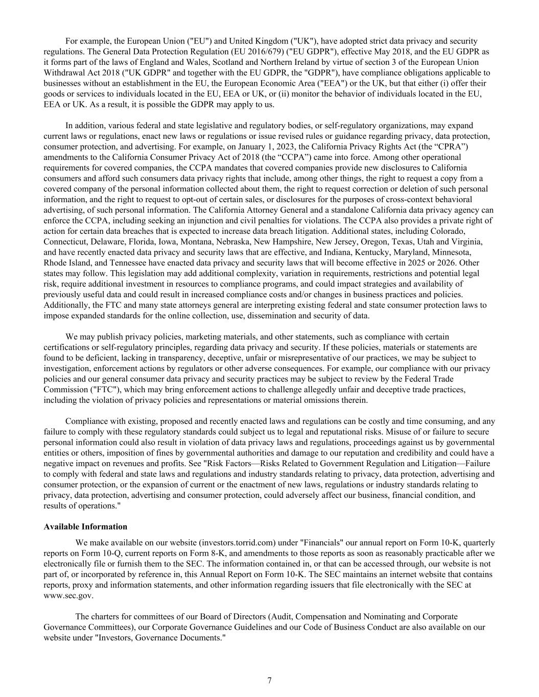 For example, the European Union ("EU") and United Kingdom ("UK"), have adopted strict data privacy and security regulations. The General Data Protection Regulation (EU 2016/679) ("EU GDPR"), effective May 2018, and the EU GDPR as it forms part of the laws of England and Wales, Scotland and Northern Ireland by virtue of section 3 of the European Union Withdrawal Act 2018 ("UK GDPR" and together with the EU GDPR, the "GDPR"), have compliance obligations applicable to businesses without an establishment in the EU, the European Economic Area ("EEA") or the UK, but that either (i) offer their goods or services to individuals located in the EU, EEA or UK, or (ii) monitor the behavior of individuals located in the EU, EEA or UK. As a result, it is possible the GDPR may apply to us. In addition, various federal and state legislative and regulatory bodies, or self-regulatory organizations, may expand current laws or regulations, enact new laws or regulations or issue revised rules or guidance regarding privacy, data protection, consumer protection, and advertising. For example, on January 1, 2023, the California Privacy Rights Act (the “CPRA”) amendments to the California Consumer Privacy Act of 2018 (the “CCPA”) came into force. Among other operational requirements for covered companies, the CCPA mandates that covered companies provide new disclosures to California consumers and afford such consumers data privacy rights that include, among other things, the right to request a copy from a covered company of the personal information collected about them, the right to request correction or deletion of such personal information, and the right to request to opt-out of certain sales, or disclosures for the purposes of cross-context behavioral advertising, of such personal information. The California Attorney General and a standalone California data privacy agency can enforce the CCPA, including seeking an injunction and civil penalties for violations. The CCPA also provides a private right of action for certain data breaches that is expected to increase data breach litigation. Additional states, including Colorado, Connecticut, Delaware, Florida, Iowa, Montana, Nebraska, New Hampshire, New Jersey, Oregon, Texas, Utah and Virginia, and have recently enacted data privacy and security laws that are effective, and Indiana, Kentucky, Maryland, Minnesota, Rhode Island, and Tennessee have enacted data privacy and security laws that will become effective in 2025 or 2026. Other states may follow. This legislation may add additional complexity, variation in requirements, restrictions and potential legal risk, require additional investment in resources to compliance programs, and could impact strategies and availability of previously useful data and could result in increased compliance costs and/or changes in business practices and policies. Additionally, the FTC and many state attorneys general are interpreting existing federal and state consumer protection laws to impose expanded standards for the online collection, use, dissemination and security of data. We may publish privacy policies, marketing materials, and other statements, such as compliance with certain certifications or self-regulatory principles, regarding data privacy and security. If these policies, materials or statements are found to be deficient, lacking in transparency, deceptive, unfair or misrepresentative of our practices, we may be subject to investigation, enforcement actions by regulators or other adverse consequences. For example, our compliance with our privacy policies and our general consumer data privacy and security practices may be subject to review by the Federal Trade Commission ("FTC"), which may bring enforcement actions to challenge allegedly unfair and deceptive trade practices, including the violation of privacy policies and representations or material omissions therein. Compliance with existing, proposed and recently enacted laws and regulations can be costly and time consuming, and any failure to comply with these regulatory standards could subject us to legal and reputational risks. Misuse of or failure to secure personal information could also result in violation of data privacy laws and regulations, proceedings against us by governmental entities or others, imposition of fines by governmental authorities and damage to our reputation and credibility and could have a negative impact on revenues and profits. See "Risk Factors—Risks Related to Government Regulation and Litigation—Failure to comply with federal and state laws and regulations and industry standards relating to privacy, data protection, advertising and consumer protection, or the expansion of current or the enactment of new laws, regulations or industry standards relating to privacy, data protection, advertising and consumer protection, could adversely affect our business, financial condition, and results of operations." Available Information We make available on our website (investors.torrid.com) under "Financials" our annual report on Form 10-K, quarterly reports on Form 10-Q, current reports on Form 8-K, and amendments to those reports as soon as reasonably practicable after we electronically file or furnish them to the SEC. The information contained in, or that can be accessed through, our website is not part of, or incorporated by reference in, this Annual Report on Form 10-K. The SEC maintains an internet website that contains reports, proxy and information statements, and other information regarding issuers that file electronically with the SEC at www.sec.gov. The charters for committees of our Board of Directors (Audit, Compensation and Nominating and Corporate Governance Committees), our Corporate Governance Guidelines and our Code of Business Conduct are also available on our website under "Investors, Governance Documents." 7