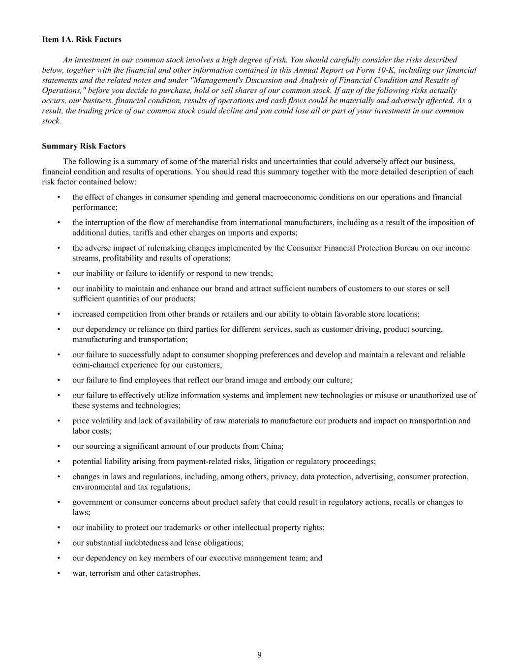 Item 1A. Risk Factors An investment in our common stock involves a high degree of risk. You should carefully consider the risks described below, together with the financial and other information contained in this Annual Report on Form 10-K, including our financial statements and the related notes and under "Management's Discussion and Analysis of Financial Condition and Results of Operations," before you decide to purchase, hold or sell shares of our common stock. If any of the following risks actually occurs, our business, financial condition, results of operations and cash flows could be materially and adversely affected. As a result, the trading price of our common stock could decline and you could lose all or part of your investment in our common stock. Summary Risk Factors The following is a summary of some of the material risks and uncertainties that could adversely affect our business, financial condition and results of operations. You should read this summary together with the more detailed description of each risk factor contained below: • the effect of changes in consumer spending and general macroeconomic conditions on our operations and financial performance; • the interruption of the flow of merchandise from international manufacturers, including as a result of the imposition of additional duties, tariffs and other charges on imports and exports; • the adverse impact of rulemaking changes implemented by the Consumer Financial Protection Bureau on our income streams, profitability and results of operations; • our inability or failure to identify or respond to new trends; • our inability to maintain and enhance our brand and attract sufficient numbers of customers to our stores or sell sufficient quantities of our products; • increased competition from other brands or retailers and our ability to obtain favorable store locations; • our dependency or reliance on third parties for different services, such as customer driving, product sourcing, manufacturing and transportation; • our failure to successfully adapt to consumer shopping preferences and develop and maintain a relevant and reliable omni-channel experience for our customers; • our failure to find employees that reflect our brand image and embody our culture; • our failure to effectively utilize information systems and implement new technologies or misuse or unauthorized use of these systems and technologies; • price volatility and lack of availability of raw materials to manufacture our products and impact on transportation and labor costs; • our sourcing a significant amount of our products from China; • potential liability arising from payment-related risks, litigation or regulatory proceedings; • changes in laws and regulations, including, among others, privacy, data protection, advertising, consumer protection, environmental and tax regulations; • government or consumer concerns about product safety that could result in regulatory actions, recalls or changes to laws; • our inability to protect our trademarks or other intellectual property rights; • our substantial indebtedness and lease obligations; • our dependency on key members of our executive management team; and • war, terrorism and other catastrophes. 9