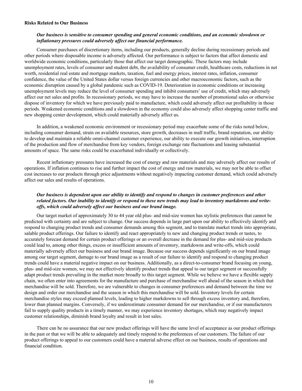 Risks Related to Our Business Our business is sensitive to consumer spending and general economic conditions, and an economic slowdown or inflationary pressures could adversely affect our financial performance. Consumer purchases of discretionary items, including our products, generally decline during recessionary periods and other periods where disposable income is adversely affected. Our performance is subject to factors that affect domestic and worldwide economic conditions, particularly those that affect our target demographic. These factors may include unemployment rates, levels of consumer and student debt, the availability of consumer credit, healthcare costs, reductions in net worth, residential real estate and mortgage markets, taxation, fuel and energy prices, interest rates, inflation, consumer confidence, the value of the United States dollar versus foreign currencies and other macroeconomic factors, such as the economic disruption caused by a global pandemic such as COVID-19. Deterioration in economic conditions or increasing unemployment levels may reduce the level of consumer spending and inhibit consumers’ use of credit, which may adversely affect our net sales and profits. In recessionary periods, we may have to increase the number of promotional sales or otherwise dispose of inventory for which we have previously paid to manufacture, which could adversely affect our profitability in those periods. Weakened economic conditions and a slowdown in the economy could also adversely affect shopping center traffic and new shopping center development, which could materially adversely affect us. In addition, a weakened economic environment or recessionary period may exacerbate some of the risks noted below, including consumer demand, strain on available resources, store growth, decreases in mall traffic, brand reputation, our ability to develop and maintain a reliable omni-channel customer experience, our ability to execute our growth initiatives, interruption of the production and flow of merchandise from key vendors, foreign exchange rate fluctuations and leasing substantial amounts of space. The same risks could be exacerbated individually or collectively. Recent inflationary pressures have increased the cost of energy and raw materials and may adversely affect our results of operations. If inflation continues to rise and further impact the cost of energy and raw materials, we may not be able to offset cost increases to our products through price adjustments without negatively impacting customer demand, which could adversely affect our sales and results of operations. Our business is dependent upon our ability to identify and respond to changes in customer preferences and other related factors. Our inability to identify or respond to these new trends may lead to inventory markdowns and write- offs, which could adversely affect our business and our brand image. Our target market of approximately 30 to 44 year old plus- and mid-size women has stylistic preferences that cannot be predicted with certainty and are subject to change. Our success depends in large part upon our ability to effectively identify and respond to changing product trends and consumer demands among this segment, and to translate market trends into appropriate, salable product offerings. Our failure to identify and react appropriately to new and changing product trends or tastes, to accurately forecast demand for certain product offerings or an overall decrease in the demand for plus- and mid-size products could lead to, among other things, excess or insufficient amounts of inventory, markdowns and write-offs, which could materially adversely affect our business and our brand image. Because our success depends significantly on our brand image among our target segment, damage to our brand image as a result of our failure to identify and respond to changing product trends could have a material negative impact on our business. Additionally, as a direct-to-consumer brand focusing on young, plus- and mid-size women, we may not effectively identify product trends that appeal to our target segment or successfully adapt product trends prevailing in the market more broadly to this target segment. While we believe we have a flexible supply chain, we often enter into agreements for the manufacture and purchase of merchandise well ahead of the season in which that merchandise will be sold. Therefore, we are vulnerable to changes in consumer preferences and demand between the time we design and order our merchandise and the season in which this merchandise will be sold. Inventory levels for certain merchandise styles may exceed planned levels, leading to higher markdowns to sell through excess inventory and, therefore, lower than planned margins. Conversely, if we underestimate consumer demand for our merchandise, or if our manufacturers fail to supply quality products in a timely manner, we may experience inventory shortages, which may negatively impact customer relationships, diminish brand loyalty and result in lost sales. There can be no assurance that our new product offerings will have the same level of acceptance as our product offerings in the past or that we will be able to adequately and timely respond to the preferences of our customers. The failure of our product offerings to appeal to our customers could have a material adverse effect on our business, results of operations and financial condition. 10