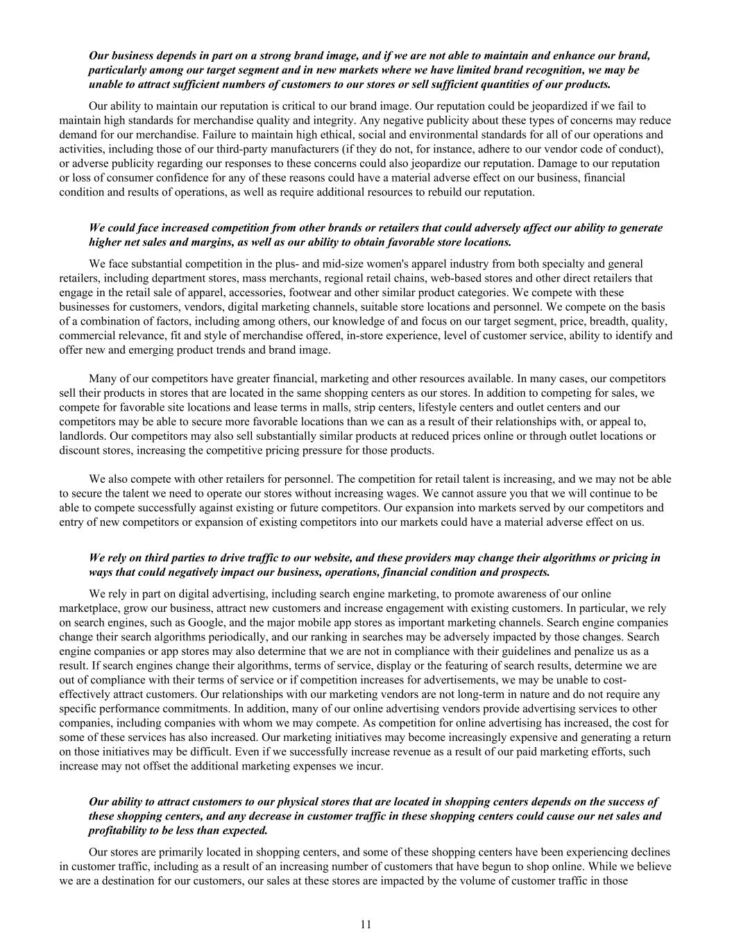 Our business depends in part on a strong brand image, and if we are not able to maintain and enhance our brand, particularly among our target segment and in new markets where we have limited brand recognition, we may be unable to attract sufficient numbers of customers to our stores or sell sufficient quantities of our products. Our ability to maintain our reputation is critical to our brand image. Our reputation could be jeopardized if we fail to maintain high standards for merchandise quality and integrity. Any negative publicity about these types of concerns may reduce demand for our merchandise. Failure to maintain high ethical, social and environmental standards for all of our operations and activities, including those of our third-party manufacturers (if they do not, for instance, adhere to our vendor code of conduct), or adverse publicity regarding our responses to these concerns could also jeopardize our reputation. Damage to our reputation or loss of consumer confidence for any of these reasons could have a material adverse effect on our business, financial condition and results of operations, as well as require additional resources to rebuild our reputation. We could face increased competition from other brands or retailers that could adversely affect our ability to generate higher net sales and margins, as well as our ability to obtain favorable store locations. We face substantial competition in the plus- and mid-size women's apparel industry from both specialty and general retailers, including department stores, mass merchants, regional retail chains, web-based stores and other direct retailers that engage in the retail sale of apparel, accessories, footwear and other similar product categories. We compete with these businesses for customers, vendors, digital marketing channels, suitable store locations and personnel. We compete on the basis of a combination of factors, including among others, our knowledge of and focus on our target segment, price, breadth, quality, commercial relevance, fit and style of merchandise offered, in-store experience, level of customer service, ability to identify and offer new and emerging product trends and brand image. Many of our competitors have greater financial, marketing and other resources available. In many cases, our competitors sell their products in stores that are located in the same shopping centers as our stores. In addition to competing for sales, we compete for favorable site locations and lease terms in malls, strip centers, lifestyle centers and outlet centers and our competitors may be able to secure more favorable locations than we can as a result of their relationships with, or appeal to, landlords. Our competitors may also sell substantially similar products at reduced prices online or through outlet locations or discount stores, increasing the competitive pricing pressure for those products. We also compete with other retailers for personnel. The competition for retail talent is increasing, and we may not be able to secure the talent we need to operate our stores without increasing wages. We cannot assure you that we will continue to be able to compete successfully against existing or future competitors. Our expansion into markets served by our competitors and entry of new competitors or expansion of existing competitors into our markets could have a material adverse effect on us. We rely on third parties to drive traffic to our website, and these providers may change their algorithms or pricing in ways that could negatively impact our business, operations, financial condition and prospects. We rely in part on digital advertising, including search engine marketing, to promote awareness of our online marketplace, grow our business, attract new customers and increase engagement with existing customers. In particular, we rely on search engines, such as Google, and the major mobile app stores as important marketing channels. Search engine companies change their search algorithms periodically, and our ranking in searches may be adversely impacted by those changes. Search engine companies or app stores may also determine that we are not in compliance with their guidelines and penalize us as a result. If search engines change their algorithms, terms of service, display or the featuring of search results, determine we are out of compliance with their terms of service or if competition increases for advertisements, we may be unable to cost- effectively attract customers. Our relationships with our marketing vendors are not long-term in nature and do not require any specific performance commitments. In addition, many of our online advertising vendors provide advertising services to other companies, including companies with whom we may compete. As competition for online advertising has increased, the cost for some of these services has also increased. Our marketing initiatives may become increasingly expensive and generating a return on those initiatives may be difficult. Even if we successfully increase revenue as a result of our paid marketing efforts, such increase may not offset the additional marketing expenses we incur. Our ability to attract customers to our physical stores that are located in shopping centers depends on the success of these shopping centers, and any decrease in customer traffic in these shopping centers could cause our net sales and profitability to be less than expected. Our stores are primarily located in shopping centers, and some of these shopping centers have been experiencing declines in customer traffic, including as a result of an increasing number of customers that have begun to shop online. While we believe we are a destination for our customers, our sales at these stores are impacted by the volume of customer traffic in those 11