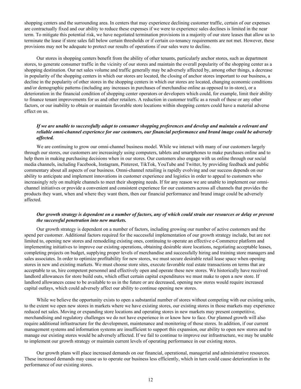 shopping centers and the surrounding area. In centers that may experience declining customer traffic, certain of our expenses are contractually fixed and our ability to reduce these expenses if we were to experience sales declines is limited in the near term. To mitigate this potential risk, we have negotiated termination provisions in a majority of our store leases that allow us to terminate the lease if store sales fall below certain thresholds or if certain co-tenancy requirements are not met. However, these provisions may not be adequate to protect our results of operations if our sales were to decline. Our stores in shopping centers benefit from the ability of other tenants, particularly anchor stores, such as department stores, to generate consumer traffic in the vicinity of our stores and maintain the overall popularity of the shopping center as a shopping destination. Our net sales volume and traffic generally may be adversely affected by, among other things, a decrease in popularity of the shopping centers in which our stores are located, the closing of anchor stores important to our business, a decline in the popularity of other stores in the shopping centers in which our stores are located, changing economic conditions and/or demographic patterns (including any increases in purchases of merchandise online as opposed to in-store), or a deterioration in the financial condition of shopping center operators or developers which could, for example, limit their ability to finance tenant improvements for us and other retailers. A reduction in customer traffic as a result of these or any other factors, or our inability to obtain or maintain favorable store locations within shopping centers could have a material adverse effect on us. If we are unable to successfully adapt to consumer shopping preferences and develop and maintain a relevant and reliable omni-channel experience for our customers, our financial performance and brand image could be adversely affected. We are continuing to grow our omni-channel business model. While we interact with many of our customers largely through our stores, our customers are increasingly using computers, tablets and smartphones to make purchases online and to help them in making purchasing decisions when in our stores. Our customers also engage with us online through our social media channels, including Facebook, Instagram, Pinterest, TikTok, YouTube and Twitter, by providing feedback and public commentary about all aspects of our business. Omni-channel retailing is rapidly evolving and our success depends on our ability to anticipate and implement innovations in customer experience and logistics in order to appeal to customers who increasingly rely on multiple channels to meet their shopping needs. If for any reason we are unable to implement our omni- channel initiatives or provide a convenient and consistent experience for our customers across all channels that provides the products they want, when and where they want them, then our financial performance and brand image could be adversely affected. Our growth strategy is dependent on a number of factors, any of which could strain our resources or delay or prevent the successful penetration into new markets. Our growth strategy is dependent on a number of factors, including growing our number of active customers and the spend per customer. Additional factors required for the successful implementation of our growth strategy include, but are not limited to, opening new stores and remodeling existing ones, continuing to operate an effective e-Commerce platform and implementing initiatives to improve our existing operations, obtaining desirable store locations, negotiating acceptable leases, completing projects on budget, supplying proper levels of merchandise and successfully hiring and training store managers and sales associates. In order to optimize profitability for new stores, we must secure desirable retail lease space when opening stores in new and existing markets. We must choose store sites, execute favorable real estate transactions on terms that are acceptable to us, hire competent personnel and effectively open and operate these new stores. We historically have received landlord allowances for store build outs, which offset certain capital expenditures we must make to open a new store. If landlord allowances cease to be available to us in the future or are decreased, opening new stores would require increased capital outlays, which could adversely affect our ability to continue opening new stores. While we believe the opportunity exists to open a substantial number of stores without competing with our existing units, to the extent we open new stores in markets where we have existing stores, our existing stores in those markets may experience reduced net sales. Moving or expanding store locations and operating stores in new markets may present competitive, merchandising and regulatory challenges we do not have experience in or know how to face. Our planned growth will also require additional infrastructure for the development, maintenance and monitoring of those stores. In addition, if our current management systems and information systems are insufficient to support this expansion, our ability to open new stores and to manage our existing stores would be adversely affected. If we fail to continue to improve our infrastructure, we may be unable to implement our growth strategy or maintain current levels of operating performance in our existing stores. Our growth plans will place increased demands on our financial, operational, managerial and administrative resources. These increased demands may cause us to operate our business less efficiently, which in turn could cause deterioration in the performance of our existing stores. 12