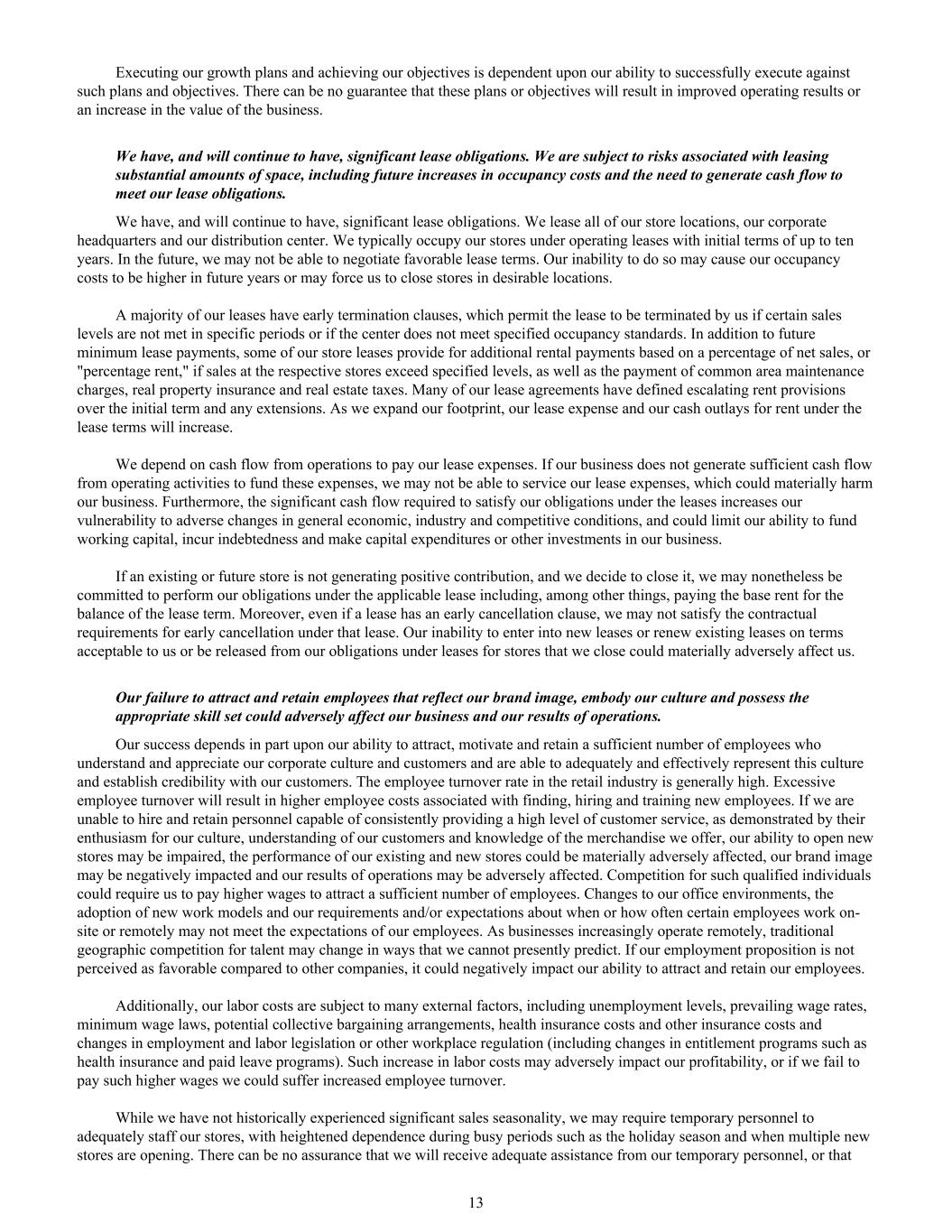 Executing our growth plans and achieving our objectives is dependent upon our ability to successfully execute against such plans and objectives. There can be no guarantee that these plans or objectives will result in improved operating results or an increase in the value of the business. We have, and will continue to have, significant lease obligations. We are subject to risks associated with leasing substantial amounts of space, including future increases in occupancy costs and the need to generate cash flow to meet our lease obligations. We have, and will continue to have, significant lease obligations. We lease all of our store locations, our corporate headquarters and our distribution center. We typically occupy our stores under operating leases with initial terms of up to ten years. In the future, we may not be able to negotiate favorable lease terms. Our inability to do so may cause our occupancy costs to be higher in future years or may force us to close stores in desirable locations. A majority of our leases have early termination clauses, which permit the lease to be terminated by us if certain sales levels are not met in specific periods or if the center does not meet specified occupancy standards. In addition to future minimum lease payments, some of our store leases provide for additional rental payments based on a percentage of net sales, or "percentage rent," if sales at the respective stores exceed specified levels, as well as the payment of common area maintenance charges, real property insurance and real estate taxes. Many of our lease agreements have defined escalating rent provisions over the initial term and any extensions. As we expand our footprint, our lease expense and our cash outlays for rent under the lease terms will increase. We depend on cash flow from operations to pay our lease expenses. If our business does not generate sufficient cash flow from operating activities to fund these expenses, we may not be able to service our lease expenses, which could materially harm our business. Furthermore, the significant cash flow required to satisfy our obligations under the leases increases our vulnerability to adverse changes in general economic, industry and competitive conditions, and could limit our ability to fund working capital, incur indebtedness and make capital expenditures or other investments in our business. If an existing or future store is not generating positive contribution, and we decide to close it, we may nonetheless be committed to perform our obligations under the applicable lease including, among other things, paying the base rent for the balance of the lease term. Moreover, even if a lease has an early cancellation clause, we may not satisfy the contractual requirements for early cancellation under that lease. Our inability to enter into new leases or renew existing leases on terms acceptable to us or be released from our obligations under leases for stores that we close could materially adversely affect us. Our failure to attract and retain employees that reflect our brand image, embody our culture and possess the appropriate skill set could adversely affect our business and our results of operations. Our success depends in part upon our ability to attract, motivate and retain a sufficient number of employees who understand and appreciate our corporate culture and customers and are able to adequately and effectively represent this culture and establish credibility with our customers. The employee turnover rate in the retail industry is generally high. Excessive employee turnover will result in higher employee costs associated with finding, hiring and training new employees. If we are unable to hire and retain personnel capable of consistently providing a high level of customer service, as demonstrated by their enthusiasm for our culture, understanding of our customers and knowledge of the merchandise we offer, our ability to open new stores may be impaired, the performance of our existing and new stores could be materially adversely affected, our brand image may be negatively impacted and our results of operations may be adversely affected. Competition for such qualified individuals could require us to pay higher wages to attract a sufficient number of employees. Changes to our office environments, the adoption of new work models and our requirements and/or expectations about when or how often certain employees work on- site or remotely may not meet the expectations of our employees. As businesses increasingly operate remotely, traditional geographic competition for talent may change in ways that we cannot presently predict. If our employment proposition is not perceived as favorable compared to other companies, it could negatively impact our ability to attract and retain our employees. Additionally, our labor costs are subject to many external factors, including unemployment levels, prevailing wage rates, minimum wage laws, potential collective bargaining arrangements, health insurance costs and other insurance costs and changes in employment and labor legislation or other workplace regulation (including changes in entitlement programs such as health insurance and paid leave programs). Such increase in labor costs may adversely impact our profitability, or if we fail to pay such higher wages we could suffer increased employee turnover. While we have not historically experienced significant sales seasonality, we may require temporary personnel to adequately staff our stores, with heightened dependence during busy periods such as the holiday season and when multiple new stores are opening. There can be no assurance that we will receive adequate assistance from our temporary personnel, or that 13