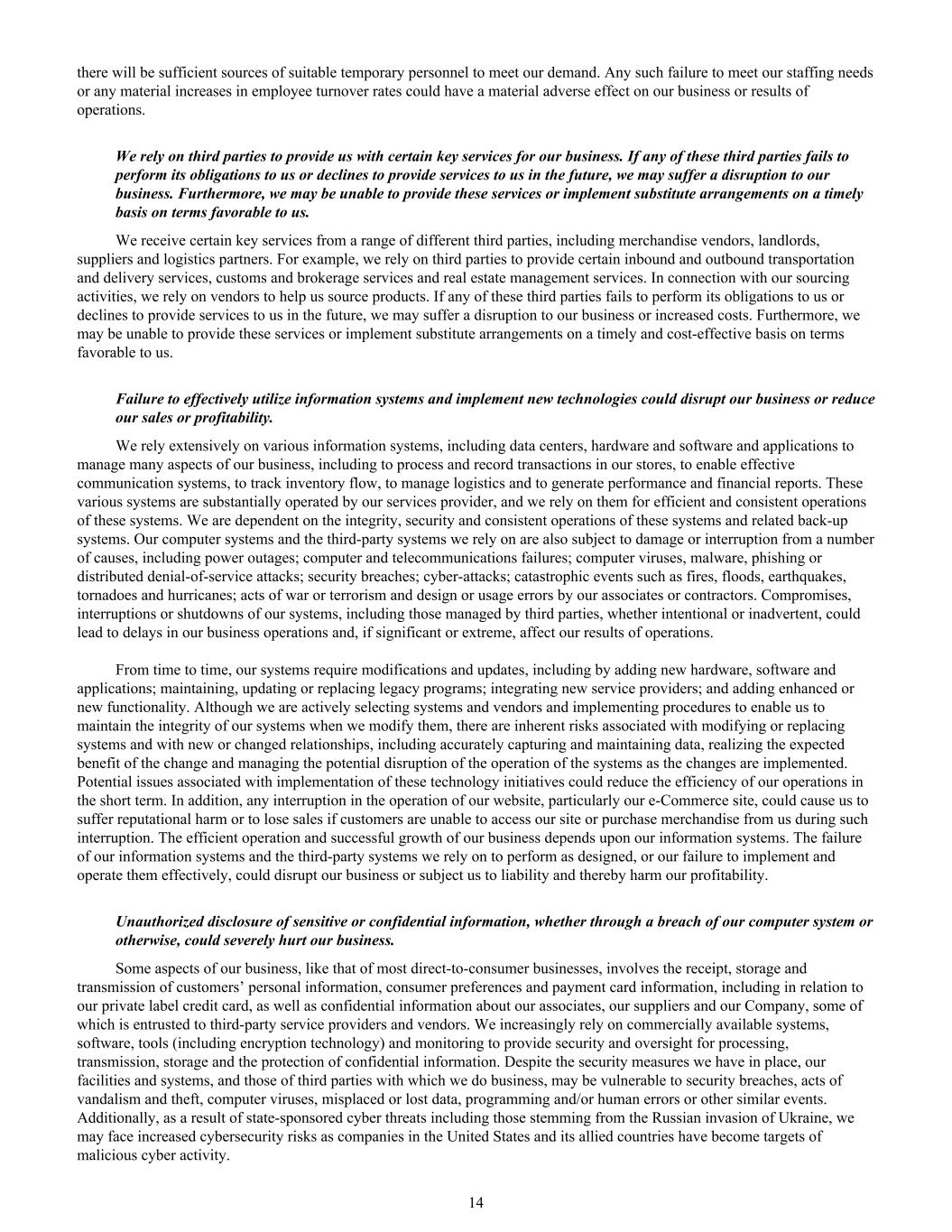 there will be sufficient sources of suitable temporary personnel to meet our demand. Any such failure to meet our staffing needs or any material increases in employee turnover rates could have a material adverse effect on our business or results of operations. We rely on third parties to provide us with certain key services for our business. If any of these third parties fails to perform its obligations to us or declines to provide services to us in the future, we may suffer a disruption to our business. Furthermore, we may be unable to provide these services or implement substitute arrangements on a timely basis on terms favorable to us. We receive certain key services from a range of different third parties, including merchandise vendors, landlords, suppliers and logistics partners. For example, we rely on third parties to provide certain inbound and outbound transportation and delivery services, customs and brokerage services and real estate management services. In connection with our sourcing activities, we rely on vendors to help us source products. If any of these third parties fails to perform its obligations to us or declines to provide services to us in the future, we may suffer a disruption to our business or increased costs. Furthermore, we may be unable to provide these services or implement substitute arrangements on a timely and cost-effective basis on terms favorable to us. Failure to effectively utilize information systems and implement new technologies could disrupt our business or reduce our sales or profitability. We rely extensively on various information systems, including data centers, hardware and software and applications to manage many aspects of our business, including to process and record transactions in our stores, to enable effective communication systems, to track inventory flow, to manage logistics and to generate performance and financial reports. These various systems are substantially operated by our services provider, and we rely on them for efficient and consistent operations of these systems. We are dependent on the integrity, security and consistent operations of these systems and related back-up systems. Our computer systems and the third-party systems we rely on are also subject to damage or interruption from a number of causes, including power outages; computer and telecommunications failures; computer viruses, malware, phishing or distributed denial-of-service attacks; security breaches; cyber-attacks; catastrophic events such as fires, floods, earthquakes, tornadoes and hurricanes; acts of war or terrorism and design or usage errors by our associates or contractors. Compromises, interruptions or shutdowns of our systems, including those managed by third parties, whether intentional or inadvertent, could lead to delays in our business operations and, if significant or extreme, affect our results of operations. From time to time, our systems require modifications and updates, including by adding new hardware, software and applications; maintaining, updating or replacing legacy programs; integrating new service providers; and adding enhanced or new functionality. Although we are actively selecting systems and vendors and implementing procedures to enable us to maintain the integrity of our systems when we modify them, there are inherent risks associated with modifying or replacing systems and with new or changed relationships, including accurately capturing and maintaining data, realizing the expected benefit of the change and managing the potential disruption of the operation of the systems as the changes are implemented. Potential issues associated with implementation of these technology initiatives could reduce the efficiency of our operations in the short term. In addition, any interruption in the operation of our website, particularly our e-Commerce site, could cause us to suffer reputational harm or to lose sales if customers are unable to access our site or purchase merchandise from us during such interruption. The efficient operation and successful growth of our business depends upon our information systems. The failure of our information systems and the third-party systems we rely on to perform as designed, or our failure to implement and operate them effectively, could disrupt our business or subject us to liability and thereby harm our profitability. Unauthorized disclosure of sensitive or confidential information, whether through a breach of our computer system or otherwise, could severely hurt our business. Some aspects of our business, like that of most direct-to-consumer businesses, involves the receipt, storage and transmission of customers’ personal information, consumer preferences and payment card information, including in relation to our private label credit card, as well as confidential information about our associates, our suppliers and our Company, some of which is entrusted to third-party service providers and vendors. We increasingly rely on commercially available systems, software, tools (including encryption technology) and monitoring to provide security and oversight for processing, transmission, storage and the protection of confidential information. Despite the security measures we have in place, our facilities and systems, and those of third parties with which we do business, may be vulnerable to security breaches, acts of vandalism and theft, computer viruses, misplaced or lost data, programming and/or human errors or other similar events. Additionally, as a result of state-sponsored cyber threats including those stemming from the Russian invasion of Ukraine, we may face increased cybersecurity risks as companies in the United States and its allied countries have become targets of malicious cyber activity. 14