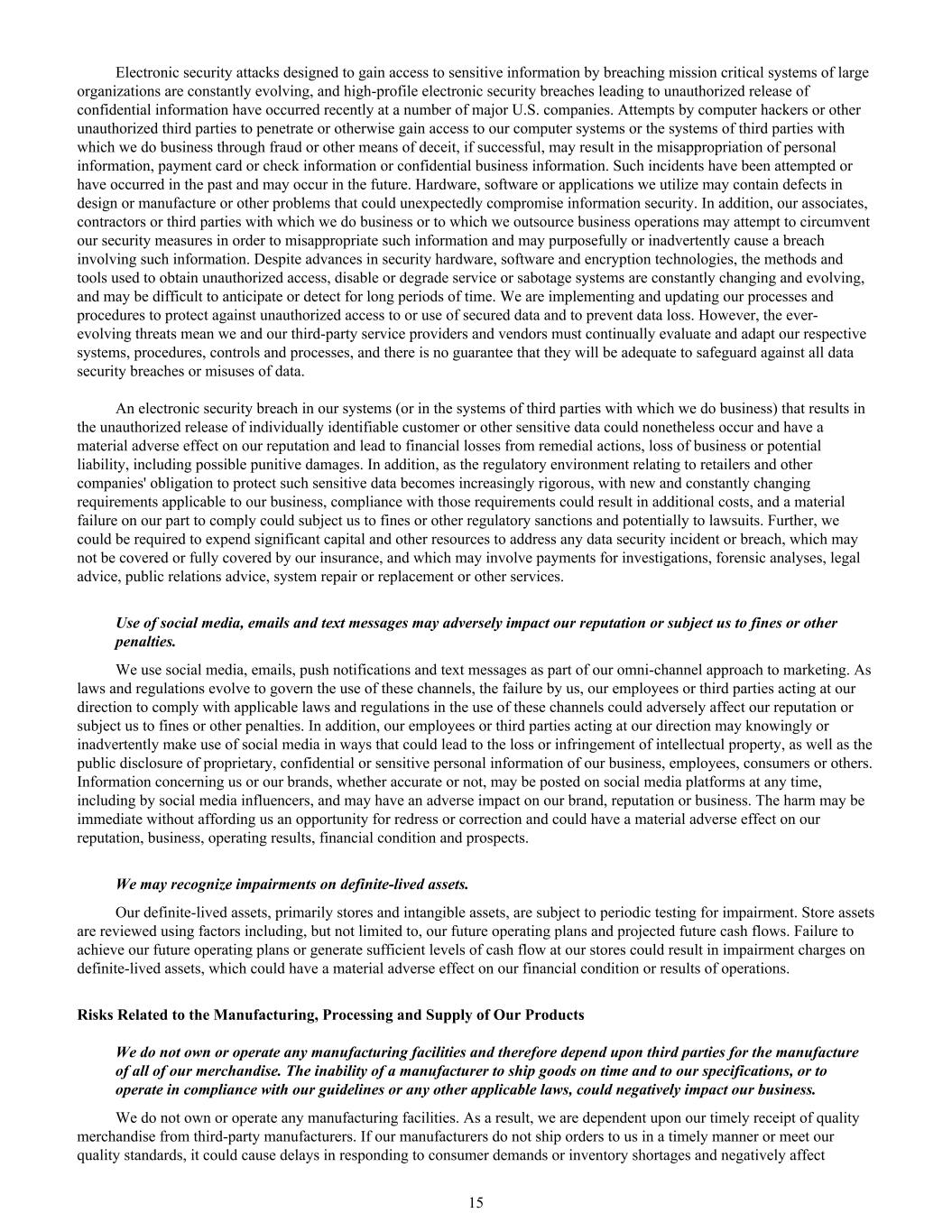 Electronic security attacks designed to gain access to sensitive information by breaching mission critical systems of large organizations are constantly evolving, and high-profile electronic security breaches leading to unauthorized release of confidential information have occurred recently at a number of major U.S. companies. Attempts by computer hackers or other unauthorized third parties to penetrate or otherwise gain access to our computer systems or the systems of third parties with which we do business through fraud or other means of deceit, if successful, may result in the misappropriation of personal information, payment card or check information or confidential business information. Such incidents have been attempted or have occurred in the past and may occur in the future. Hardware, software or applications we utilize may contain defects in design or manufacture or other problems that could unexpectedly compromise information security. In addition, our associates, contractors or third parties with which we do business or to which we outsource business operations may attempt to circumvent our security measures in order to misappropriate such information and may purposefully or inadvertently cause a breach involving such information. Despite advances in security hardware, software and encryption technologies, the methods and tools used to obtain unauthorized access, disable or degrade service or sabotage systems are constantly changing and evolving, and may be difficult to anticipate or detect for long periods of time. We are implementing and updating our processes and procedures to protect against unauthorized access to or use of secured data and to prevent data loss. However, the ever- evolving threats mean we and our third-party service providers and vendors must continually evaluate and adapt our respective systems, procedures, controls and processes, and there is no guarantee that they will be adequate to safeguard against all data security breaches or misuses of data. An electronic security breach in our systems (or in the systems of third parties with which we do business) that results in the unauthorized release of individually identifiable customer or other sensitive data could nonetheless occur and have a material adverse effect on our reputation and lead to financial losses from remedial actions, loss of business or potential liability, including possible punitive damages. In addition, as the regulatory environment relating to retailers and other companies' obligation to protect such sensitive data becomes increasingly rigorous, with new and constantly changing requirements applicable to our business, compliance with those requirements could result in additional costs, and a material failure on our part to comply could subject us to fines or other regulatory sanctions and potentially to lawsuits. Further, we could be required to expend significant capital and other resources to address any data security incident or breach, which may not be covered or fully covered by our insurance, and which may involve payments for investigations, forensic analyses, legal advice, public relations advice, system repair or replacement or other services. Use of social media, emails and text messages may adversely impact our reputation or subject us to fines or other penalties. We use social media, emails, push notifications and text messages as part of our omni-channel approach to marketing. As laws and regulations evolve to govern the use of these channels, the failure by us, our employees or third parties acting at our direction to comply with applicable laws and regulations in the use of these channels could adversely affect our reputation or subject us to fines or other penalties. In addition, our employees or third parties acting at our direction may knowingly or inadvertently make use of social media in ways that could lead to the loss or infringement of intellectual property, as well as the public disclosure of proprietary, confidential or sensitive personal information of our business, employees, consumers or others. Information concerning us or our brands, whether accurate or not, may be posted on social media platforms at any time, including by social media influencers, and may have an adverse impact on our brand, reputation or business. The harm may be immediate without affording us an opportunity for redress or correction and could have a material adverse effect on our reputation, business, operating results, financial condition and prospects. We may recognize impairments on definite-lived assets. Our definite-lived assets, primarily stores and intangible assets, are subject to periodic testing for impairment. Store assets are reviewed using factors including, but not limited to, our future operating plans and projected future cash flows. Failure to achieve our future operating plans or generate sufficient levels of cash flow at our stores could result in impairment charges on definite-lived assets, which could have a material adverse effect on our financial condition or results of operations. Risks Related to the Manufacturing, Processing and Supply of Our Products We do not own or operate any manufacturing facilities and therefore depend upon third parties for the manufacture of all of our merchandise. The inability of a manufacturer to ship goods on time and to our specifications, or to operate in compliance with our guidelines or any other applicable laws, could negatively impact our business. We do not own or operate any manufacturing facilities. As a result, we are dependent upon our timely receipt of quality merchandise from third-party manufacturers. If our manufacturers do not ship orders to us in a timely manner or meet our quality standards, it could cause delays in responding to consumer demands or inventory shortages and negatively affect 15