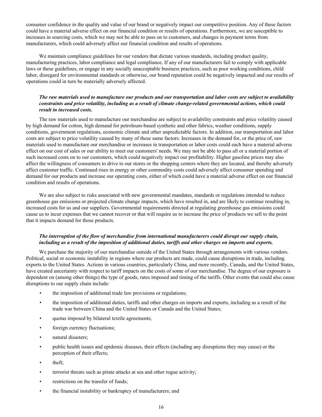 consumer confidence in the quality and value of our brand or negatively impact our competitive position. Any of these factors could have a material adverse effect on our financial condition or results of operations. Furthermore, we are susceptible to increases in sourcing costs, which we may not be able to pass on to customers, and changes in payment terms from manufacturers, which could adversely affect our financial condition and results of operations. We maintain compliance guidelines for our vendors that dictate various standards, including product quality, manufacturing practices, labor compliance and legal compliance. If any of our manufacturers fail to comply with applicable laws or these guidelines, or engage in any socially unacceptable business practices, such as poor working conditions, child labor, disregard for environmental standards or otherwise, our brand reputation could be negatively impacted and our results of operations could in turn be materially adversely affected. The raw materials used to manufacture our products and our transportation and labor costs are subject to availability constraints and price volatility, including as a result of climate change-related governmental actions, which could result in increased costs. The raw materials used to manufacture our merchandise are subject to availability constraints and price volatility caused by high demand for cotton, high demand for petroleum-based synthetic and other fabrics, weather conditions, supply conditions, government regulations, economic climate and other unpredictable factors. In addition, our transportation and labor costs are subject to price volatility caused by many of these same factors. Increases in the demand for, or the price of, raw materials used to manufacture our merchandise or increases in transportation or labor costs could each have a material adverse effect on our cost of sales or our ability to meet our customers' needs. We may not be able to pass all or a material portion of such increased costs on to our customers, which could negatively impact our profitability. Higher gasoline prices may also affect the willingness of consumers to drive to our stores or the shopping centers where they are located, and thereby adversely affect customer traffic. Continued rises in energy or other commodity costs could adversely affect consumer spending and demand for our products and increase our operating costs, either of which could have a material adverse effect on our financial condition and results of operations. We are also subject to risks associated with new governmental mandates, standards or regulations intended to reduce greenhouse gas emissions or projected climate change impacts, which have resulted in, and are likely to continue resulting in, increased costs for us and our suppliers. Governmental requirements directed at regulating greenhouse gas emissions could cause us to incur expenses that we cannot recover or that will require us to increase the price of products we sell to the point that it impacts demand for those products. The interruption of the flow of merchandise from international manufacturers could disrupt our supply chain, including as a result of the imposition of additional duties, tariffs and other charges on imports and exports. We purchase the majority of our merchandise outside of the United States through arrangements with various vendors. Political, social or economic instability in regions where our products are made, could cause disruptions in trade, including exports to the United States. Actions in various countries, particularly China, and more recently, Canada, and the United States, have created uncertainty with respect to tariff impacts on the costs of some of our merchandise. The degree of our exposure is dependent on (among other things) the type of goods, rates imposed and timing of the tariffs. Other events that could also cause disruptions to our supply chain include: • the imposition of additional trade law provisions or regulations; • the imposition of additional duties, tariffs and other charges on imports and exports, including as a result of the trade war between China and the United States or Canada and the United States; • quotas imposed by bilateral textile agreements; • foreign currency fluctuations; • natural disasters; • public health issues and epidemic diseases, their effects (including any disruptions they may cause) or the perception of their effects; • theft; • terrorist threats such as pirate attacks at sea and other rogue activity; • restrictions on the transfer of funds; • the financial instability or bankruptcy of manufacturers; and 16