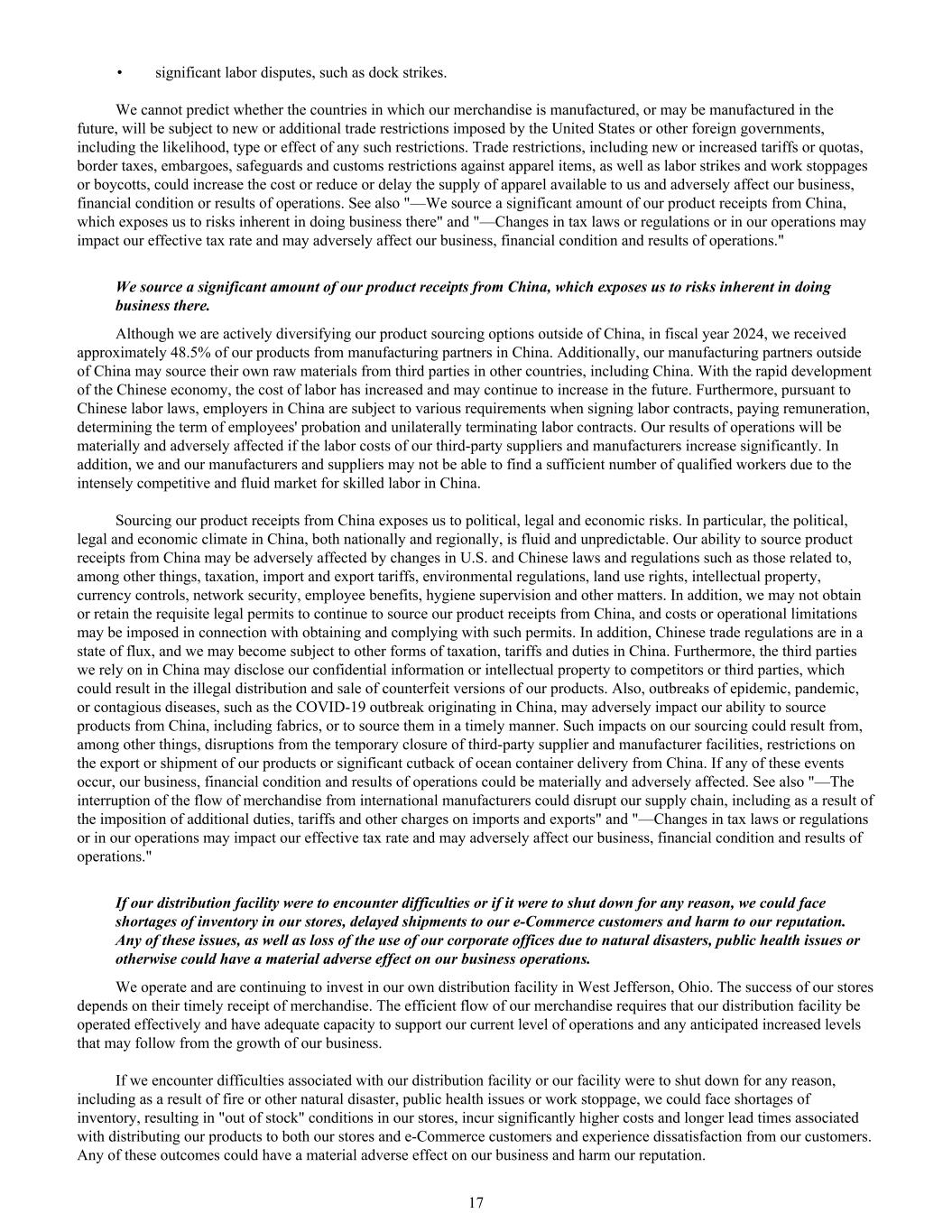 • significant labor disputes, such as dock strikes. We cannot predict whether the countries in which our merchandise is manufactured, or may be manufactured in the future, will be subject to new or additional trade restrictions imposed by the United States or other foreign governments, including the likelihood, type or effect of any such restrictions. Trade restrictions, including new or increased tariffs or quotas, border taxes, embargoes, safeguards and customs restrictions against apparel items, as well as labor strikes and work stoppages or boycotts, could increase the cost or reduce or delay the supply of apparel available to us and adversely affect our business, financial condition or results of operations. See also "—We source a significant amount of our product receipts from China, which exposes us to risks inherent in doing business there" and "—Changes in tax laws or regulations or in our operations may impact our effective tax rate and may adversely affect our business, financial condition and results of operations." We source a significant amount of our product receipts from China, which exposes us to risks inherent in doing business there. Although we are actively diversifying our product sourcing options outside of China, in fiscal year 2024, we received approximately 48.5% of our products from manufacturing partners in China. Additionally, our manufacturing partners outside of China may source their own raw materials from third parties in other countries, including China. With the rapid development of the Chinese economy, the cost of labor has increased and may continue to increase in the future. Furthermore, pursuant to Chinese labor laws, employers in China are subject to various requirements when signing labor contracts, paying remuneration, determining the term of employees' probation and unilaterally terminating labor contracts. Our results of operations will be materially and adversely affected if the labor costs of our third-party suppliers and manufacturers increase significantly. In addition, we and our manufacturers and suppliers may not be able to find a sufficient number of qualified workers due to the intensely competitive and fluid market for skilled labor in China. Sourcing our product receipts from China exposes us to political, legal and economic risks. In particular, the political, legal and economic climate in China, both nationally and regionally, is fluid and unpredictable. Our ability to source product receipts from China may be adversely affected by changes in U.S. and Chinese laws and regulations such as those related to, among other things, taxation, import and export tariffs, environmental regulations, land use rights, intellectual property, currency controls, network security, employee benefits, hygiene supervision and other matters. In addition, we may not obtain or retain the requisite legal permits to continue to source our product receipts from China, and costs or operational limitations may be imposed in connection with obtaining and complying with such permits. In addition, Chinese trade regulations are in a state of flux, and we may become subject to other forms of taxation, tariffs and duties in China. Furthermore, the third parties we rely on in China may disclose our confidential information or intellectual property to competitors or third parties, which could result in the illegal distribution and sale of counterfeit versions of our products. Also, outbreaks of epidemic, pandemic, or contagious diseases, such as the COVID-19 outbreak originating in China, may adversely impact our ability to source products from China, including fabrics, or to source them in a timely manner. Such impacts on our sourcing could result from, among other things, disruptions from the temporary closure of third-party supplier and manufacturer facilities, restrictions on the export or shipment of our products or significant cutback of ocean container delivery from China. If any of these events occur, our business, financial condition and results of operations could be materially and adversely affected. See also "—The interruption of the flow of merchandise from international manufacturers could disrupt our supply chain, including as a result of the imposition of additional duties, tariffs and other charges on imports and exports" and "—Changes in tax laws or regulations or in our operations may impact our effective tax rate and may adversely affect our business, financial condition and results of operations." If our distribution facility were to encounter difficulties or if it were to shut down for any reason, we could face shortages of inventory in our stores, delayed shipments to our e-Commerce customers and harm to our reputation. Any of these issues, as well as loss of the use of our corporate offices due to natural disasters, public health issues or otherwise could have a material adverse effect on our business operations. We operate and are continuing to invest in our own distribution facility in West Jefferson, Ohio. The success of our stores depends on their timely receipt of merchandise. The efficient flow of our merchandise requires that our distribution facility be operated effectively and have adequate capacity to support our current level of operations and any anticipated increased levels that may follow from the growth of our business. If we encounter difficulties associated with our distribution facility or our facility were to shut down for any reason, including as a result of fire or other natural disaster, public health issues or work stoppage, we could face shortages of inventory, resulting in "out of stock" conditions in our stores, incur significantly higher costs and longer lead times associated with distributing our products to both our stores and e-Commerce customers and experience dissatisfaction from our customers. Any of these outcomes could have a material adverse effect on our business and harm our reputation. 17