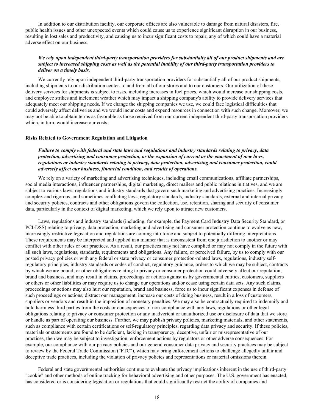In addition to our distribution facility, our corporate offices are also vulnerable to damage from natural disasters, fire, public health issues and other unexpected events which could cause us to experience significant disruption in our business, resulting in lost sales and productivity, and causing us to incur significant costs to repair, any of which could have a material adverse effect on our business. We rely upon independent third-party transportation providers for substantially all of our product shipments and are subject to increased shipping costs as well as the potential inability of our third-party transportation providers to deliver on a timely basis. We currently rely upon independent third-party transportation providers for substantially all of our product shipments, including shipments to our distribution center, to and from all of our stores and to our customers. Our utilization of these delivery services for shipments is subject to risks, including increases in fuel prices, which would increase our shipping costs, and employee strikes and inclement weather which may impact a shipping company's ability to provide delivery services that adequately meet our shipping needs. If we change the shipping companies we use, we could face logistical difficulties that could adversely affect deliveries and we would incur costs and expend resources in connection with such change. Moreover, we may not be able to obtain terms as favorable as those received from our current independent third-party transportation providers which, in turn, would increase our costs. Risks Related to Government Regulation and Litigation Failure to comply with federal and state laws and regulations and industry standards relating to privacy, data protection, advertising and consumer protection, or the expansion of current or the enactment of new laws, regulations or industry standards relating to privacy, data protection, advertising and consumer protection, could adversely affect our business, financial condition, and results of operations. We rely on a variety of marketing and advertising techniques, including email communications, affiliate partnerships, social media interactions, influencer partnerships, digital marketing, direct mailers and public relations initiatives, and we are subject to various laws, regulations and industry standards that govern such marketing and advertising practices. Increasingly complex and rigorous, and sometimes conflicting laws, regulatory standards, industry standards, external and internal privacy and security policies, contracts and other obligations govern the collection, use, retention, sharing and security of consumer data, particularly in the context of digital marketing, which we rely upon to attract new customers. Laws, regulations and industry standards (including, for example, the Payment Card Industry Data Security Standard, or PCI-DSS) relating to privacy, data protection, marketing and advertising and consumer protection continue to evolve as new, increasingly restrictive legislation and regulations are coming into force and subject to potentially differing interpretations. These requirements may be interpreted and applied in a manner that is inconsistent from one jurisdiction to another or may conflict with other rules or our practices. As a result, our practices may not have complied or may not comply in the future with all such laws, regulations, standards, requirements and obligations. Any failure, or perceived failure, by us to comply with our posted privacy policies or with any federal or state privacy or consumer protection-related laws, regulations, industry self- regulatory principles, industry standards or codes of conduct, regulatory guidance, orders to which we may be subject, contracts by which we are bound, or other obligations relating to privacy or consumer protection could adversely affect our reputation, brand and business, and may result in claims, proceedings or actions against us by governmental entities, customers, suppliers or others or other liabilities or may require us to change our operations and/or cease using certain data sets. Any such claims, proceedings or actions may also hurt our reputation, brand and business, force us to incur significant expenses in defense of such proceedings or actions, distract our management, increase our costs of doing business, result in a loss of customers, suppliers or vendors and result in the imposition of monetary penalties. We may also be contractually required to indemnify and hold harmless third parties from the costs or consequences of non-compliance with any laws, regulations or other legal obligations relating to privacy or consumer protection or any inadvertent or unauthorized use or disclosure of data that we store or handle as part of operating our business. Further, we may publish privacy policies, marketing materials, and other statements, such as compliance with certain certifications or self-regulatory principles, regarding data privacy and security. If these policies, materials or statements are found to be deficient, lacking in transparency, deceptive, unfair or misrepresentative of our practices, then we may be subject to investigation, enforcement actions by regulators or other adverse consequences. For example, our compliance with our privacy policies and our general consumer data privacy and security practices may be subject to review by the Federal Trade Commission ("FTC"), which may bring enforcement actions to challenge allegedly unfair and deceptive trade practices, including the violation of privacy policies and representations or material omissions therein. Federal and state governmental authorities continue to evaluate the privacy implications inherent in the use of third-party "cookie" and other methods of online tracking for behavioral advertising and other purposes. The U.S. government has enacted, has considered or is considering legislation or regulations that could s