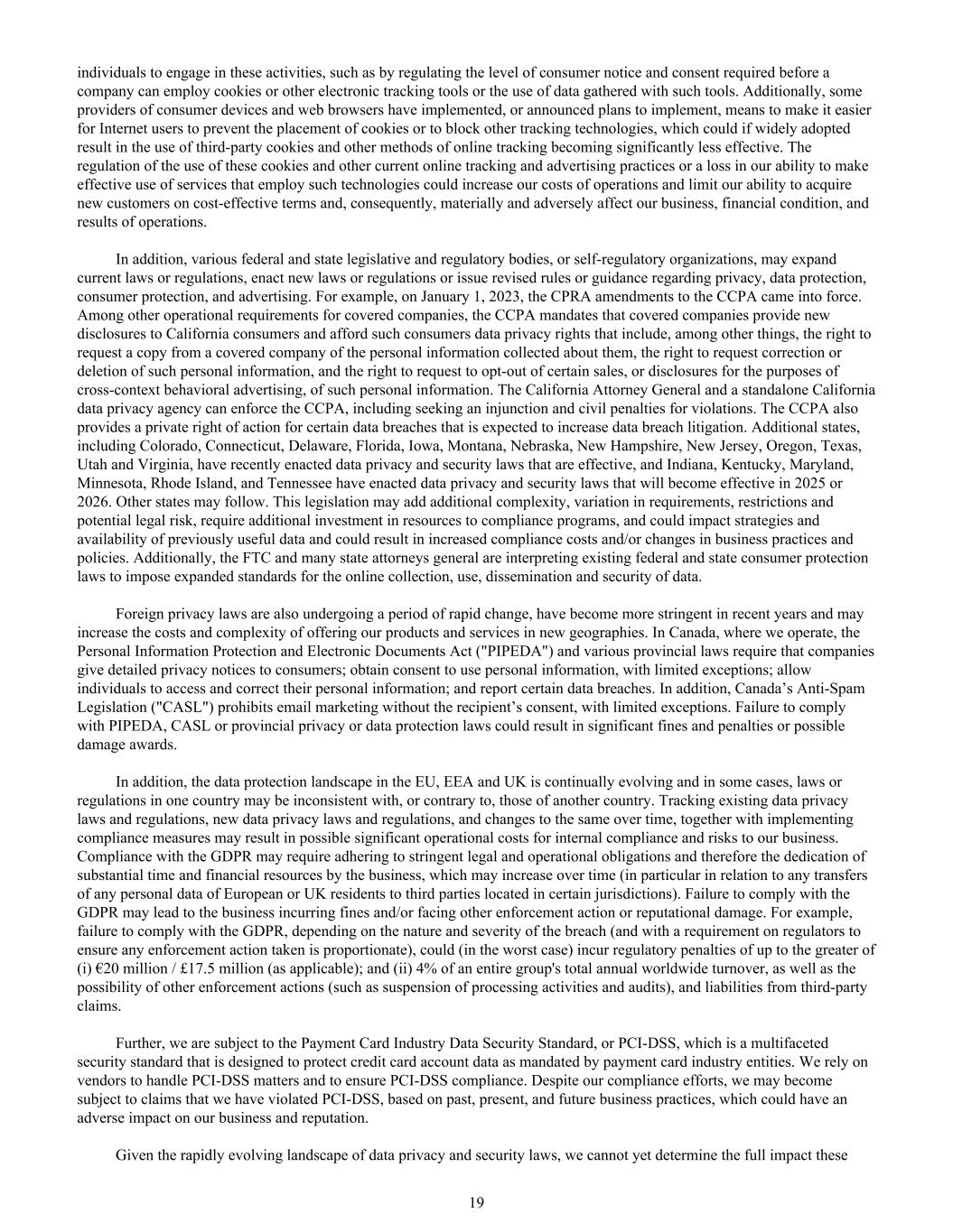 individuals to engage in these activities, such as by regulating the level of consumer notice and consent required before a company can employ cookies or other electronic tracking tools or the use of data gathered with such tools. Additionally, some providers of consumer devices and web browsers have implemented, or announced plans to implement, means to make it easier for Internet users to prevent the placement of cookies or to block other tracking technologies, which could if widely adopted result in the use of third-party cookies and other methods of online tracking becoming significantly less effective. The regulation of the use of these cookies and other current online tracking and advertising practices or a loss in our ability to make effective use of services that employ such technologies could increase our costs of operations and limit our ability to acquire new customers on cost-effective terms and, consequently, materially and adversely affect our business, financial condition, and results of operations. In addition, various federal and state legislative and regulatory bodies, or self-regulatory organizations, may expand current laws or regulations, enact new laws or regulations or issue revised rules or guidance regarding privacy, data protection, consumer protection, and advertising. For example, on January 1, 2023, the CPRA amendments to the CCPA came into force. Among other operational requirements for covered companies, the CCPA mandates that covered companies provide new disclosures to California consumers and afford such consumers data privacy rights that include, among other things, the right to request a copy from a covered company of the personal information collected about them, the right to request correction or deletion of such personal information, and the right to request to opt-out of certain sales, or disclosures for the purposes of cross-context behavioral advertising, of such personal information. The California Attorney General and a standalone California data privacy agency can enforce the CCPA, including seeking an injunction and civil penalties for violations. The CCPA also provides a private right of action for certain data breaches that is expected to increase data breach litigation. Additional states, including Colorado, Connecticut, Delaware, Florida, Iowa, Montana, Nebraska, New Hampshire, New Jersey, Oregon, Texas, Utah and Virginia, have recently enacted data privacy and security laws that are effective, and Indiana, Kentucky, Maryland, Minnesota, Rhode Island, and Tennessee have enacted data privacy and security laws that will become effective in 2025 or 2026. Other states may follow. This legislation may add additional complexity, variation in requirements, restrictions and potential legal risk, require additional investment in resources to compliance programs, and could impact strategies and availability of previously useful data and could result in increased compliance costs and/or changes in business practices and policies. Additionally, the FTC and many state attorneys general are interpreting existing federal and state consumer protection laws to impose expanded standards for the online collection, use, dissemination and security of data. Foreign privacy laws are also undergoing a period of rapid change, have become more stringent in recent years and may increase the costs and complexity of offering our products and services in new geographies. In Canada, where we operate, the Personal Information Protection and Electronic Documents Act ("PIPEDA") and various provincial laws require that companies give detailed privacy notices to consumers; obtain consent to use personal information, with limited exceptions; allow individuals to access and correct their personal information; and report certain data breaches. In addition, Canada’s Anti-Spam Legislation ("CASL") prohibits email marketing without the recipient’s consent, with limited exceptions. Failure to comply with PIPEDA, CASL or provincial privacy or data protection laws could result in significant fines and penalties or possible damage awards. In addition, the data protection landscape in the EU, EEA and UK is continually evolving and in some cases, laws or regulations in one country may be inconsistent with, or contrary to, those of another country. Tracking existing data privacy laws and regulations, new data privacy laws and regulations, and changes to the same over time, together with implementing compliance measures may result in possible significant operational costs for internal compliance and risks to our business. Compliance with the GDPR may require adhering to stringent legal and operational obligations and therefore the dedication of substantial time and financial resources by the business, which may increase over time (in particular in relation to any transfers of any personal data of European or UK residents to third parties located in certain jurisdictions). Failure to comply with the GDPR may lead to the business incurring fines and/or facing other enforcement action or reputational damage. For example, failure to comply with the GDPR, depending on the nature and severity of the breach (and with a requirement on regulators to ensure any enforcement action taken is proportionate), could (in the worst case) incur regulatory penalties of up to the greater of (i) €20 million / £17.5 million (as applicable); and (ii) 4% of an entire group's total annual worldwide turnover, as well as the possibility of other enforcement actions (such as suspension of processing activities and audits), and liabilities from third-party claims. Further, we are subject to the Payment Card Industry Data Security Standard, or PCI-DSS, which is a multifaceted security standard that is designed to protect credit card account data as mandated by payment card industry entities. We rely on vendors to handle PCI-DSS matters and to ensure PCI-DSS compliance. Despite our compliance efforts, we may bec