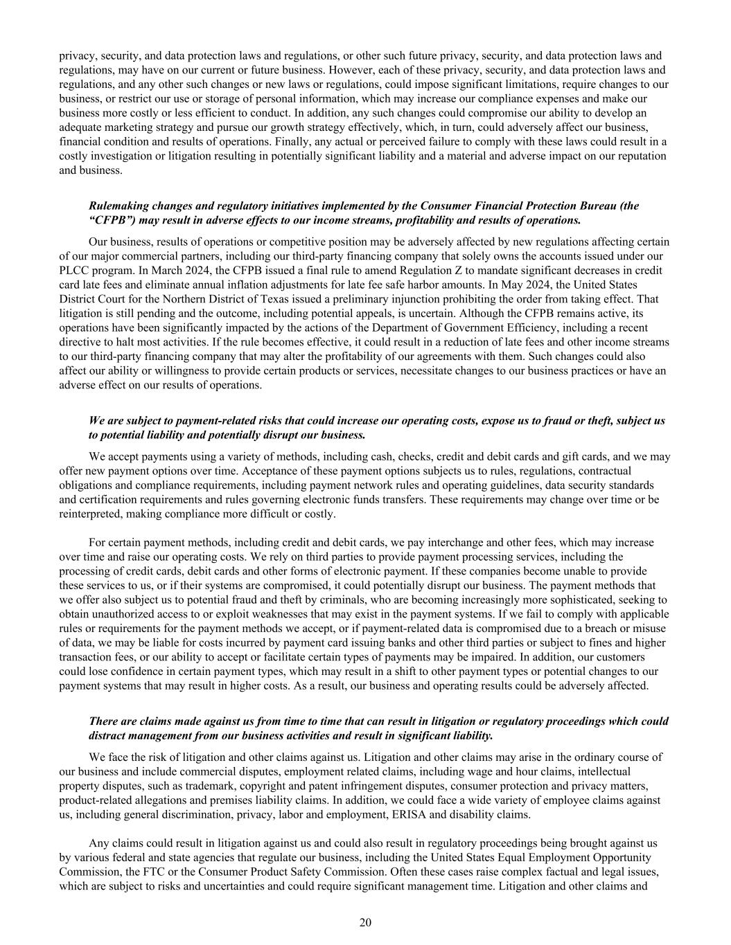 privacy, security, and data protection laws and regulations, or other such future privacy, security, and data protection laws and regulations, may have on our current or future business. However, each of these privacy, security, and data protection laws and regulations, and any other such changes or new laws or regulations, could impose significant limitations, require changes to our business, or restrict our use or storage of personal information, which may increase our compliance expenses and make our business more costly or less efficient to conduct. In addition, any such changes could compromise our ability to develop an adequate marketing strategy and pursue our growth strategy effectively, which, in turn, could adversely affect our business, financial condition and results of operations. Finally, any actual or perceived failure to comply with these laws could result in a costly investigation or litigation resulting in potentially significant liability and a material and adverse impact on our reputation and business. Rulemaking changes and regulatory initiatives implemented by the Consumer Financial Protection Bureau (the “CFPB”) may result in adverse effects to our income streams, profitability and results of operations. Our business, results of operations or competitive position may be adversely affected by new regulations affecting certain of our major commercial partners, including our third-party financing company that solely owns the accounts issued under our PLCC program. In March 2024, the CFPB issued a final rule to amend Regulation Z to mandate significant decreases in credit card late fees and eliminate annual inflation adjustments for late fee safe harbor amounts. In May 2024, the United States District Court for the Northern District of Texas issued a preliminary injunction prohibiting the order from taking effect. That litigation is still pending and the outcome, including potential appeals, is uncertain. Although the CFPB remains active, its operations have been significantly impacted by the actions of the Department of Government Efficiency, including a recent directive to halt most activities. If the rule becomes effective, it could result in a reduction of late fees and other income streams to our third-party financing company that may alter the profitability of our agreements with them. Such changes could also affect our ability or willingness to provide certain products or services, necessitate changes to our business practices or have an adverse effect on our results of operations. We are subject to payment-related risks that could increase our operating costs, expose us to fraud or theft, subject us to potential liability and potentially disrupt our business. We accept payments using a variety of methods, including cash, checks, credit and debit cards and gift cards, and we may offer new payment options over time. Acceptance of these payment options subjects us to rules, regulations, contractual obligations and compliance requirements, including payment network rules and operating guidelines, data security standards and certification requirements and rules governing electronic funds transfers. These requirements may change over time or be reinterpreted, making compliance more difficult or costly. For certain payment methods, including credit and debit cards, we pay interchange and other fees, which may increase over time and raise our operating costs. We rely on third parties to provide payment processing services, including the processing of credit cards, debit cards and other forms of electronic payment. If these companies become unable to provide these services to us, or if their systems are compromised, it could potentially disrupt our business. The payment methods that we offer also subject us to potential fraud and theft by criminals, who are becoming increasingly more sophisticated, seeking to obtain unauthorized access to or exploit weaknesses that may exist in the payment systems. If we fail to comply with applicable rules or requirements for the payment methods we accept, or if payment-related data is compromised due to a breach or misuse of data, we may be liable for costs incurred by payment card issuing banks and other third parties or subject to fines and higher transaction fees, or our ability to accept or facilitate certain types of payments may be impaired. In addition, our customers could lose confidence in certain payment types, which may result in a shift to other payment types or potential changes to our payment systems that may result in higher costs. As a result, our business and operating results could be adversely affected. There are claims made against us from time to time that can result in litigation or regulatory proceedings which could distract management from our business activities and result in significant liability. We face the risk of litigation and other claims against us. Litigation and other claims may arise in the ordinary course of our business and include commercial disputes, employment related claims, including wage and hour claims, intellectual property disputes, such as trademark, copyright and patent infringement disputes, consumer protection and privacy matters, product-related allegations and premises liability claims. In addition, we could face a wide variety of employee claims against us, including general discrimination, privacy, labor and employment, ERISA and disability claims. Any claims could result in litigation against us and could also result in regulatory proceedings being brought against us by various federal and state agencies that regulate our business, including the United States Equal Employment Opportunity Commission, the FTC or the Consumer Product Safety Commission. Often these cases raise complex factual and legal issues, which are subject to risks and uncertainties and could require significant management time. Litigation and other claims and 20